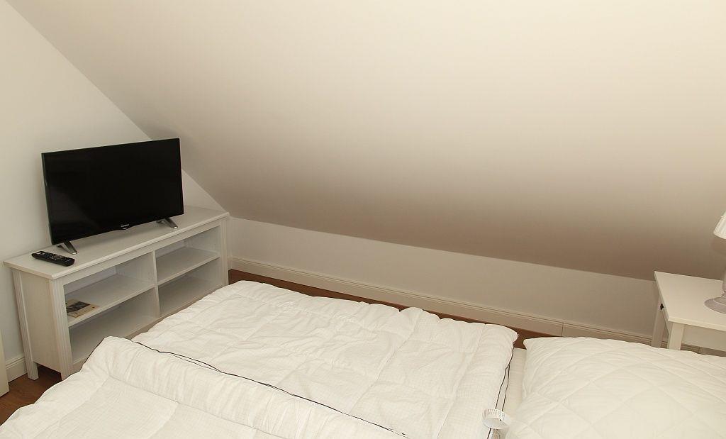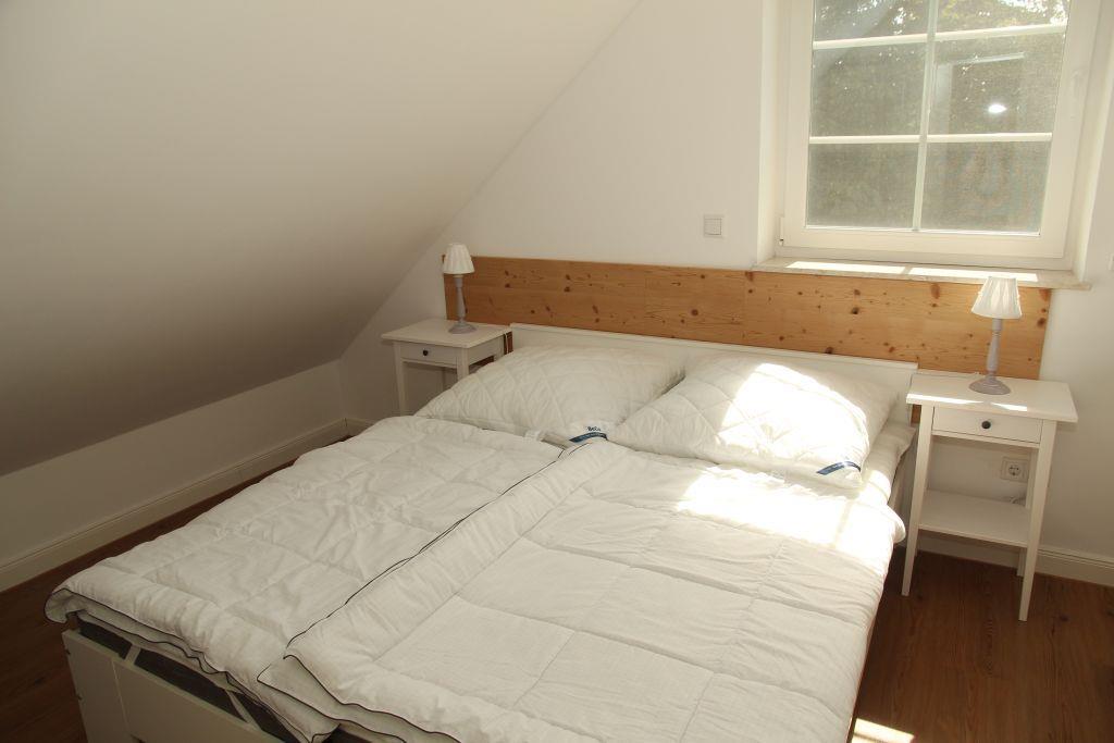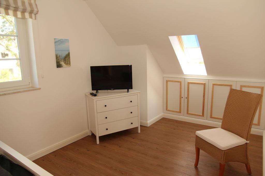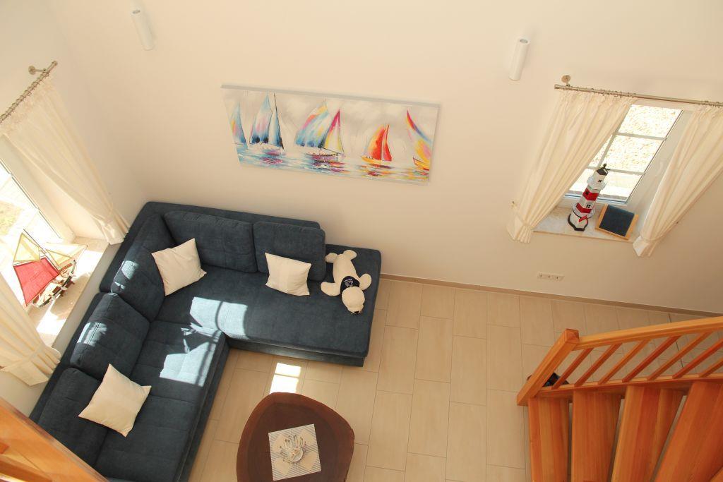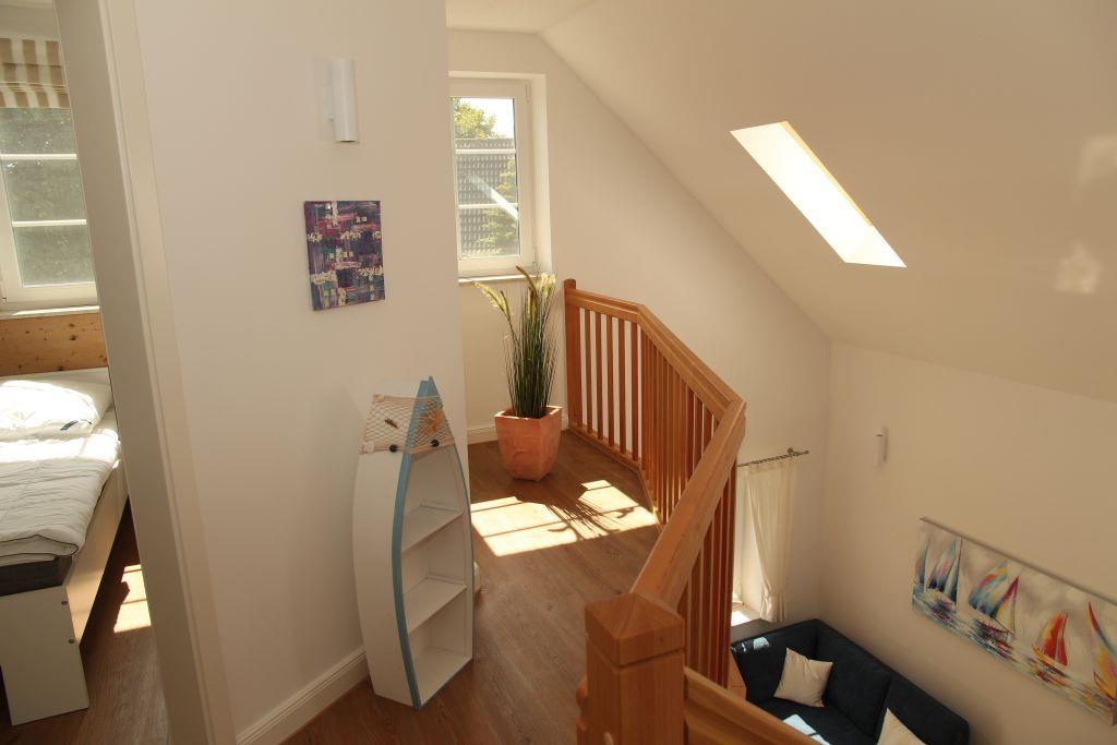 Offene Treppe vom Wohnraum ins Obergeschoss in eine offene Galerie. Von hier geht es in ein kleineres Schlafzimmer mit Doppelbett, Kleiderschrank und Fernseher, ein zweites größeres Schlafzimmer mit Kleiderschrank und Fernseher und in ein kleines Duschbad mit WC und Waschbecken.