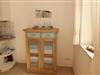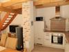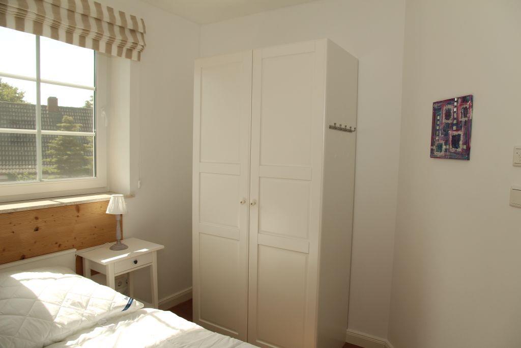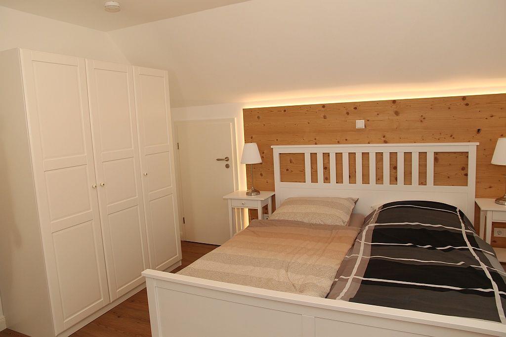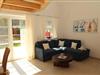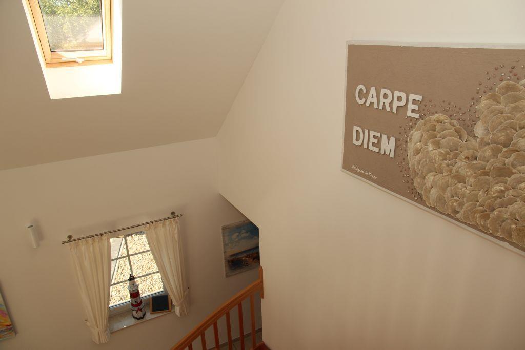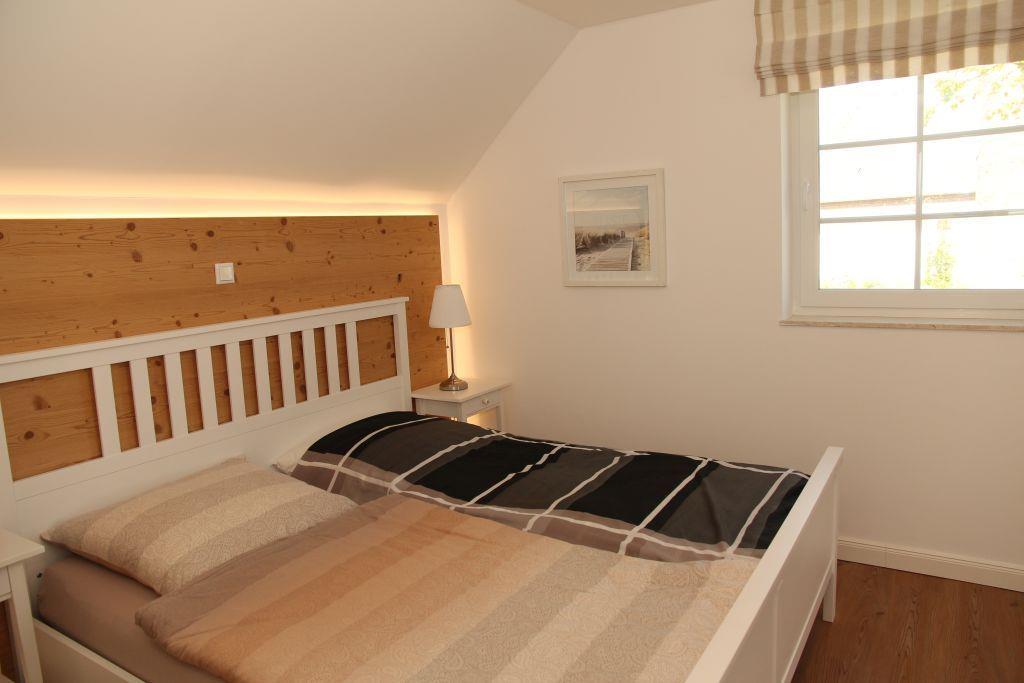 Offene Treppe vom Wohnraum ins Obergeschoss in eine offene Galerie. Von hier geht es in ein kleineres Schlafzimmer mit Doppelbett, Kleiderschrank und Fernseher, ein zweites größeres Schlafzimmer mit Kleiderschrank und Fernseher und in ein kleines Duschbad mit WC und Waschbecken.