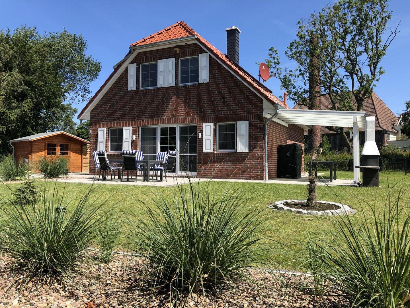 Im Außenbereich finden Sie einen großzügigen Garten, eine überdachte beschattete Terrasse mit einem Strandkorb und eine weitere möblierte Terrasse mit großem Tisch und 6 Stühlen und Grillkamin. Für Ihre Fahrräder steht ein großes Abstellhaus mit Steckdosen zum Aufladen Ihrer E-Bikes und ein Wäscheständer zur Verfügung.