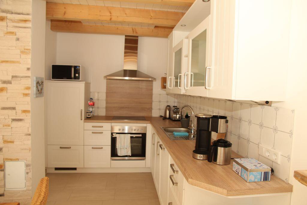 Offener Wohn- und Essbereich mit Sofaecke, Fernseher, Kaminofen und großem Esstisch mit Blick auf den Garten und die Terrasse. Moderne Einbauküche im Landhausstil mit Ceranfeld, Backofen,, Geschirrspülmaschine, Mikrowelle, Wasserkocher, Toaster, Kaffeemaschine, Mixer, Eierkocher und Kühlschrank mit Gefrierfach.