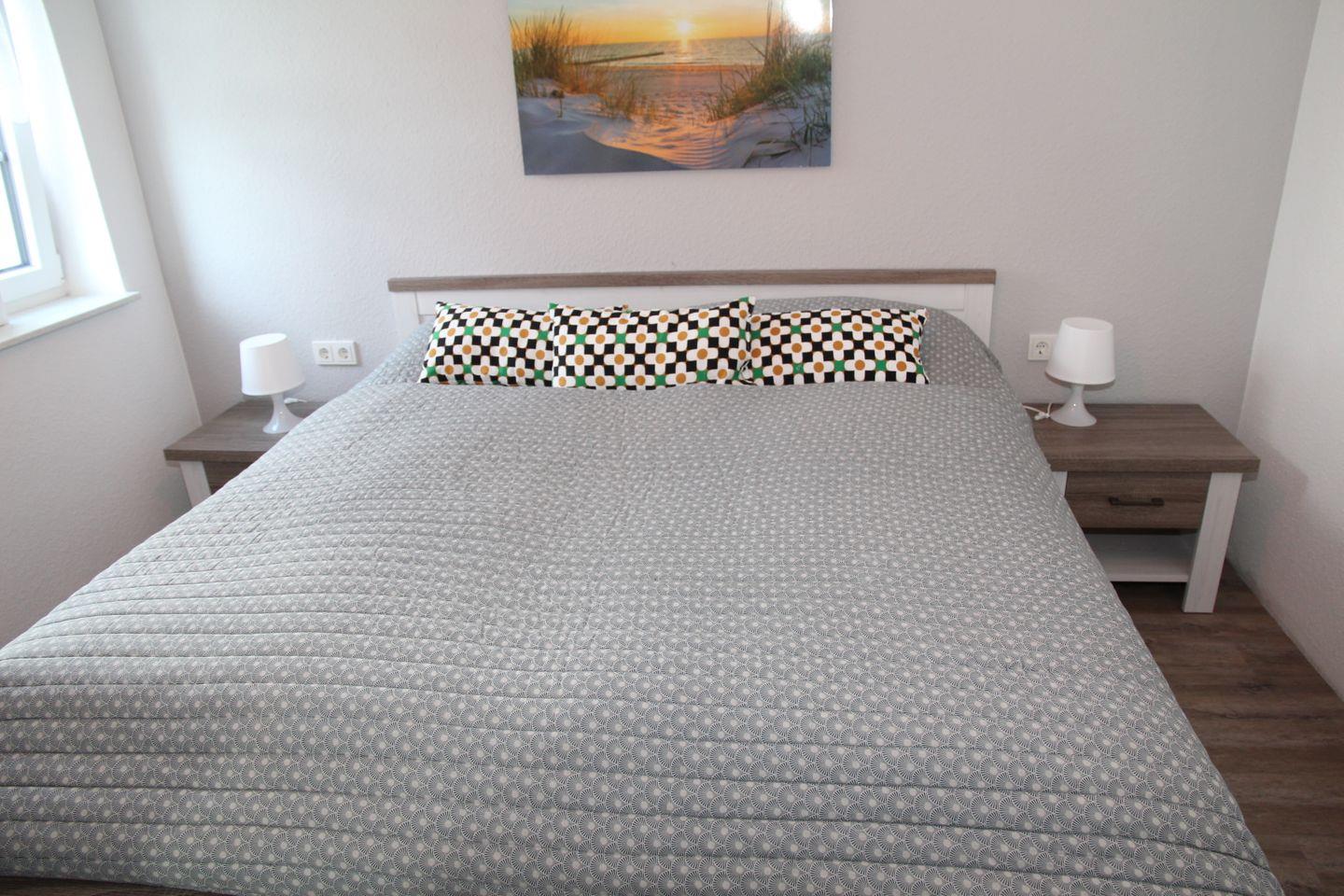 Im Erdgeschoss finden Sie ein großes Badezimmer mit ebenerdiger Dusche. Direkt angrenzend (Bad en Suite) befindet sich das erste Schlafzimmer mit Doppelbett und Kleiderschrank.