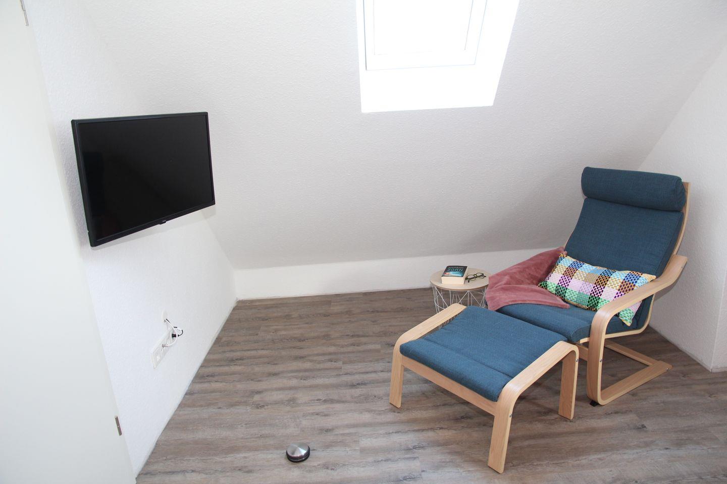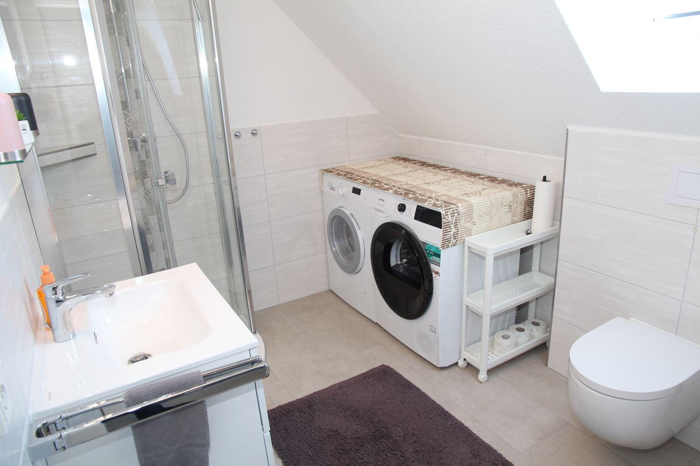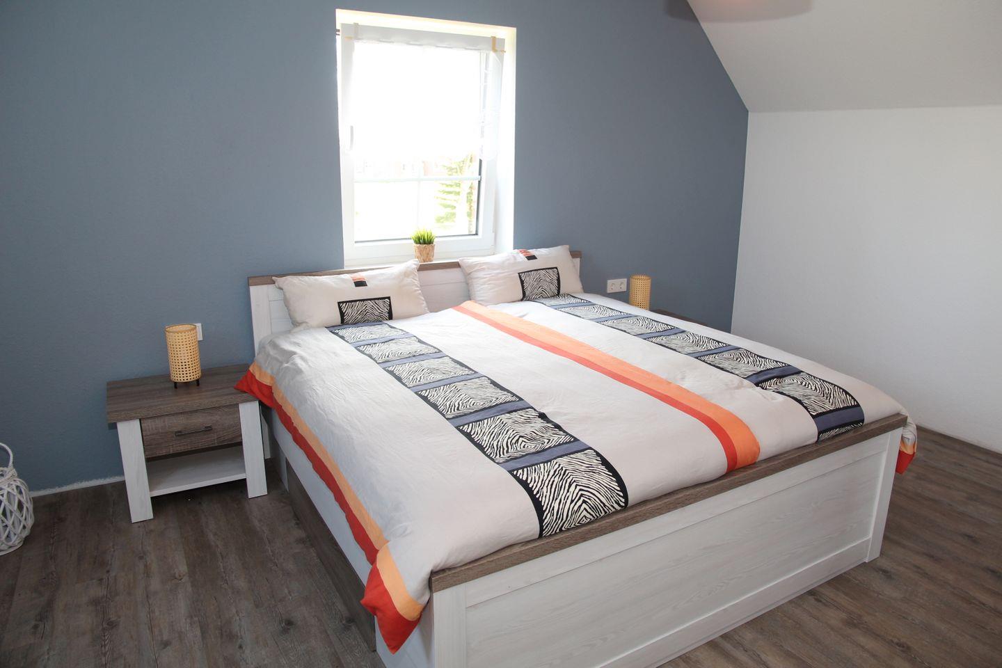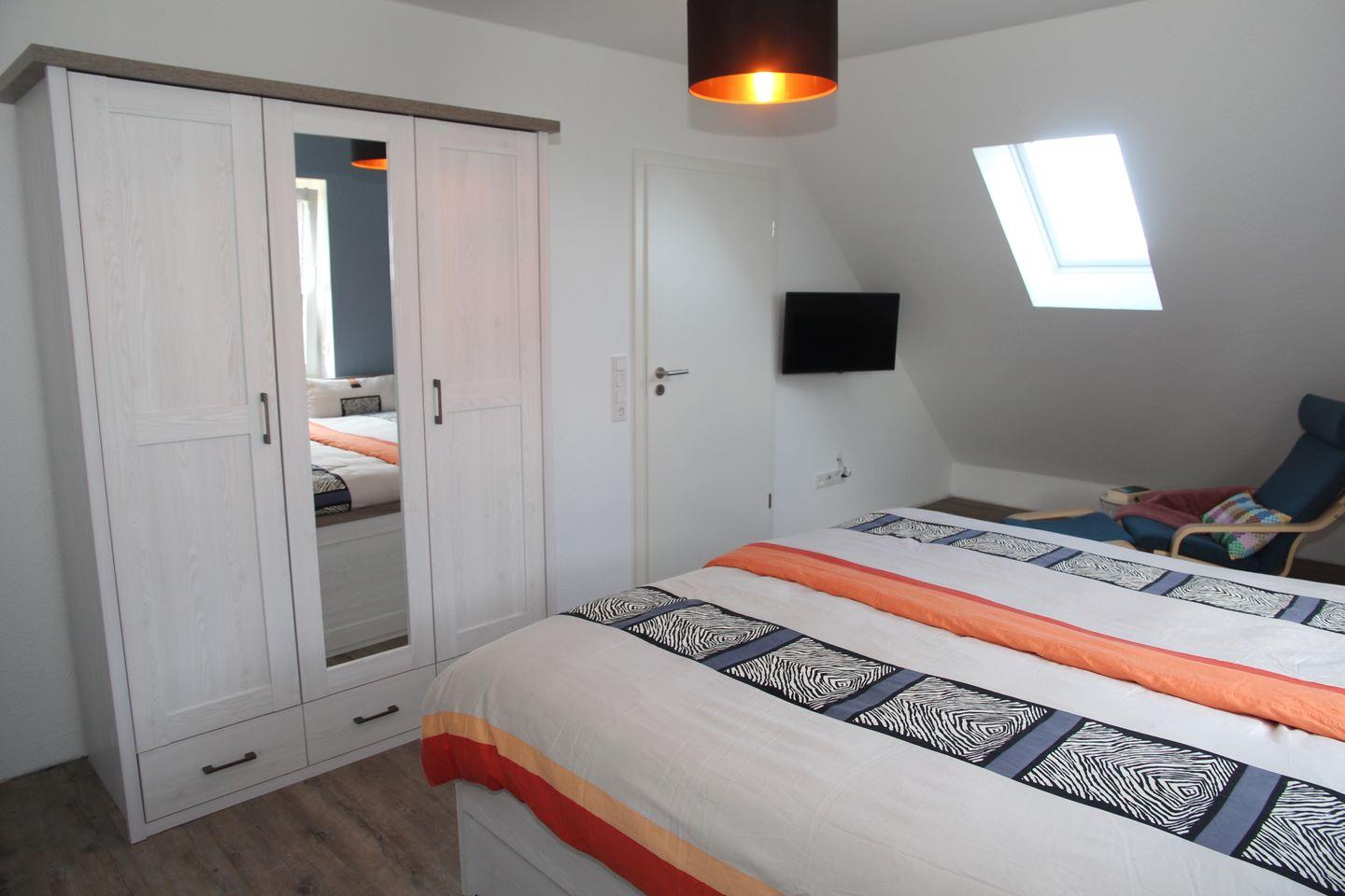 Im Obergeschoss finden Sie zwei weitere Schlafzimmer: Ein Schlafzimmer bietet ein weiteres Doppelbett mit Sessel, Kleiderschrank und Flachbildfernseher, in dem anderen Zimmer finden Sie zwei Einzelbetten und eine Kommode. Auch im Obergeschoss befindet sich noch ein Badezimmer mit ebenerdiger Dusche, Waschmaschine und Trockner. Aus den Dachfenstern im Obergeschoss hat man einen schönen Blick auf den Deich!