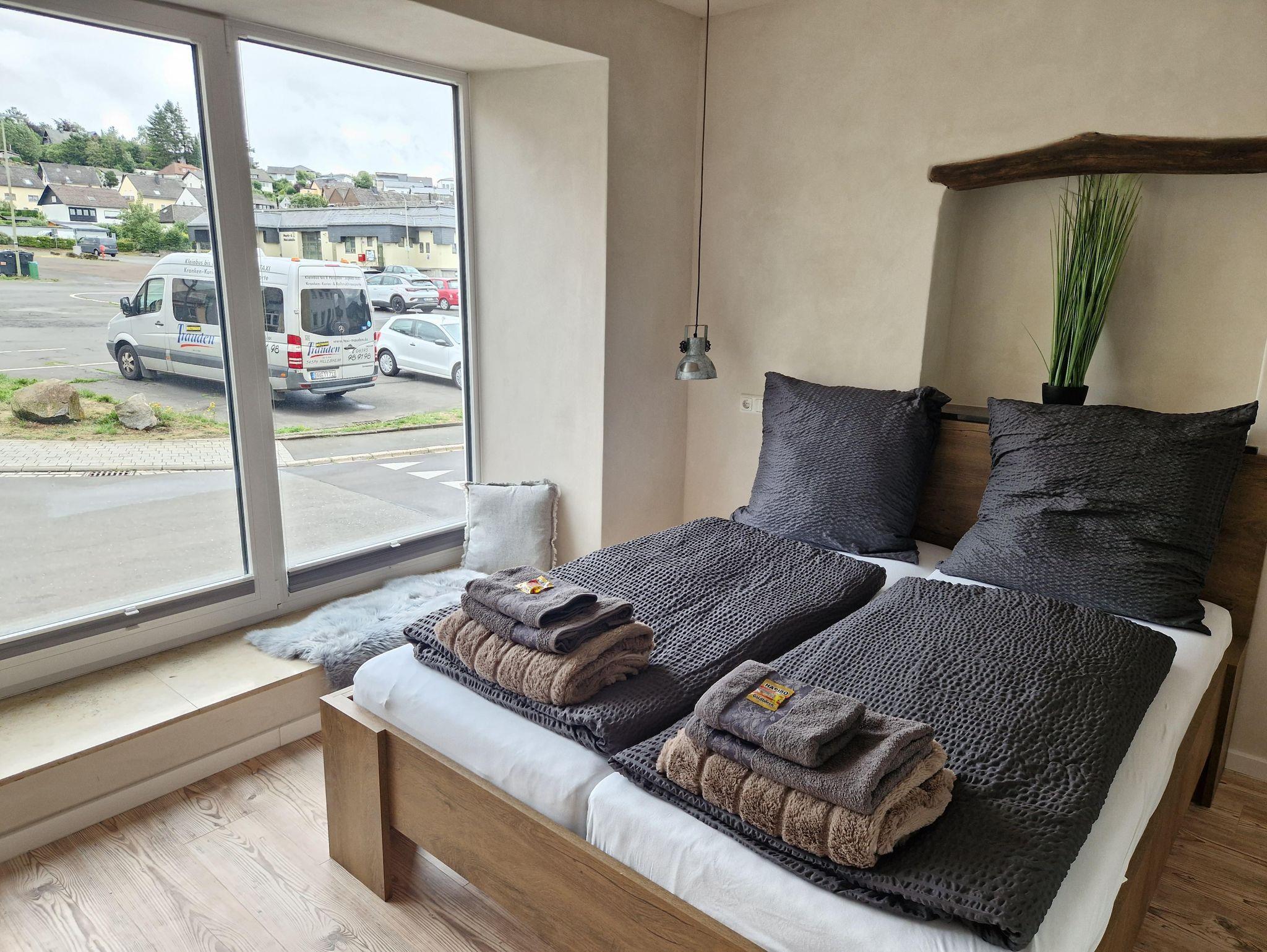 Zwei traumhaft schöne Appartments, zum Viehmarkt gelegen, laden Sie ein, Urlaub im reizvollen, charmanten Krimistädtchen Hillesheim zu machen. Auf ca 14m² Wohnfläche (über eine Treppe zu erreichen) finden Sie alles, was Sie für einen Urlaub oder Kurztrip benötigen. Beide Appartments sind ausgestattet mit einem Doppelbett, TV, WLAN, einer kleinen Küchenkombination mit 2 Herdplatten, Spüle, Wasserkocher, Kühlschrank sowie einer Mikrowelle. Am Tisch können Sie bequem Ihr selbst zubereitetes Frühstück einnehmen. Außerdem lassen sich auf dem geräumigen Tisch Brettspiele spielen oder auch Bürotätigkeiten erledigen- daher sind die Appartements auch hervorragend für Geschäftsreisende geeignet. Die Badezeile ist zweckmäßig mit einer Dusche, Waschbecken, WC und einem Fön + Duschbad bestückt. Vor dem Haus befinden sich auch kleine, in Bambus eingebettete Sitzkombinationen, aus welchen Sie, mit einer Tasse Kaffee oder einem Glas Wein, das Treiben auf der Straße beobachten können. Für die Zeit des Aufenthaltes stellen wir Ihnen 1 Badehandtuch, 1 Handtuch sowie 1 Gästehandtuch zur Verfügung. Ebenso stehen 1 Flasche Wasser p.Person, eine kleine Auswahl an unterschiedlichsten Teesorten sowie das erste Pulver für den Willkommenskaffee bei Ankunft, für Sie bereit.