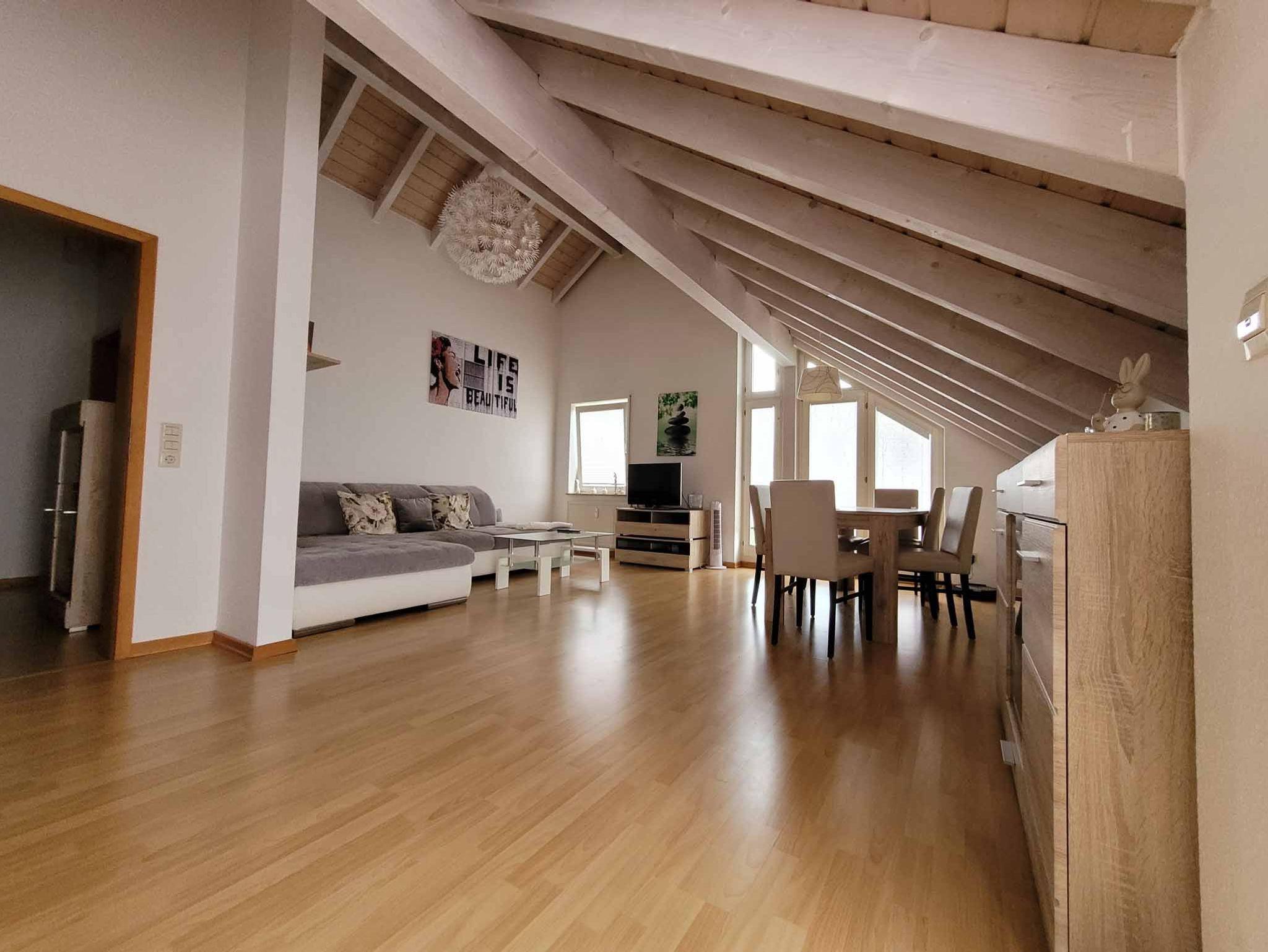 Die Ferienwohnung Hegau in Hilzingen bietet eine helle und gemütliche Unterkunft mit einem großen Balkon und kostenfreiem WLAN. Durch die hohe Dachschräge ist die Wohnung lichtdurchflutet und lädt ein zum verweilen.