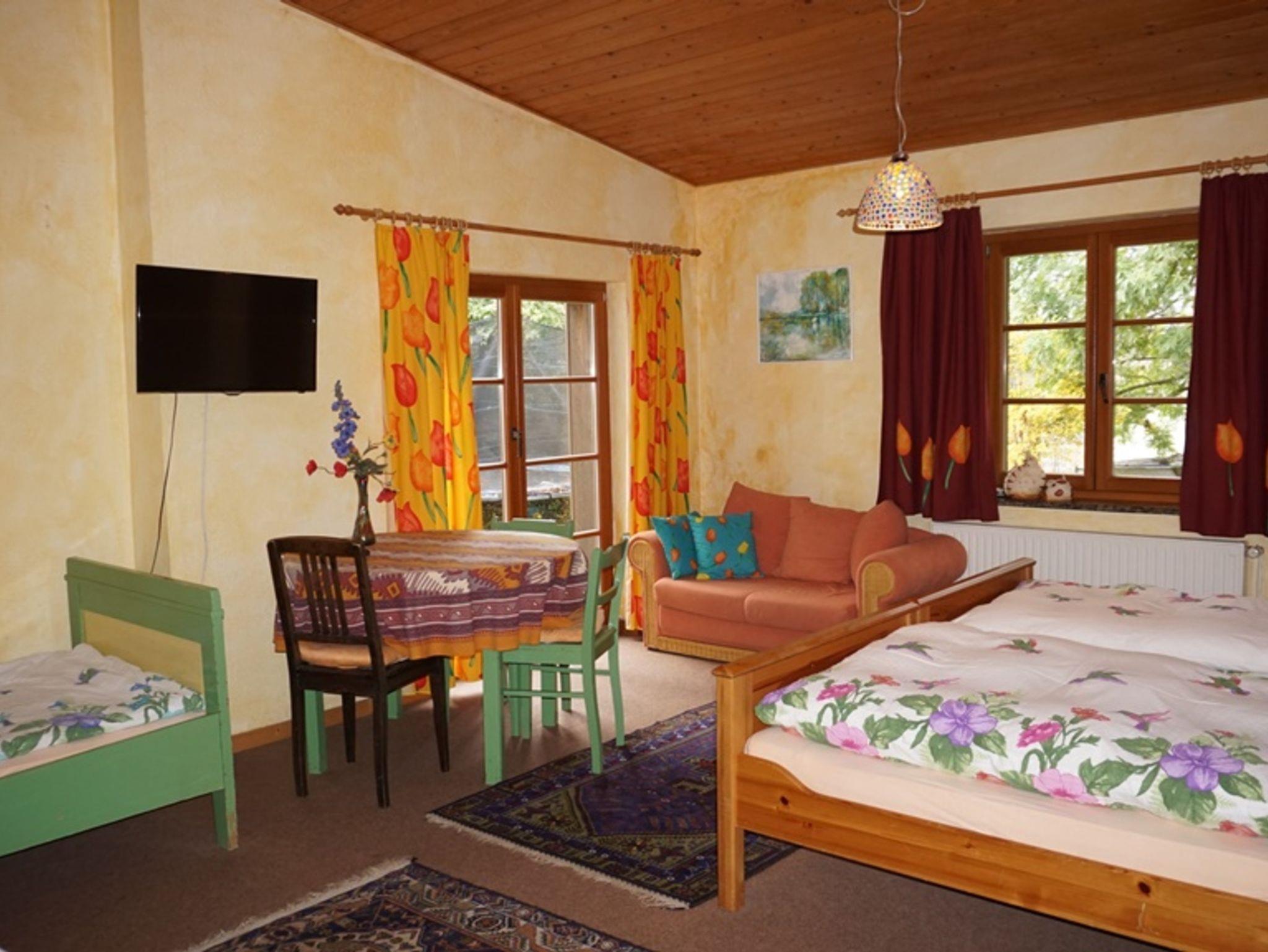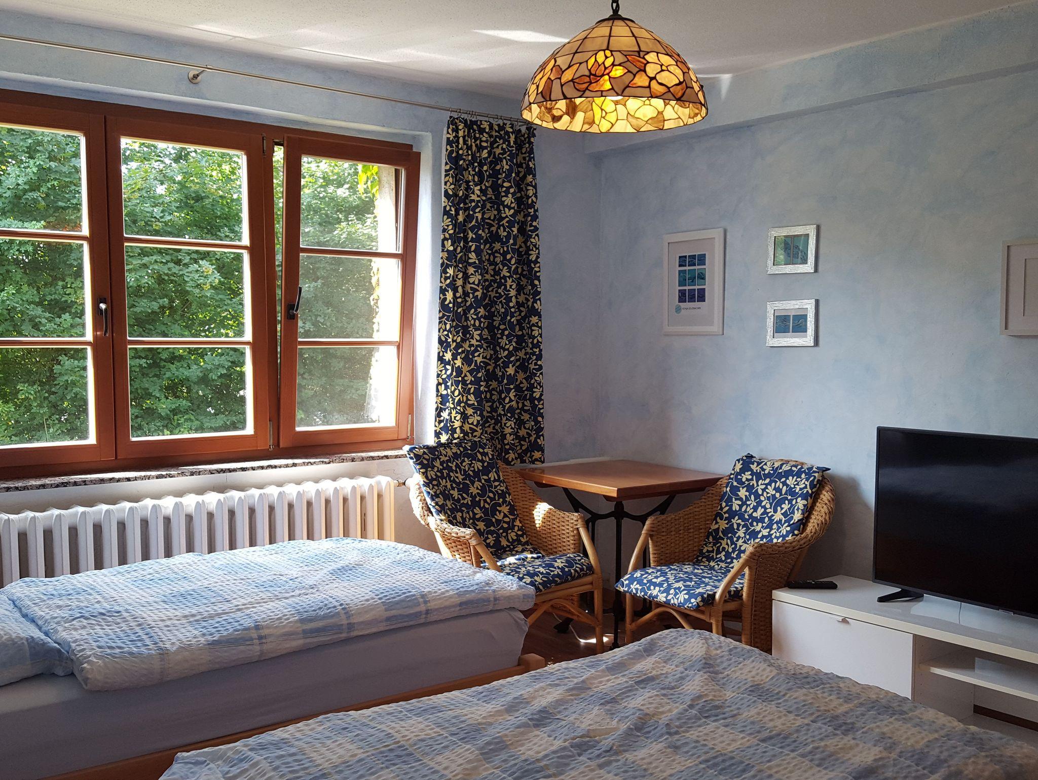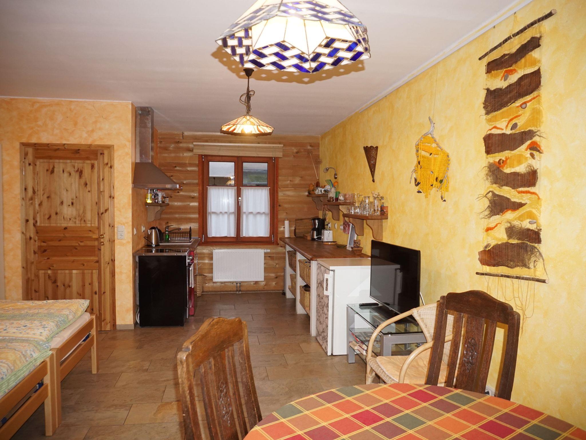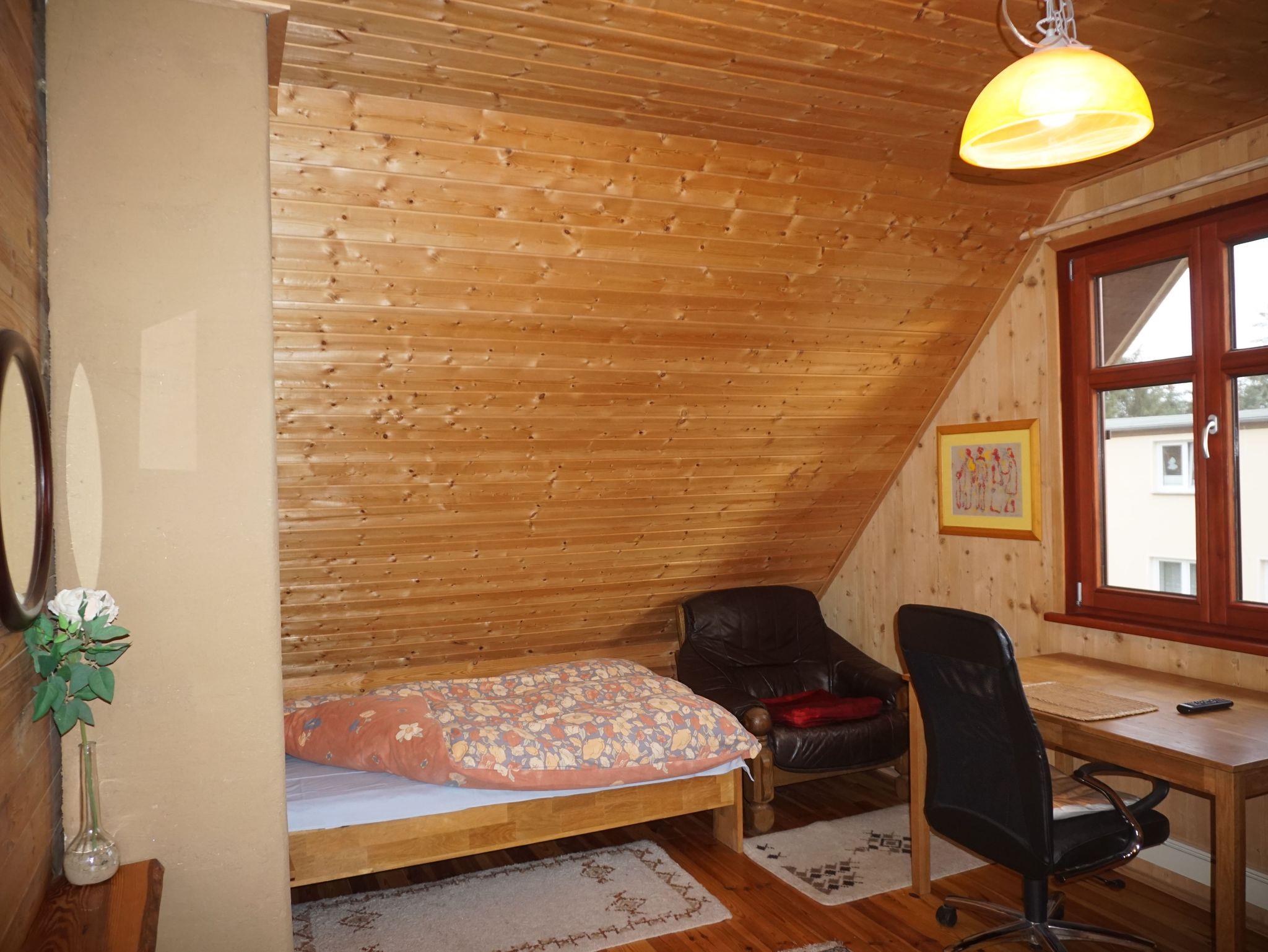 Das Zimmer befindet sich im Kleinen Steinhaus (Baujahr 1995, Komplettsanierung 2022) und ist individuell mit Holzmöbeln gestaltet. Das Fenster und die Glastür geben Ausblick auf den Garten. Es ist ausgestattet mit TV, Kühlschrank, Bettwäsche und Handtüchern. Im Haus befinden sich zwei weitere Zimmer, eine Küche und zwei Bäder; (werden mit den Gästen aus den anderen Zimmern gegebenenfalls gemeinsam genutzt). Ein Reisekinderbett (10,- €) und ein Kinderhochstuhl (3,- €) werden Ihnen auf Anfrage zur Verfügung gestellt. Das stabile Schlafsofa kann von zwei Kindern oder weiteren zwei erwachsenen Personen genutzt werden. Die beiden Einzelbetten können nebeneinander oder getrennt stehen.