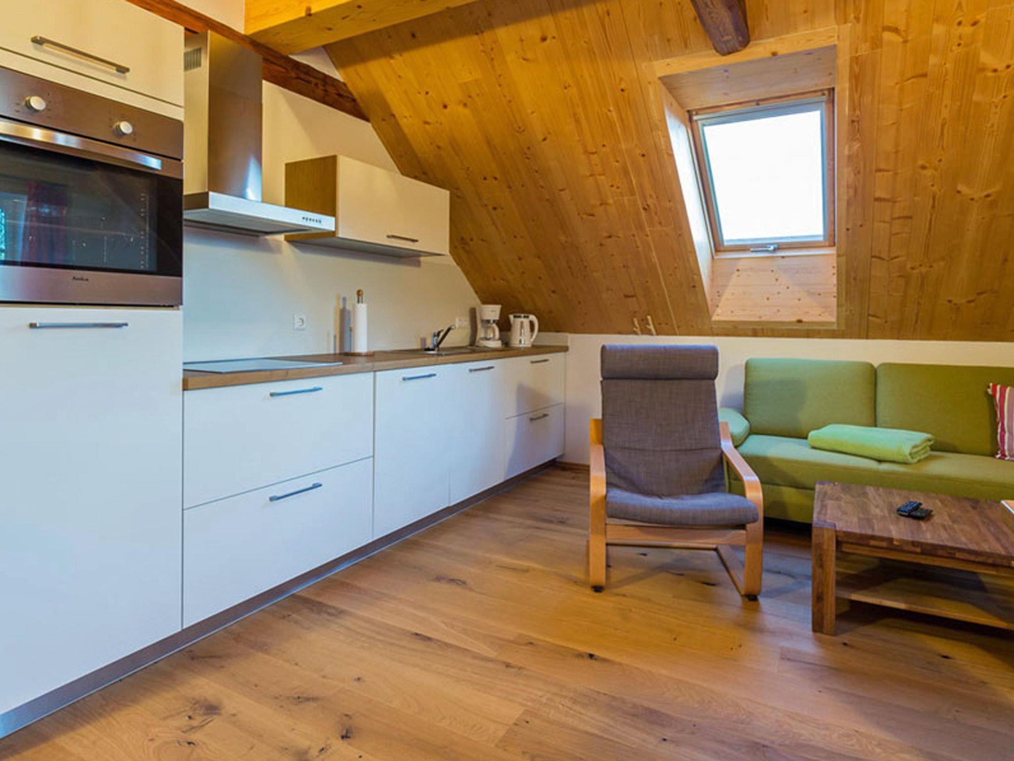Der Wohnbereich verfügt über eine voll ausgestattete Küche mit Geschirrspüler, großem Esstisch, komfortable Sitzecke mit Schlafcouch und Flat-TV. Das Tageslicht-Badezimmer verfügt über Dusche und WC. Der West-Balkon ist über den Wohnbereich erreichbar. Kostenfreies WLAN steht zur Verfügung.