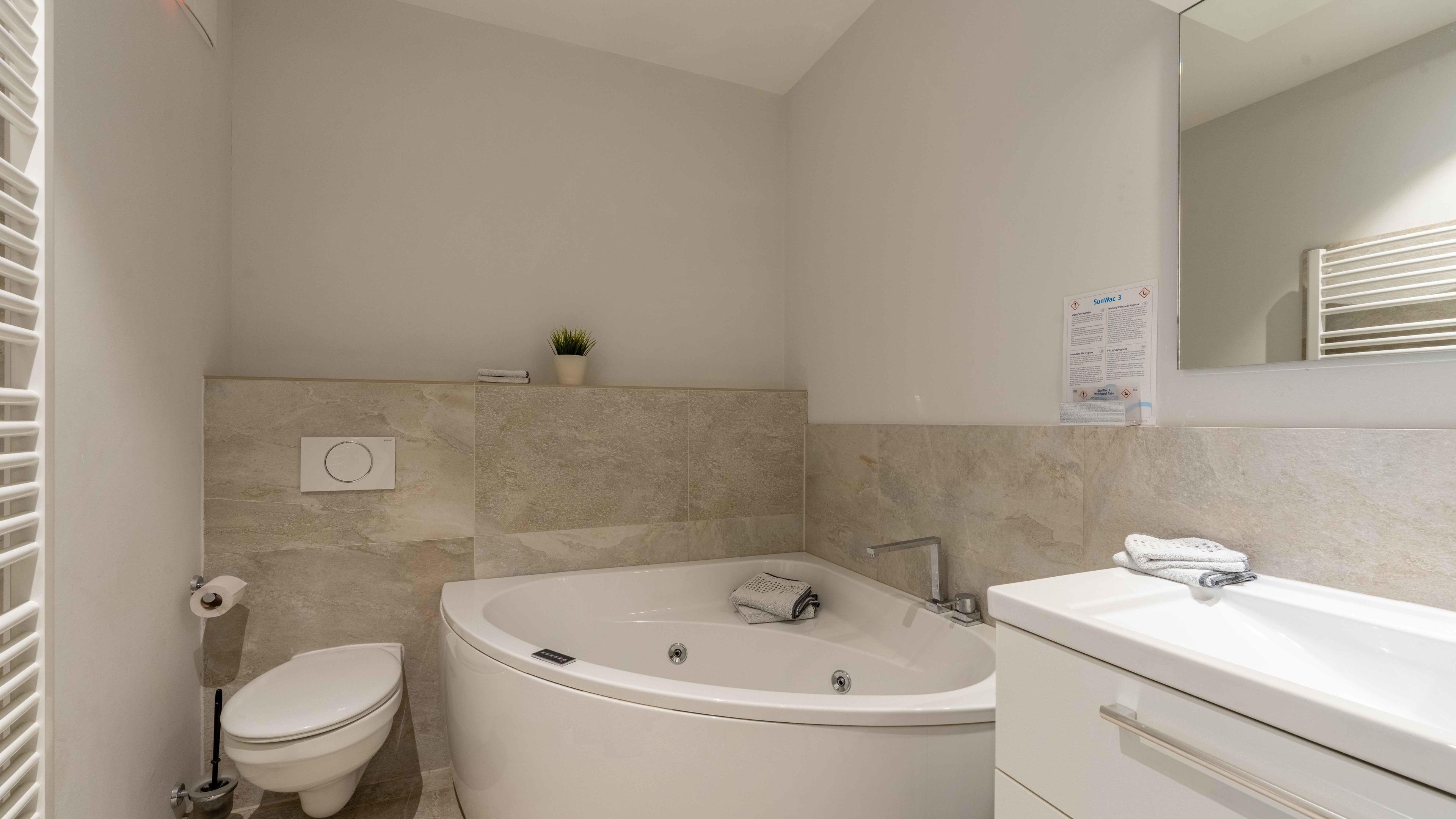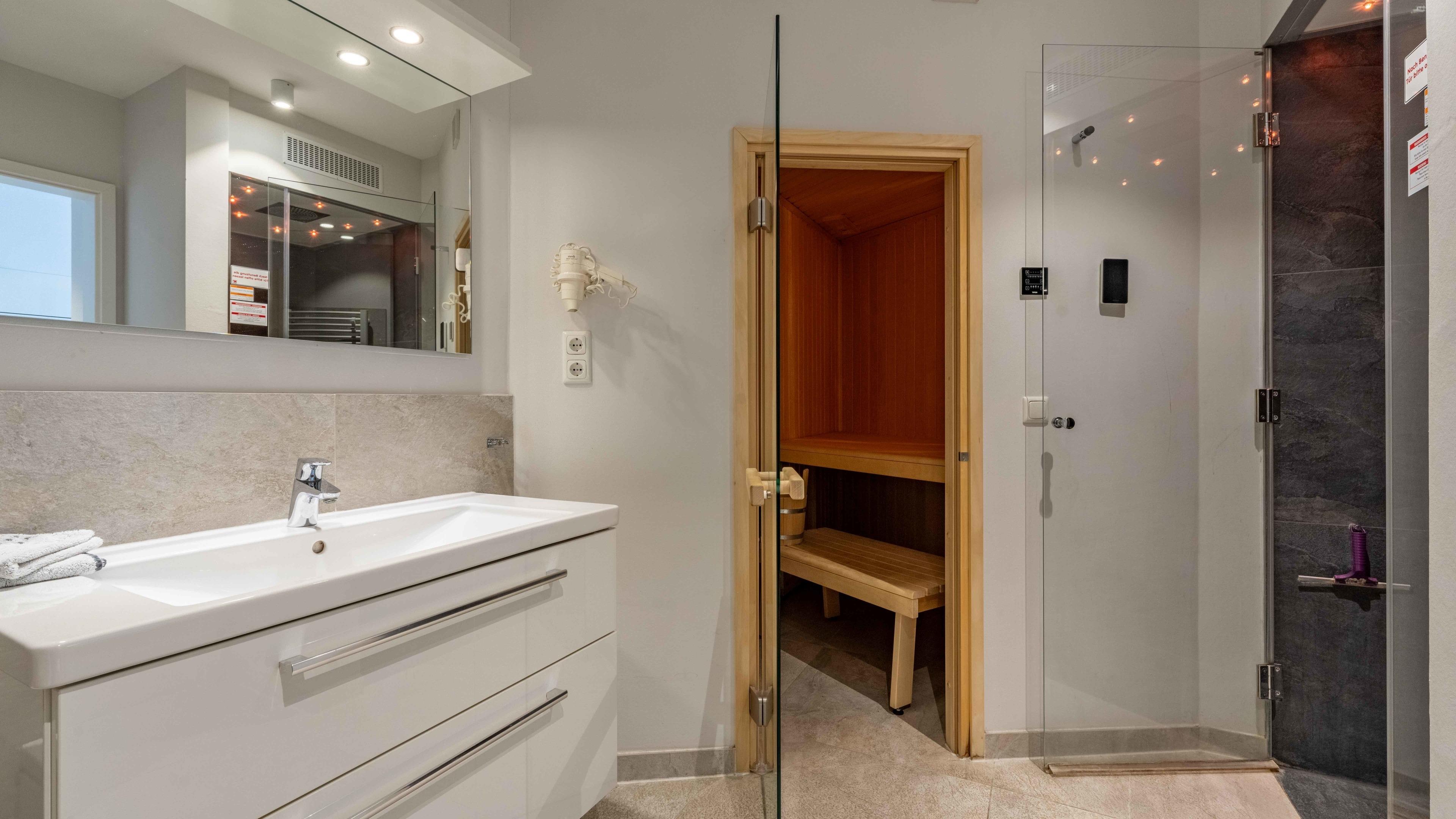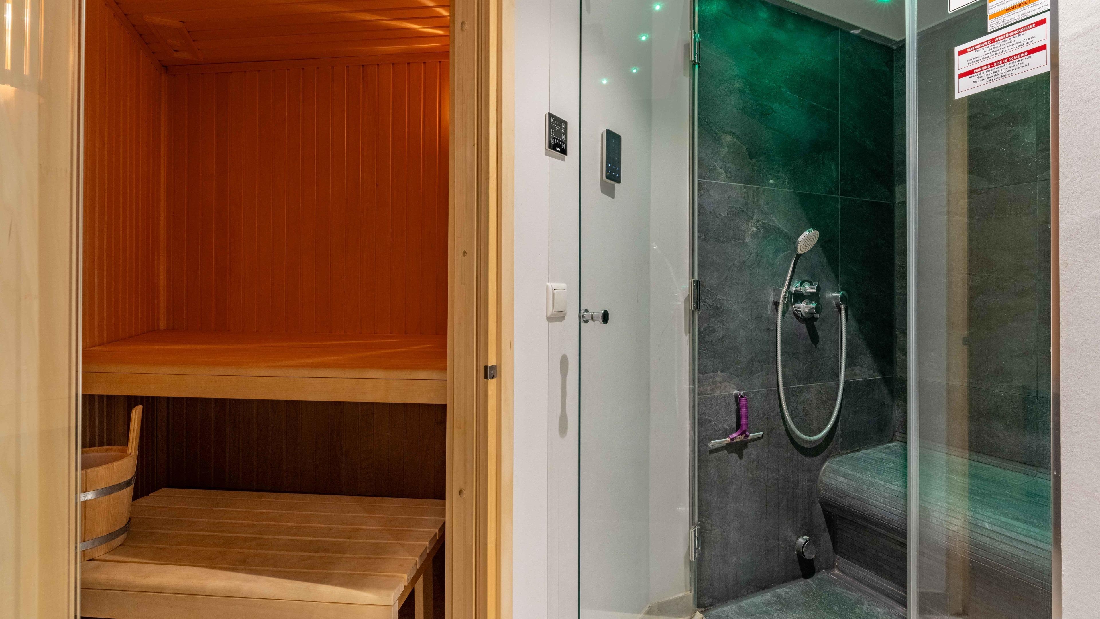 Die Wohnung ist stilvoll, hochwertig und modern eingerichtet. Ein besonderes Highlight ist ihr persönlicher Wellnessbereich mit Sauna, Whirlpool und Dampfbad mit integrierter Doppel-