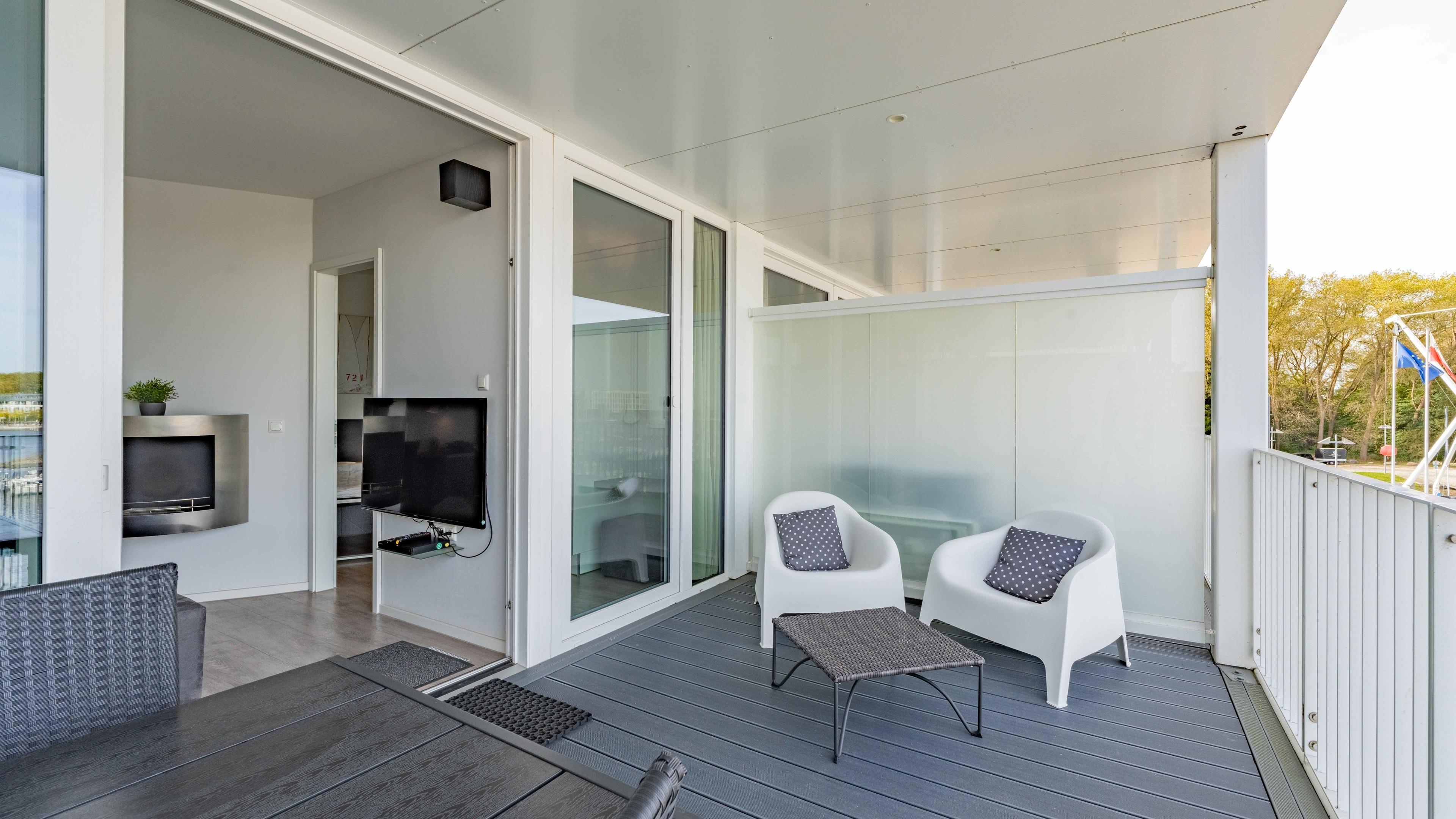 Regendusche. Im Wohnbereich sorgen am Abend die Flammen des Bioethanolkamins für eine gemütliche Atmosphäre, ebenso wie die vorbeifahrenden großen Schiffe mit ihrer eindrucksvollen nächtlichen Beleuchtung.