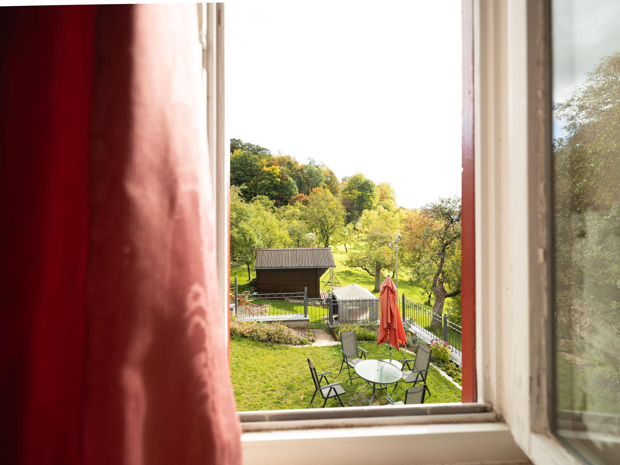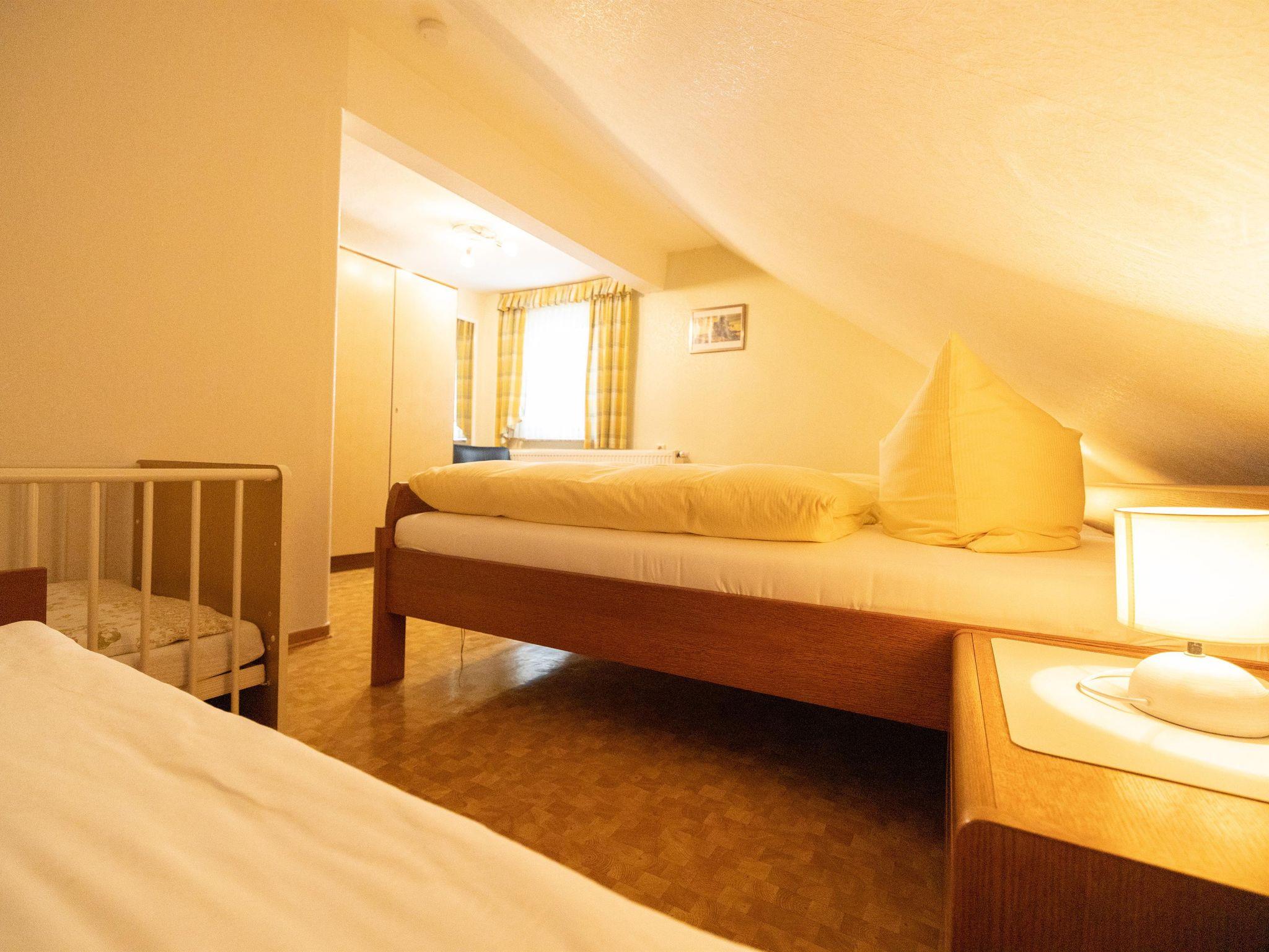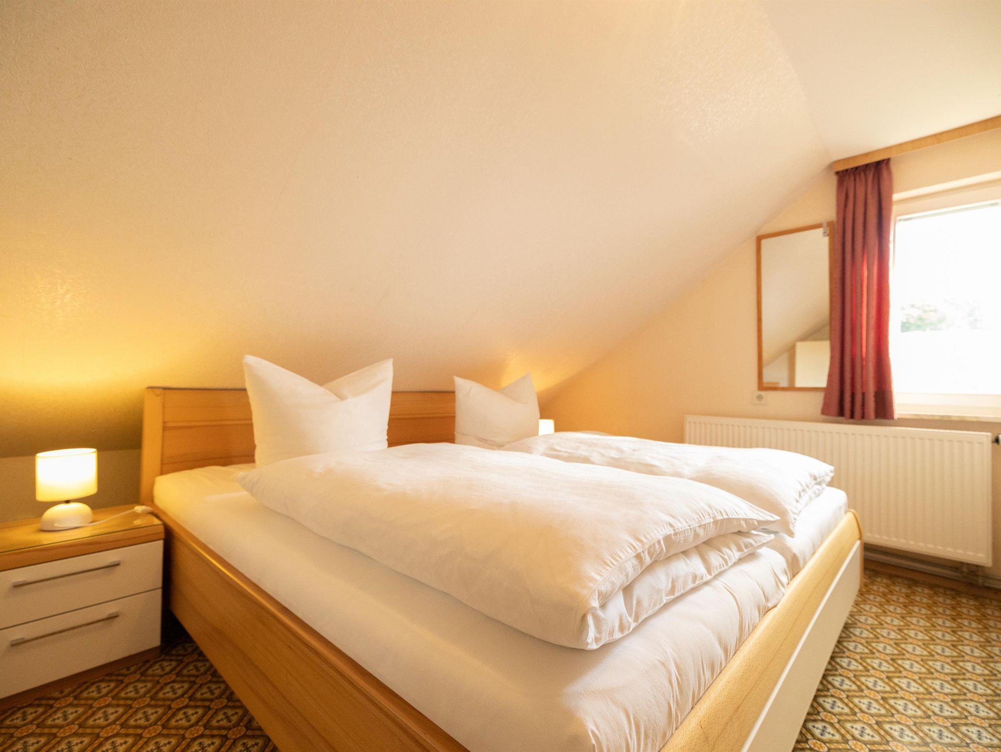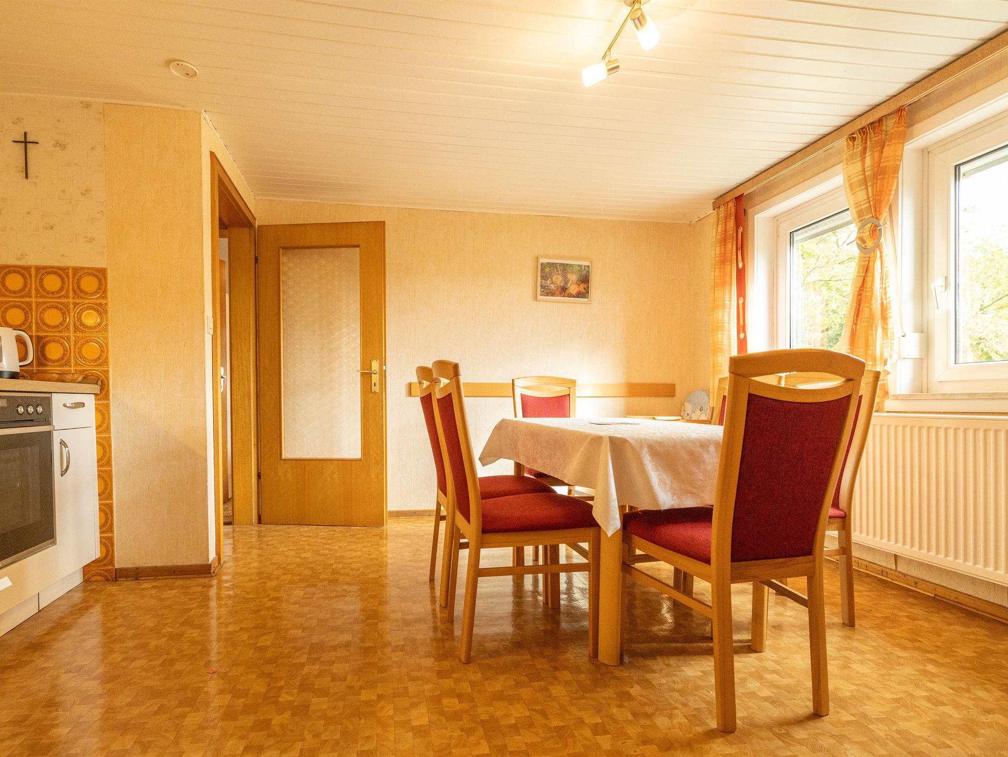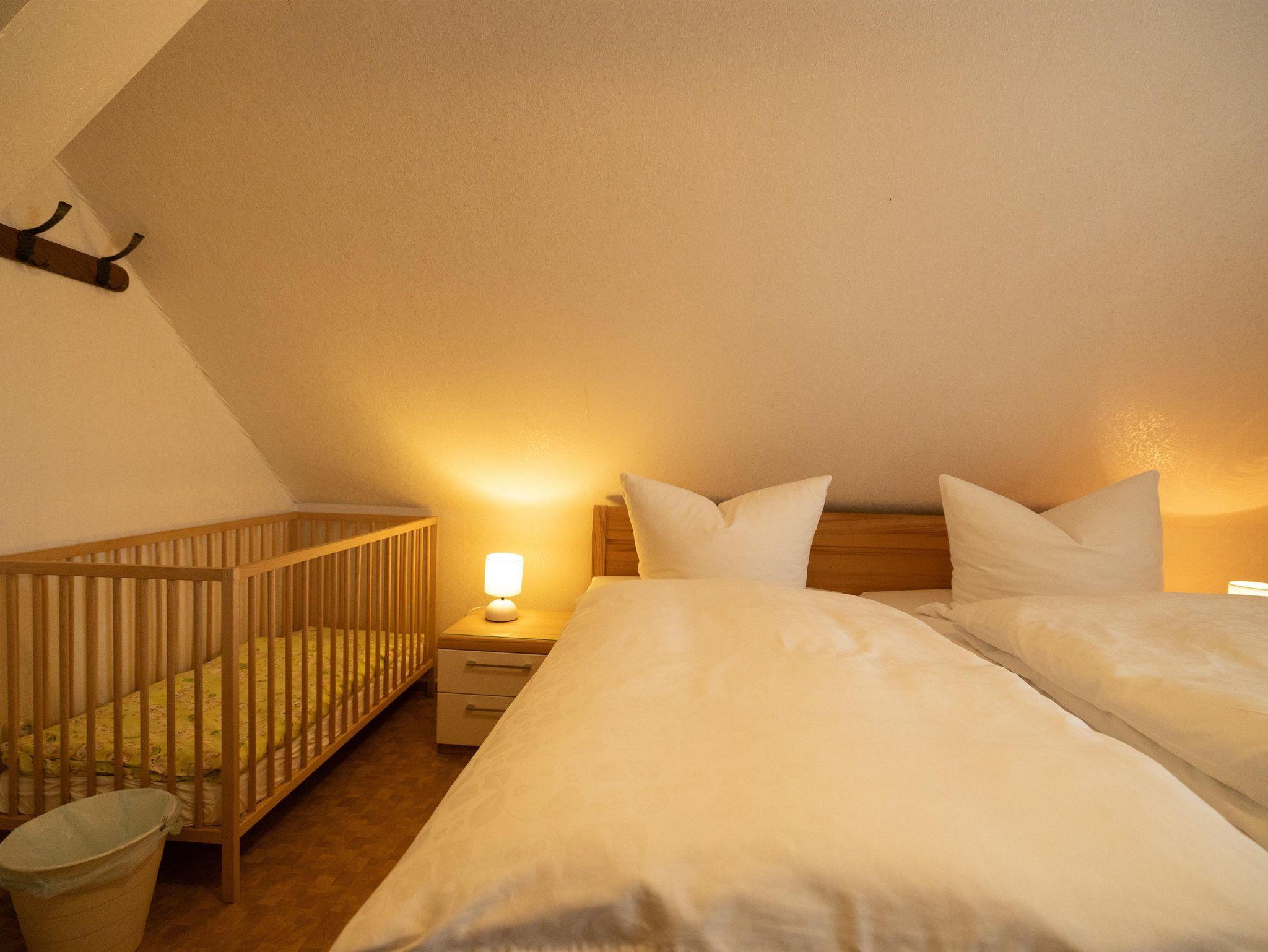 Großzügige 70 m² große Ferienwohnung im ersten Obergeschoss des Fachwerkferienhauses – ideal für Familien bis sechs Personen. Die Wohnung verfügt über vier Zimmer, Küche und Bad. Drei Schlafzimmer mit jeweils einem Doppelbett sowie zwei Kinderbetten bieten ausreichend Platz für Eltern und Kinder. Die Wohnküche mit Esstisch, Couch und Flat-TV ist komplett ausgestattet. Dort finden Sie Kaffeemaschine, Toaster, Wasserkocher, Haarfön und Kinderstuhl. Das Badezimmer umfasst Duschkabine, Waschbecken und WC. Bettwäsche, Geschirr- und Handtücher, WLAN und Endreinigung sind inklusive.