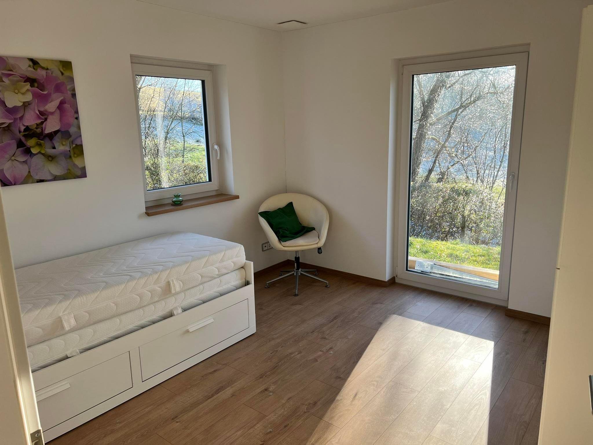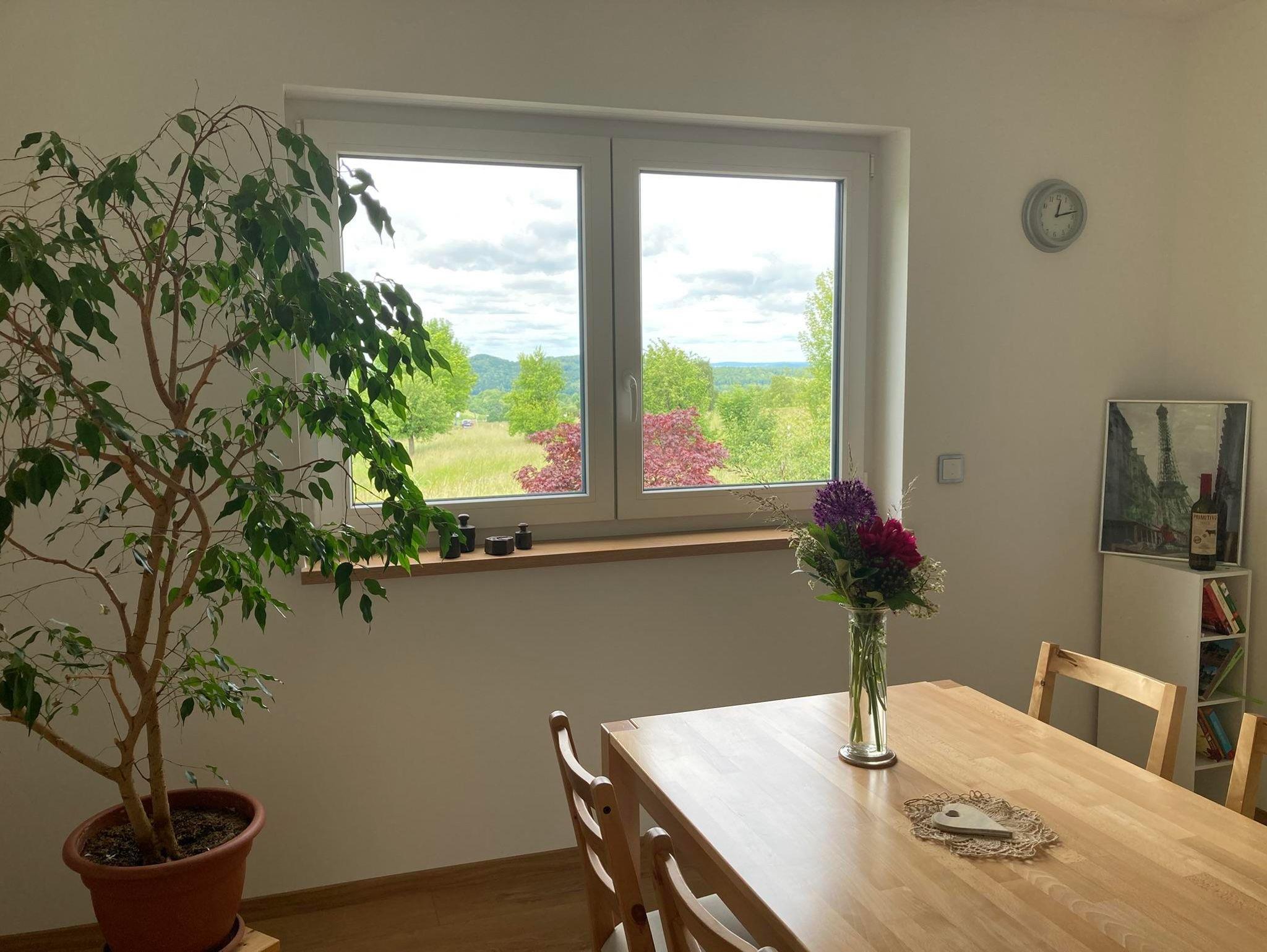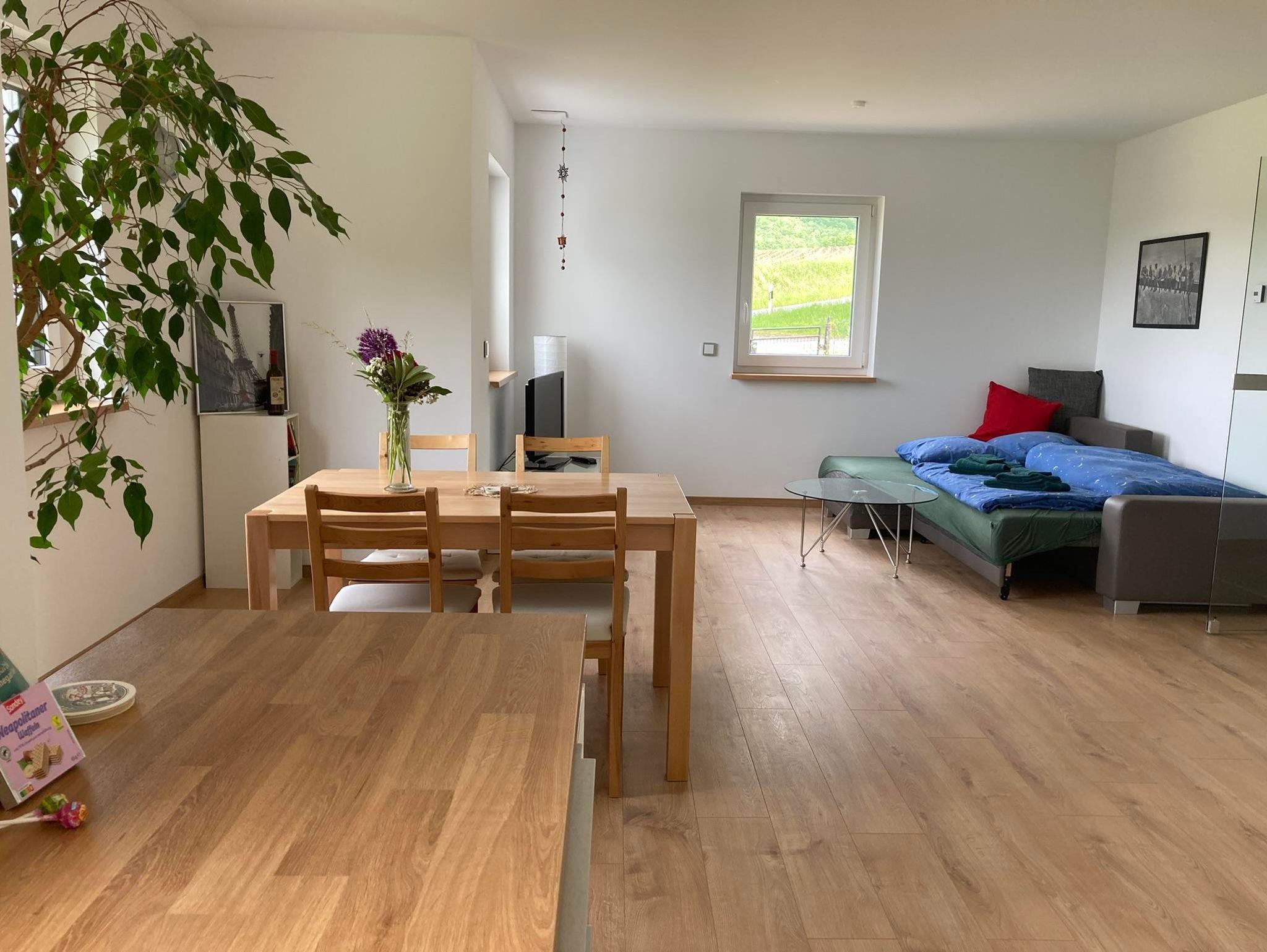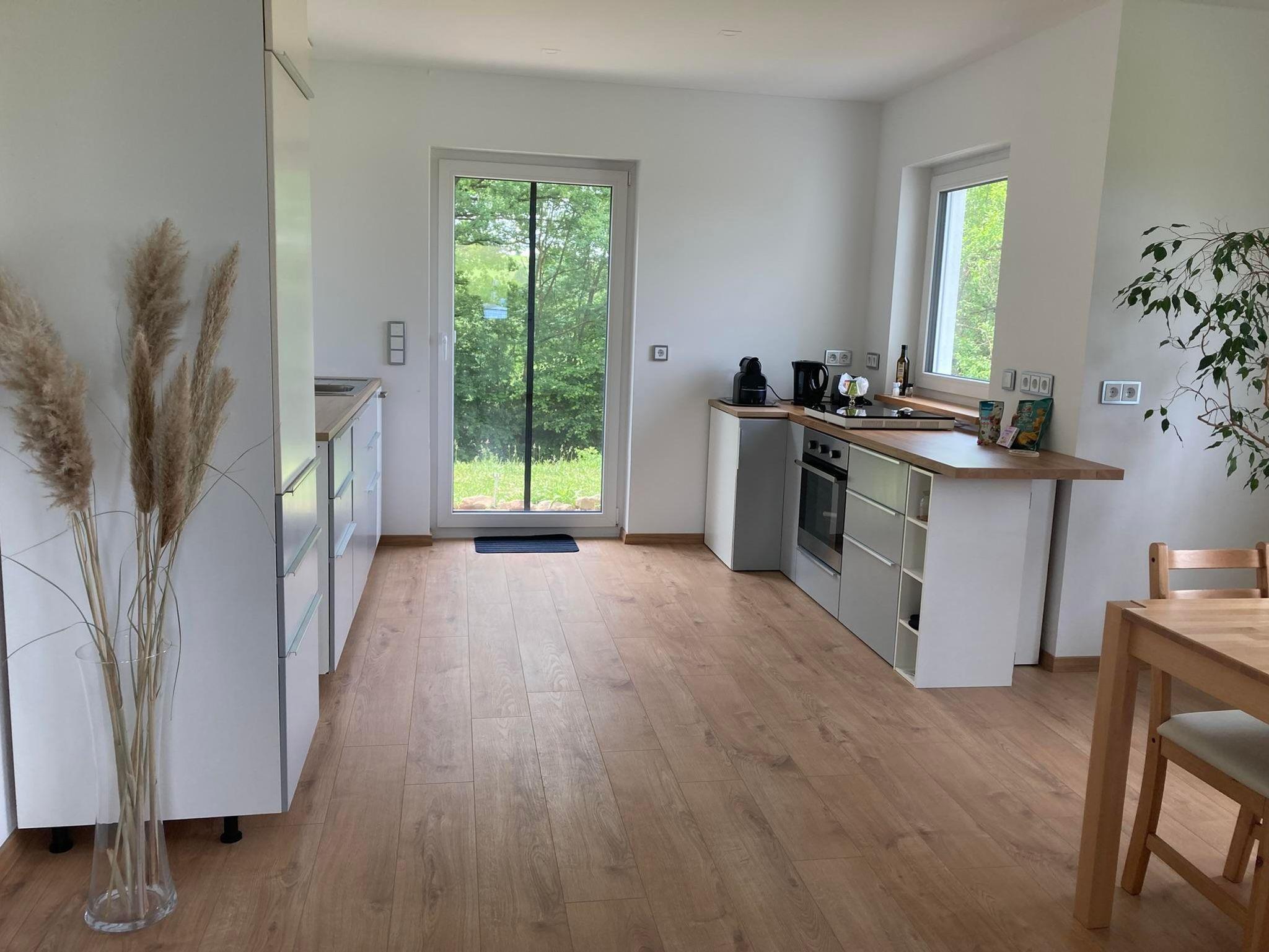 Über einen eigenen Eingang gelangen Sie in einen großzügigen Flur, der in den einladenden Wohn- und Essbereich mit offener Küche führt. Genießen Sie den atemberaubenden Blick auf das malerische Schloss Bieberstein. Das gemütliche Sofa lässt sich in eine Doppelschlafcouch verwandeln.