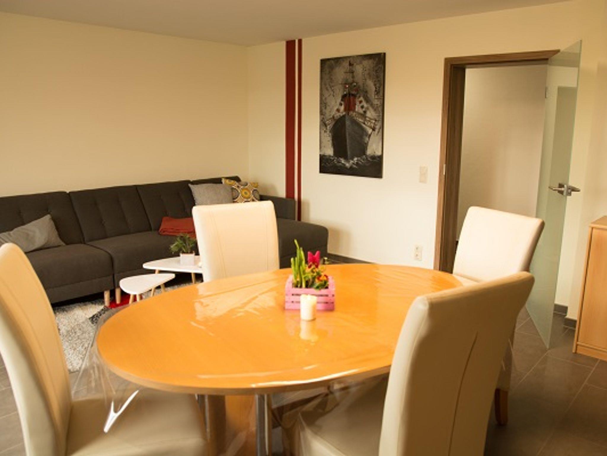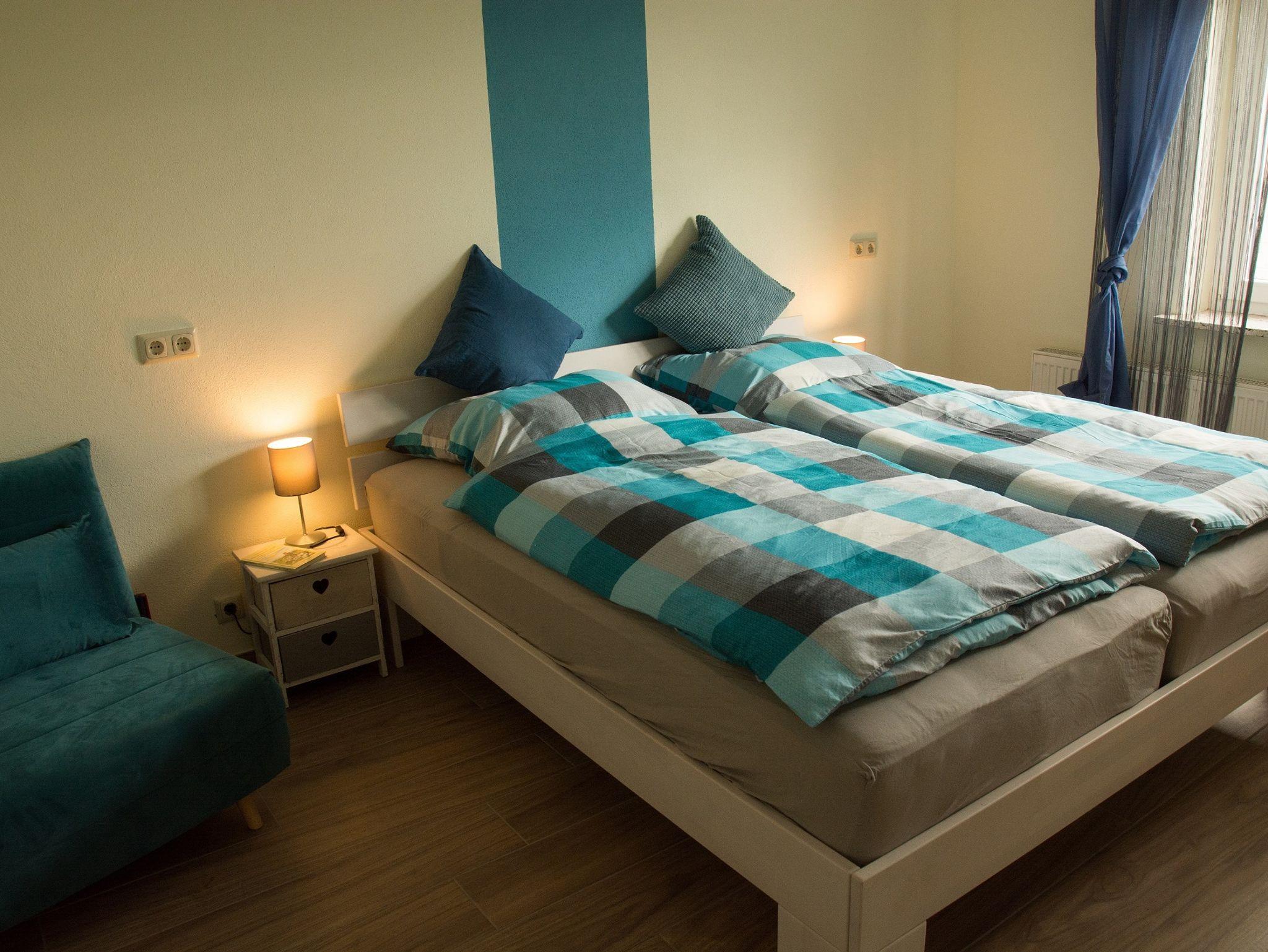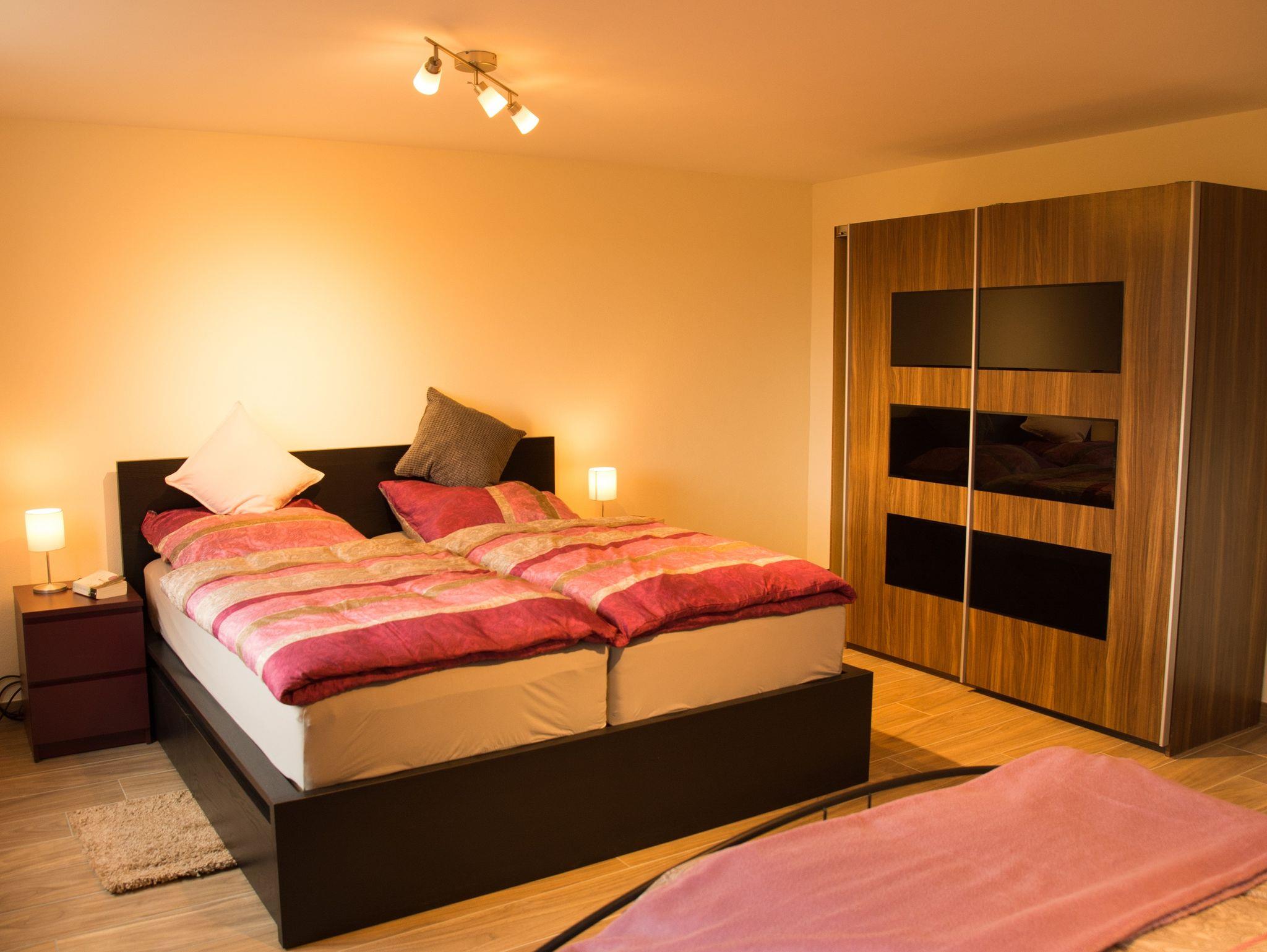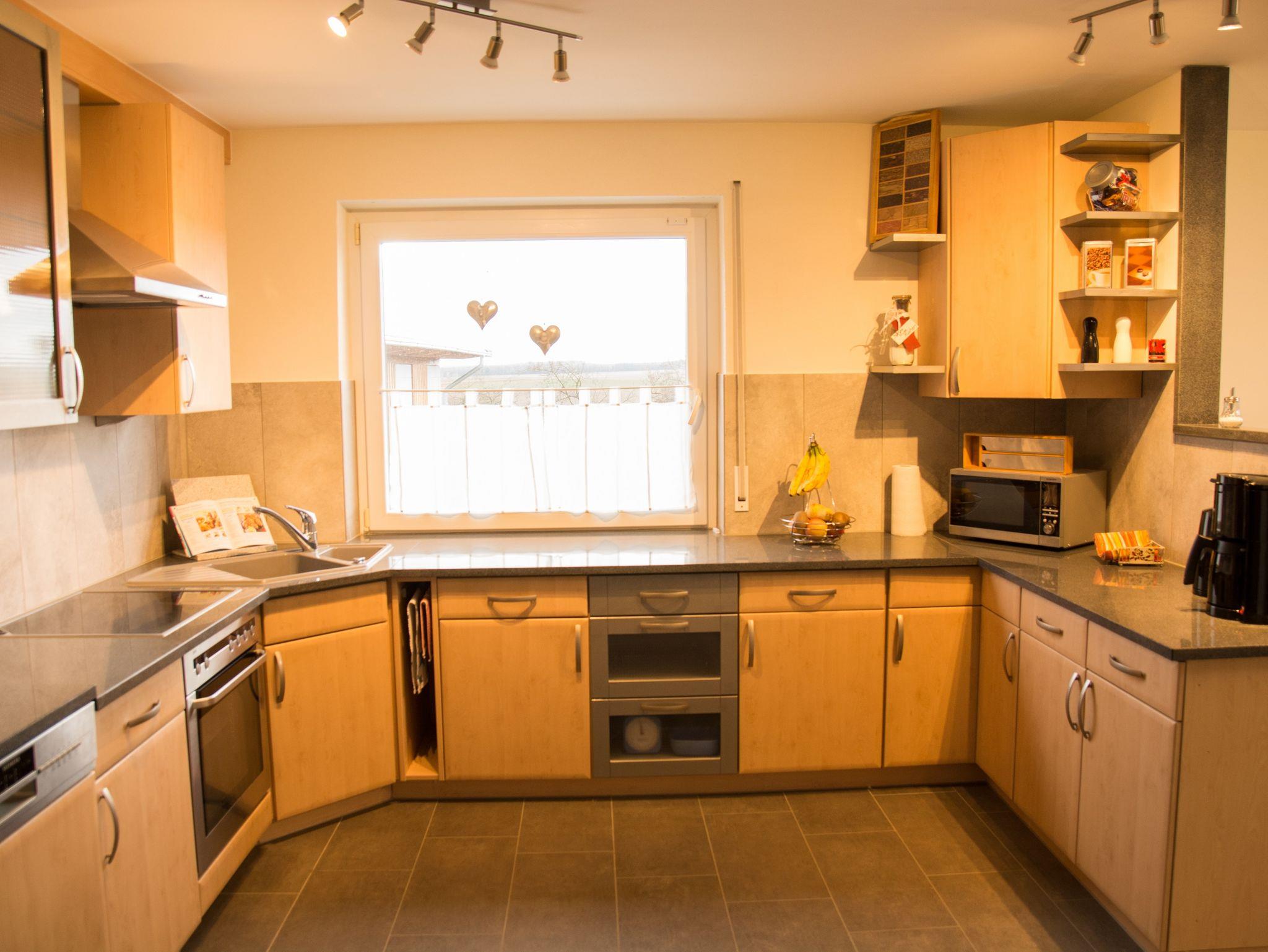 Ob Spülmaschine, Backofen, Kaffeemaschine mit zweiter Kanne, Brotschneidemaschine, Toaster, Waschmaschine, Flachbildfernseher oder Kamin, die Wohnung ist vollständig ausgestattet. Die 100 m² große Ferienwohnung mit zwei Schlafzimmern und mind. 5 Schlafplätzen - (Ausnahme 7 Erwachsene) liegt in ruhiger, ländlicher Umgebung.