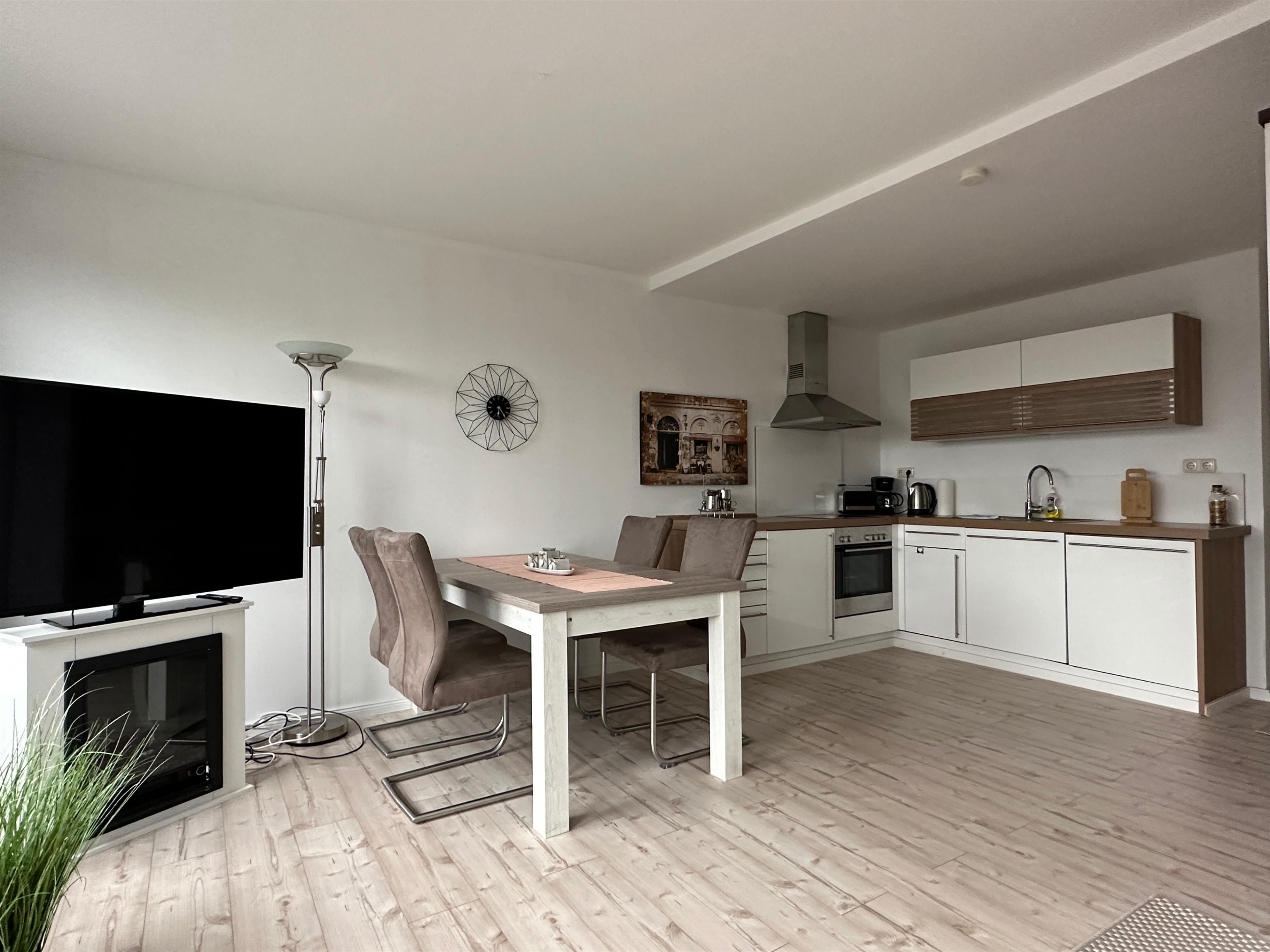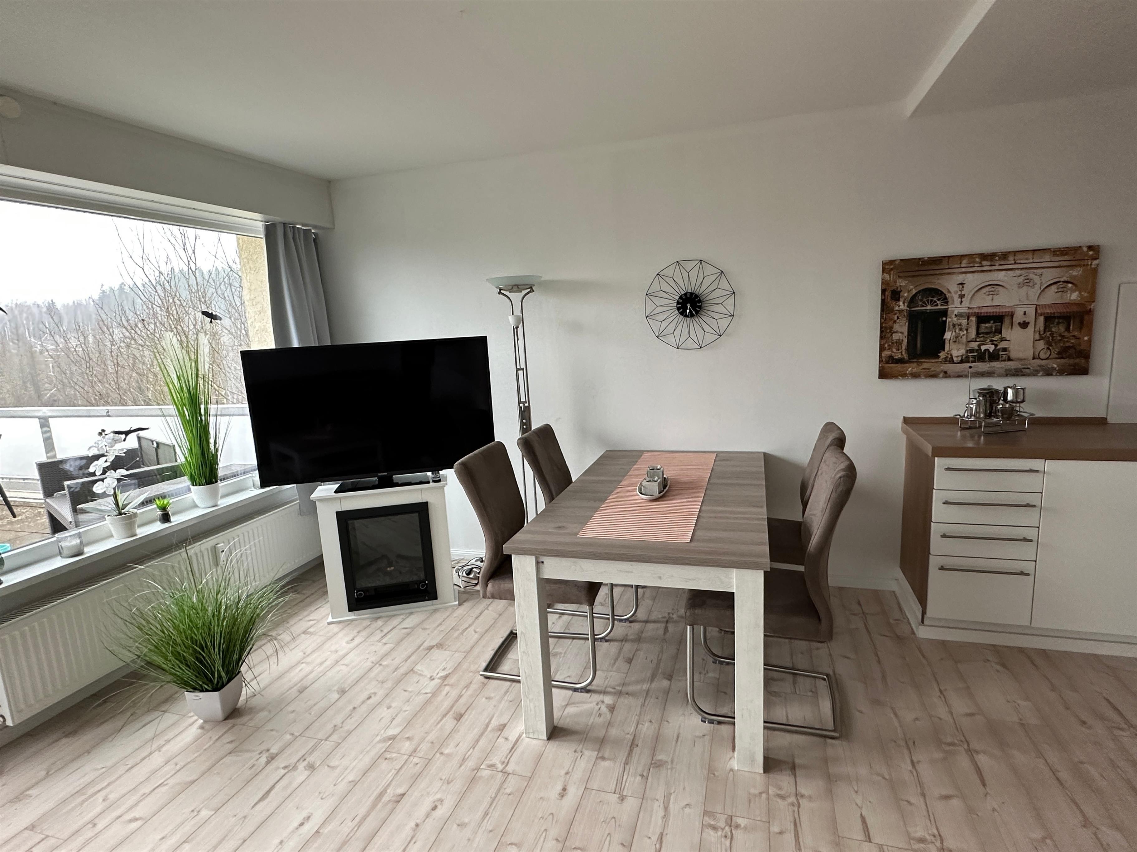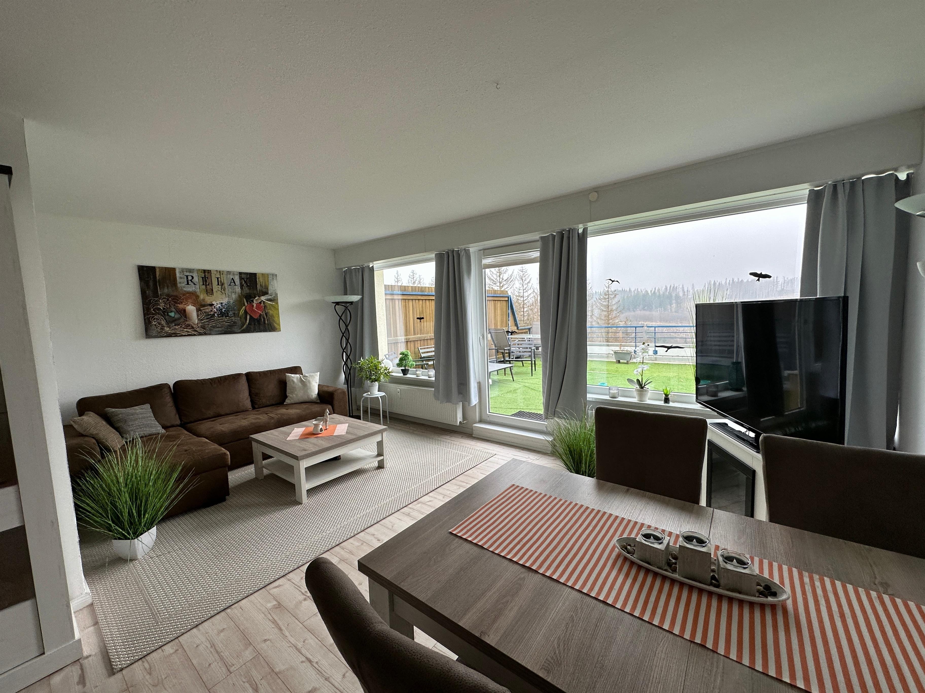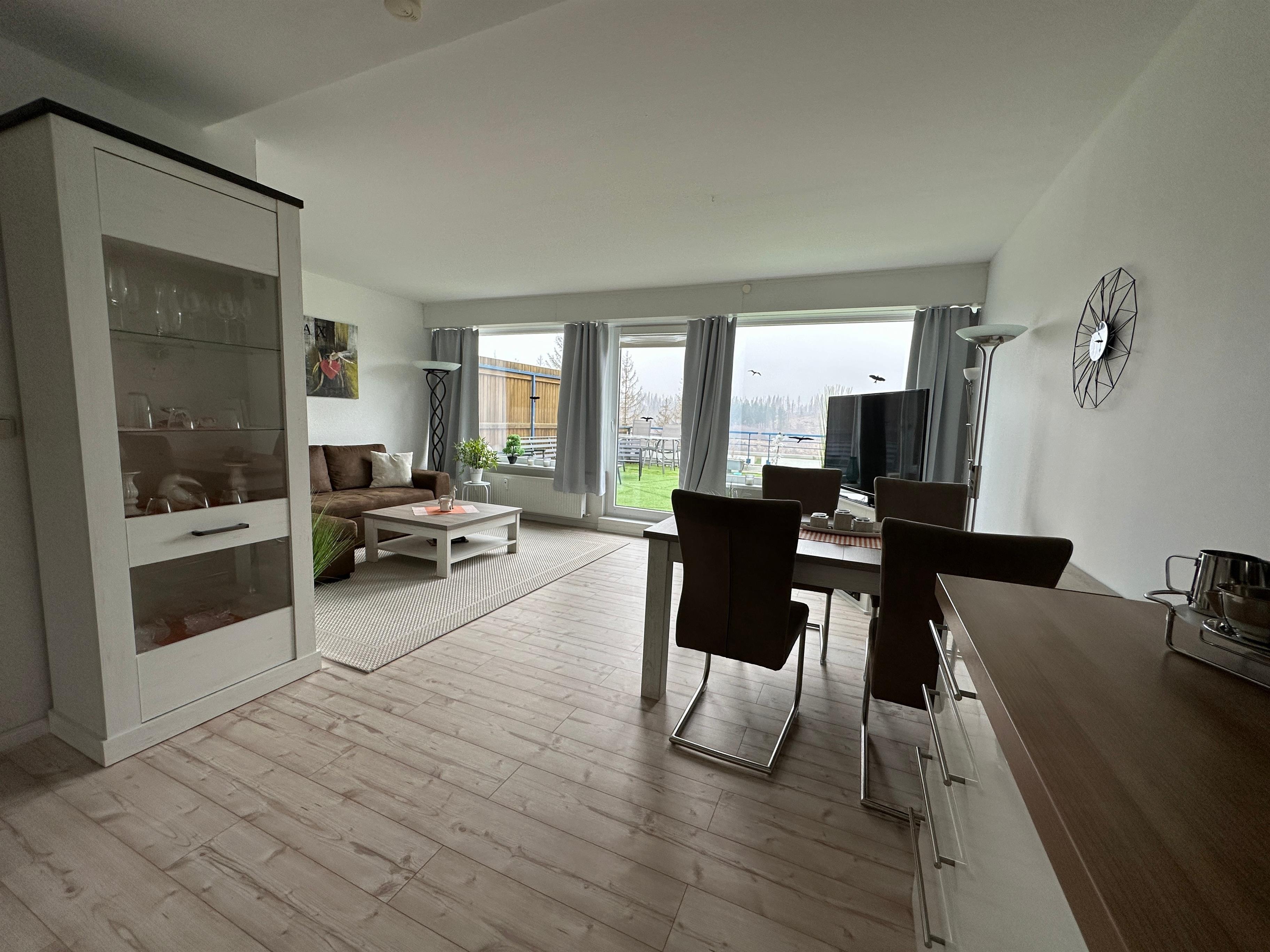 Das Wohn-Esszimmer verfügt über eine große gemütliche Eckcouch, Flachbild-TV , Kleiderschrank, einen schicken modernen Essplatz für 4 Personen sowie direktem Zugang zur ca. 35qm großen Terrasse mit freien Blick in die Natur. Hier steht eine Sitzgruppe und Sonnensitze zur Verfügung.