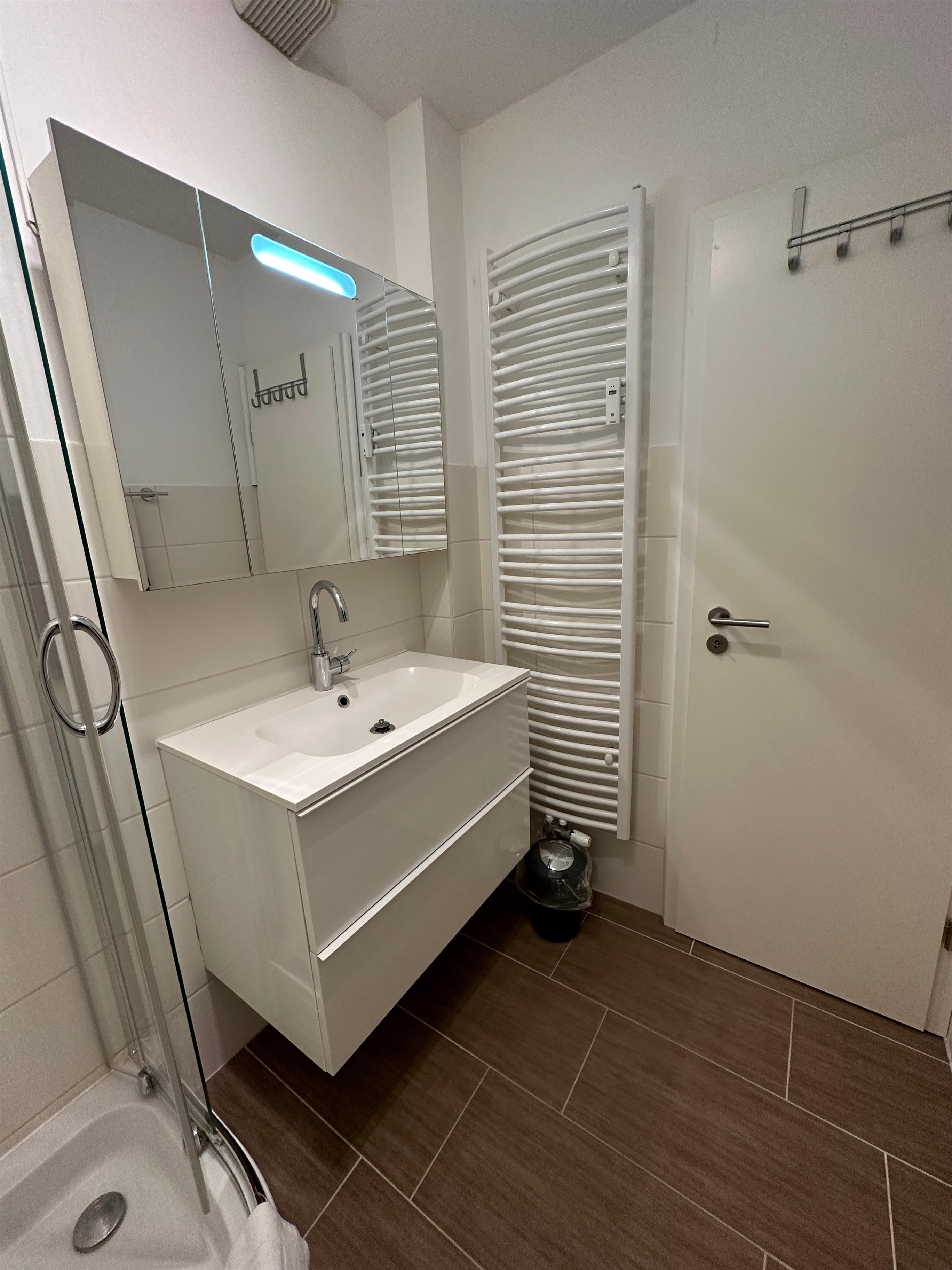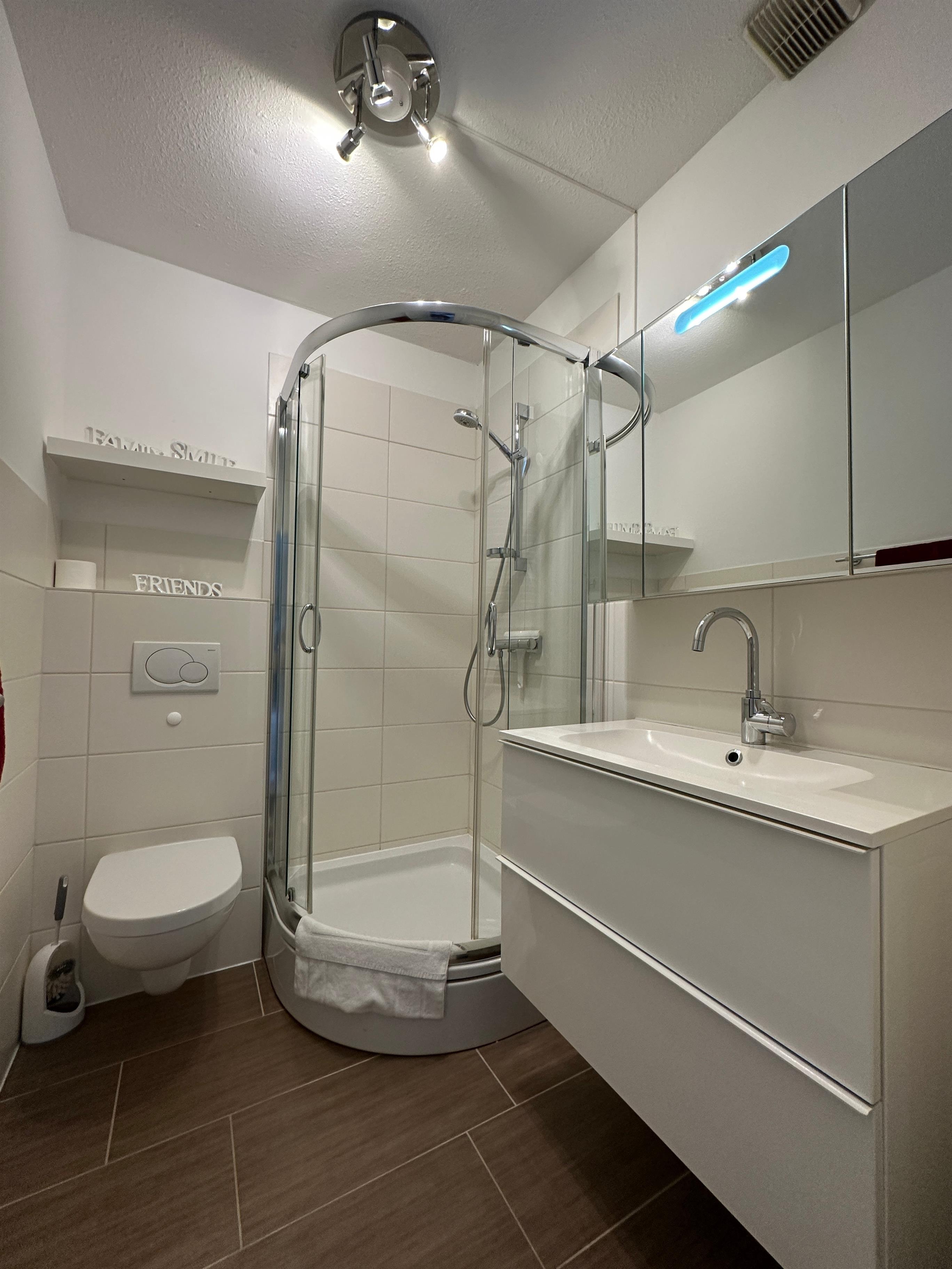 Das moderne helle Duschbad verfügt über eine Dusche, Waschtisch mit Spiegelschrank sowie WC, und Handtuchheizkörper.