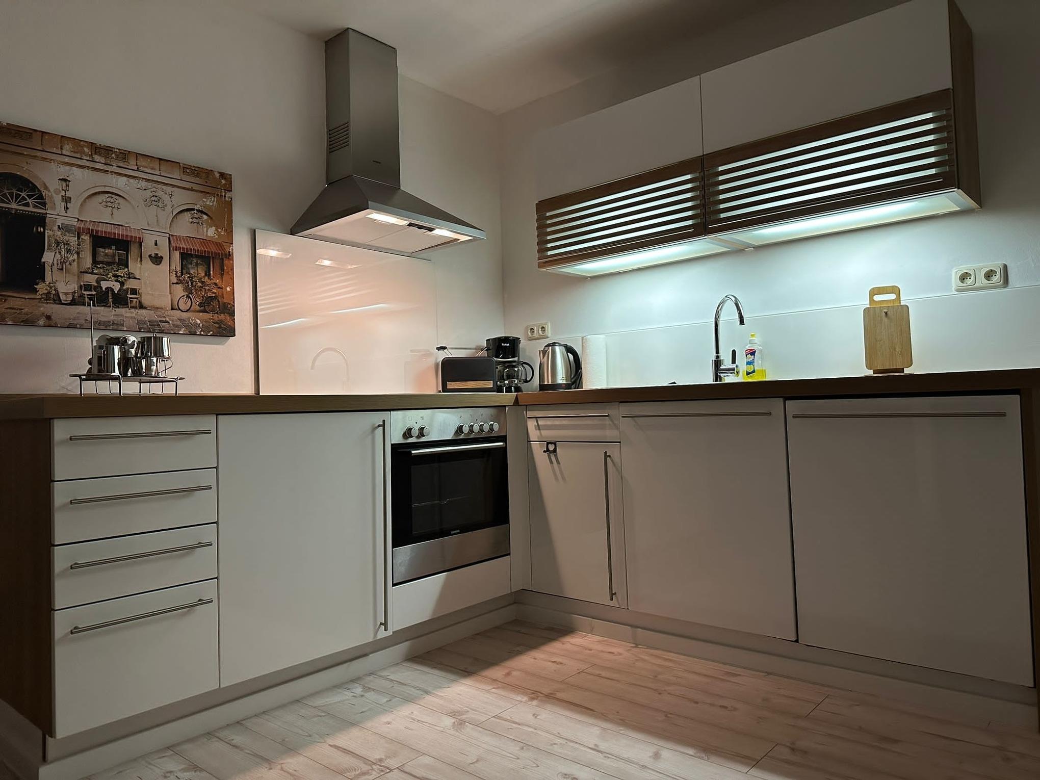 Die Küche ist vollständig ausgestattet mit Geschirr und Besteck, 4-Zonen Kochfeld mit Herd, Spülmaschine, Kühlschrank mit Gefrierfach, Toaster und Wasserkocher, Kaffeemaschine und Nespresso-Kaffeemaschine. Waschmaschine und Wäschetrockner stehen im Haus gegen eine kleine Gebühr zur Verfügung.