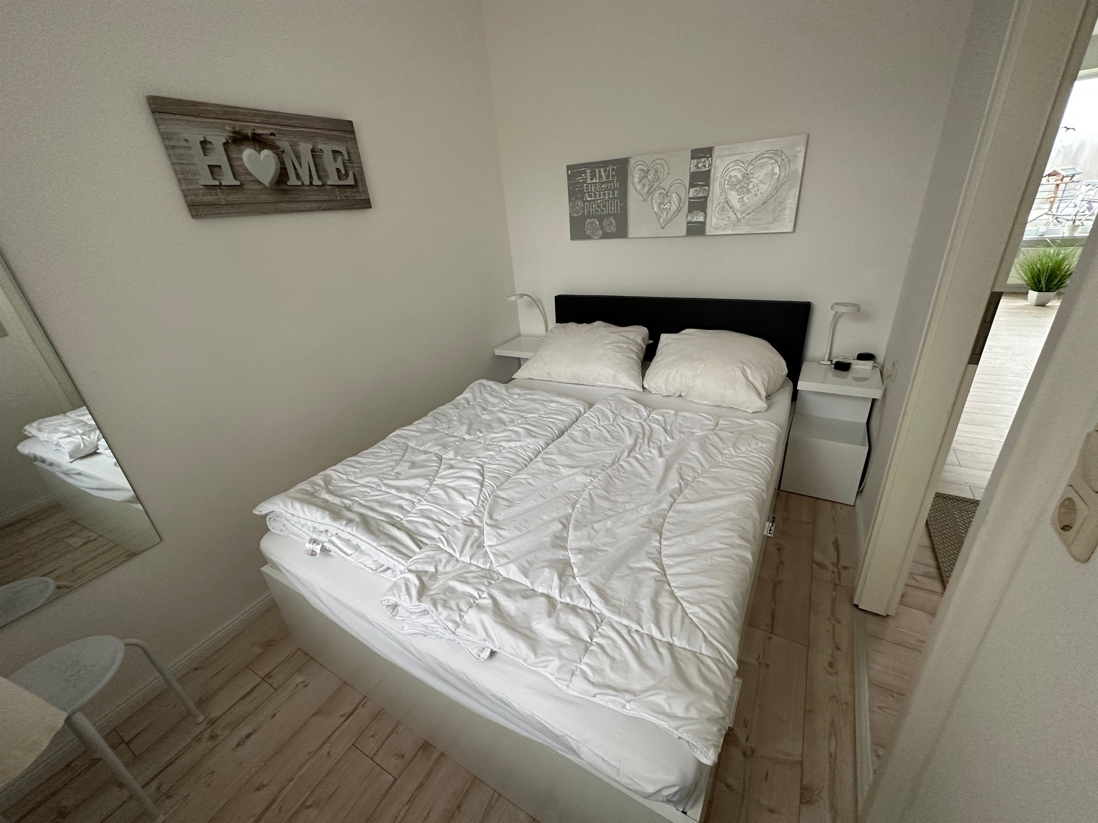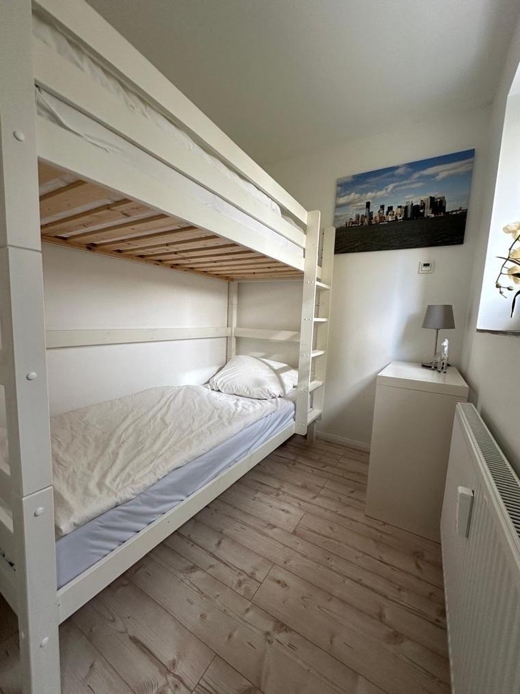 Das Schlafzimmer besitzt ein Doppelbett 1,40 m x 2,00 m. Im zweiten Zimmer steht ein Etagenbett mit zwei Betten á 90 x 200 cm.
