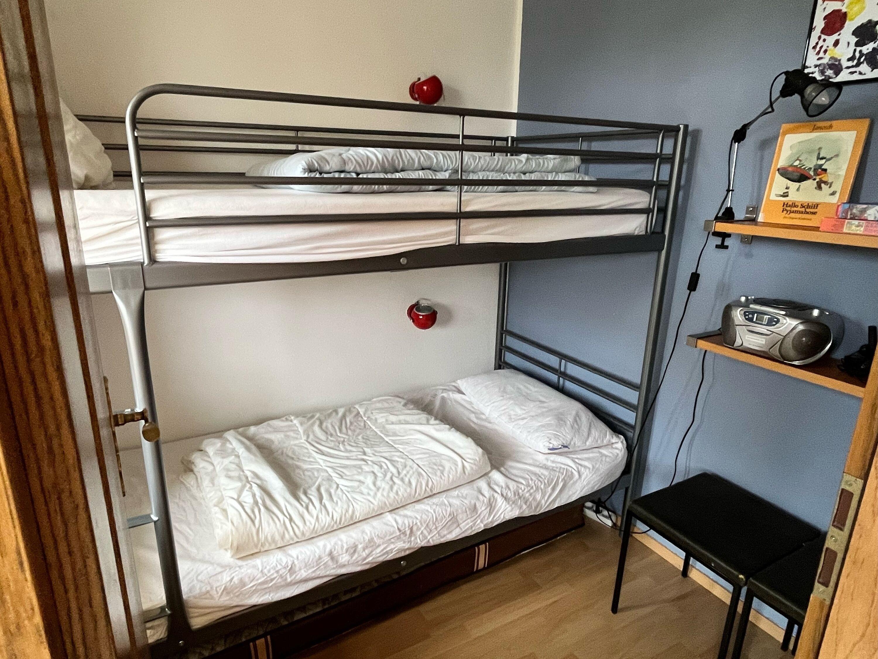 Ein Schlafraum mit Doppelbett (1,80 x 2,00 m), Kinderzimmer mit Stockbett und ein einfaches Wannenbad gehören zum Angebot ,