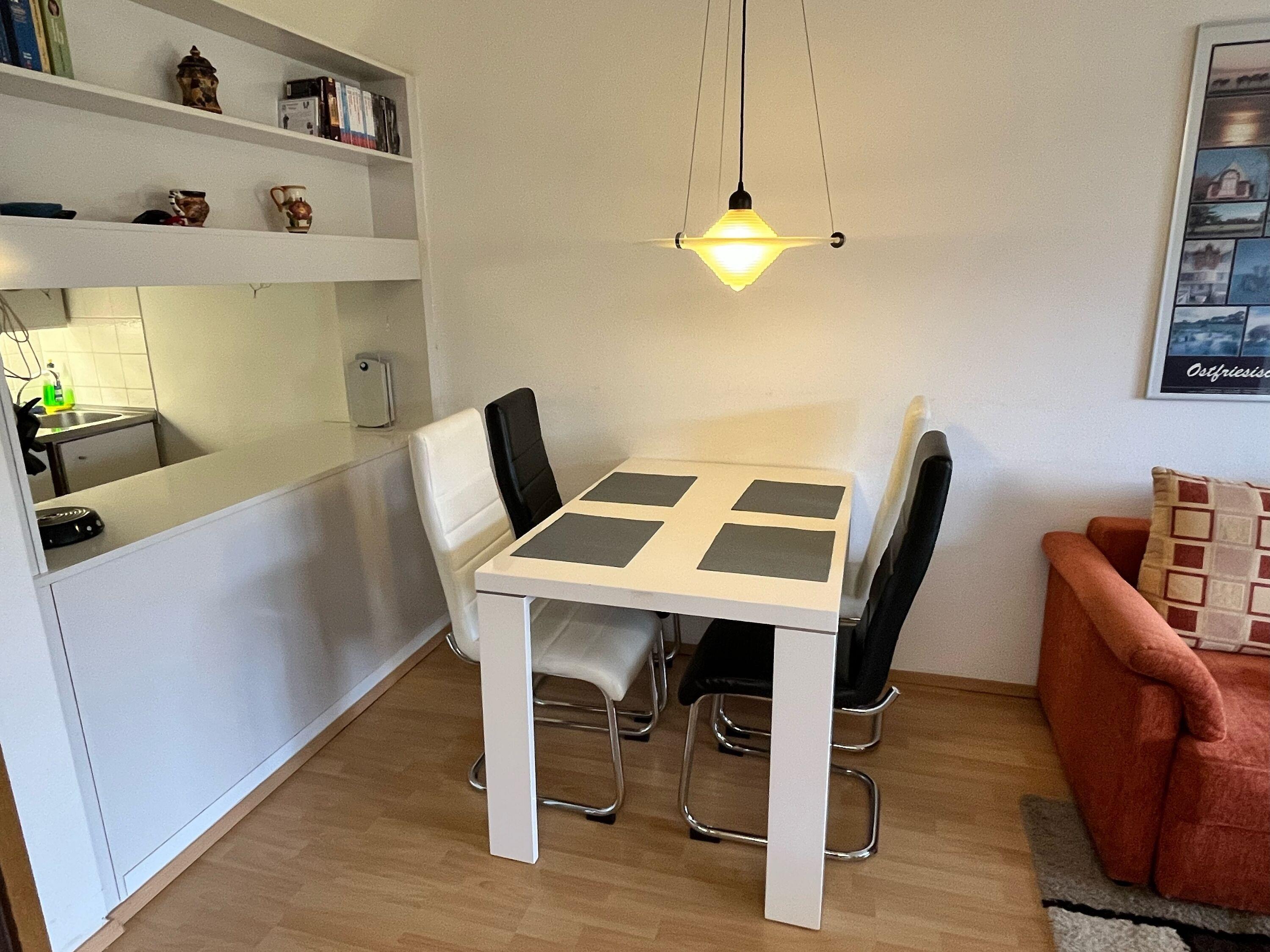 Familiengerecht ausgestattete, Nichtraucher- Ferienwohnung mit offener Küchenzeile mit Essecke und Wohnraum mit Ausgang zum Balkon. Der Wohn-und Schlafbereich ist mit Laminatböden ausgestattet.