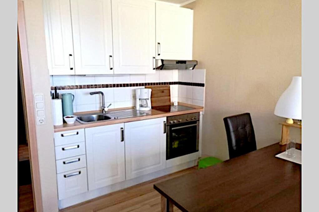 Hell und freundlich eingerichtete Nichtraucher- Ferienwohnung mit einem Schlafraum mit Doppelbett (1,40 x 2,00 m) und Küchenzeile mit Essecke und Wohnraum mit Schlafcouch und großem Fernseher. Der Wohn-und Schlafbereich ist mit Laminatboden ausgestattet.