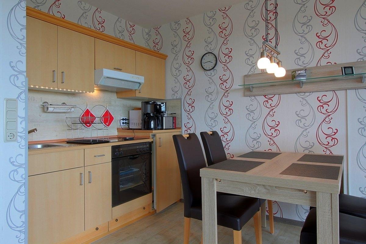 Geschmackvoll eingerichtete, Nichtraucher- Ferienwohnung mit einem Schlafraum mit Doppelbet ( 140 x 200 cm ), moderner Küchenzeile, Essecke und Wohnraum mit Schlafsofa mit Topper für 2 Personen. Die Wohnung ist mit Teppichboden im Wohn- und Schlafbereich ausgestattet