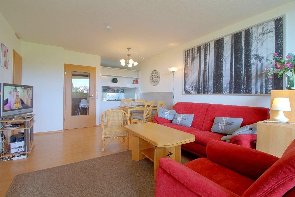 Gepflegte, komfortabel ausgestattete, Nichtraucher- Ferienwohnung mit einem Schlafraum mit Doppelbett (1,80 x 2,00 m) und 40 Zoll-TV, sowie ein Stockbett für die Kinder im zweiten Schlafraum, Küche, Essecke und Wohnraum mit bequemer Sitzgarnitur und 55 Zoll-SmartTV. Der Wohn-und Schlafbereich ist mit Laminatboden ausgestattet.
