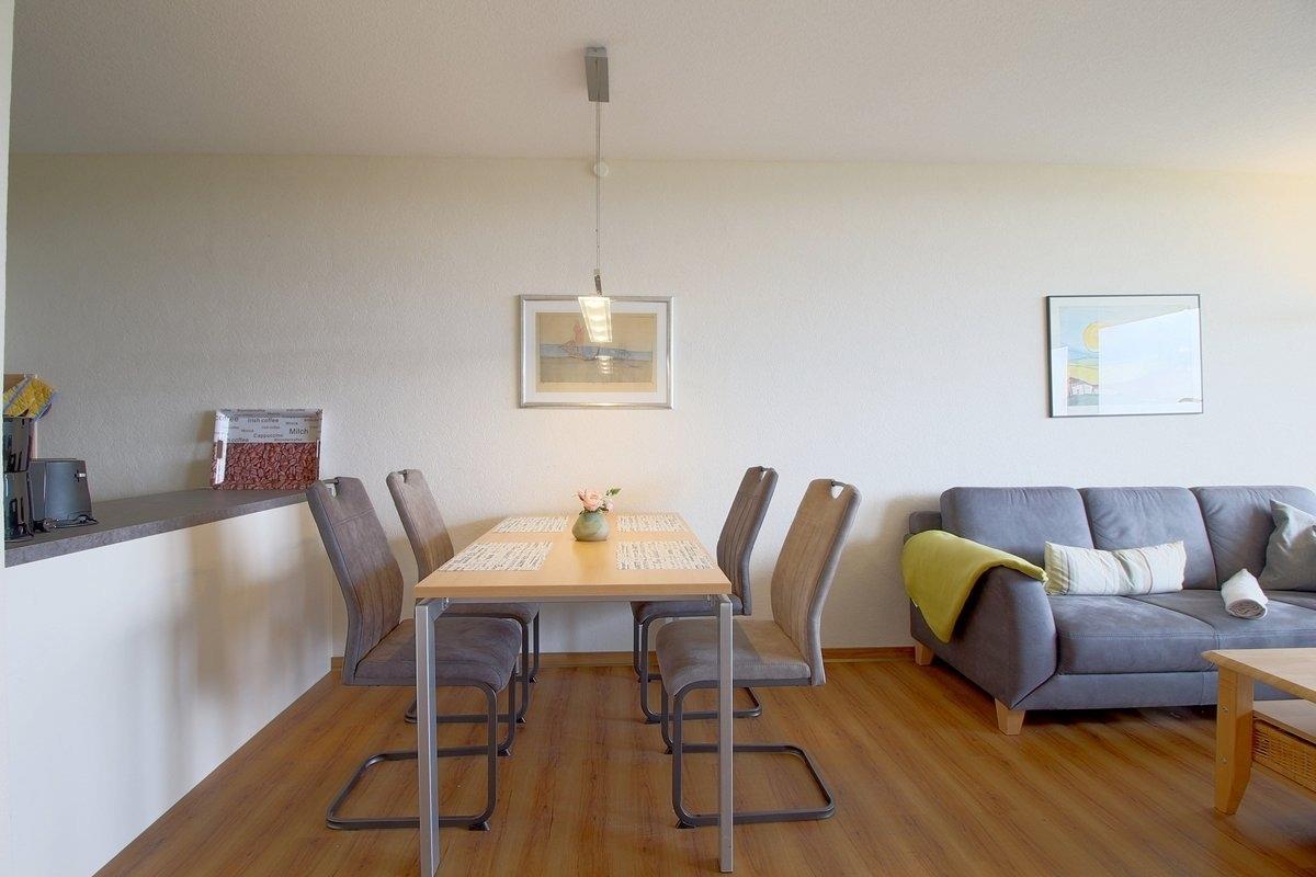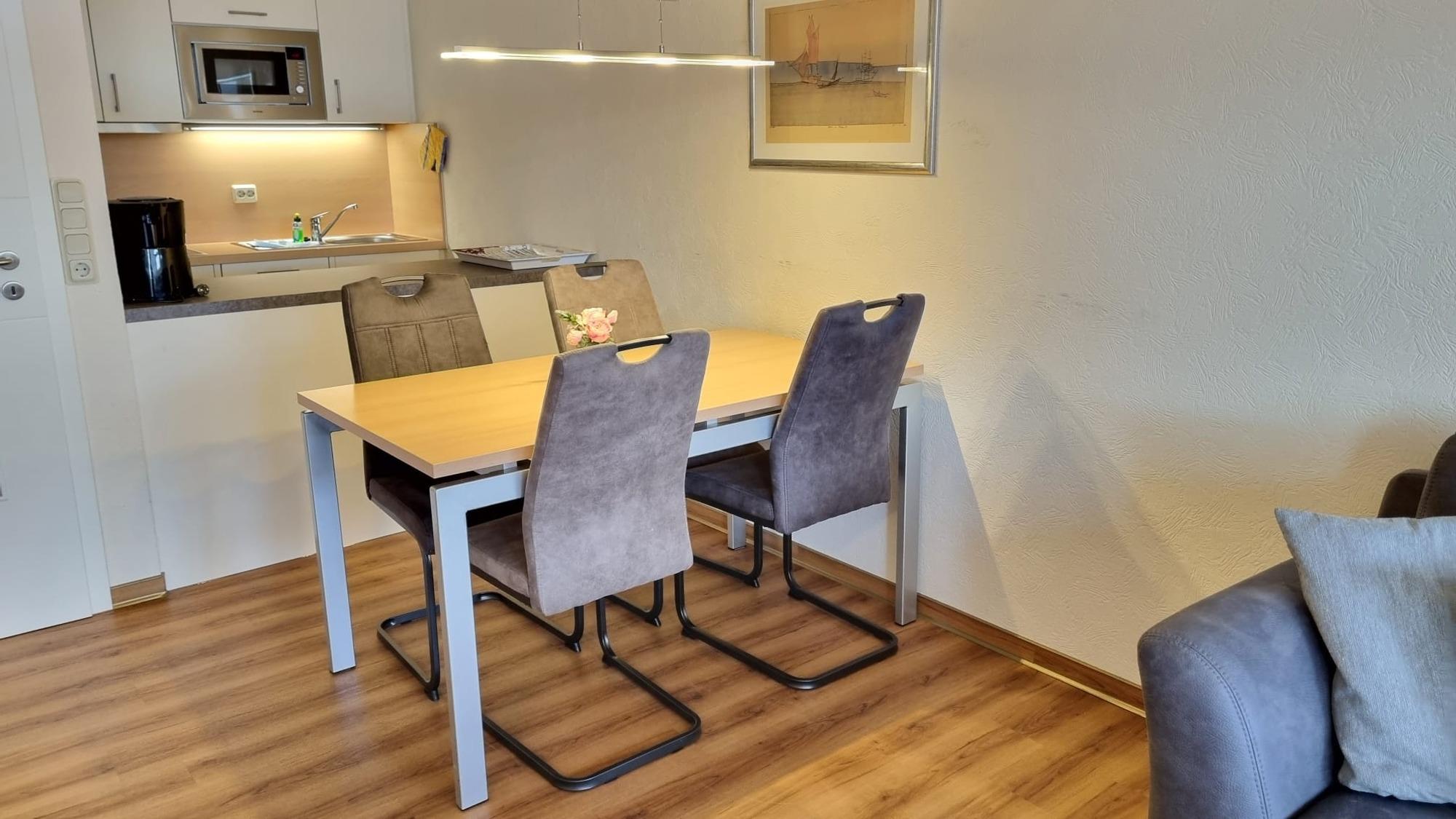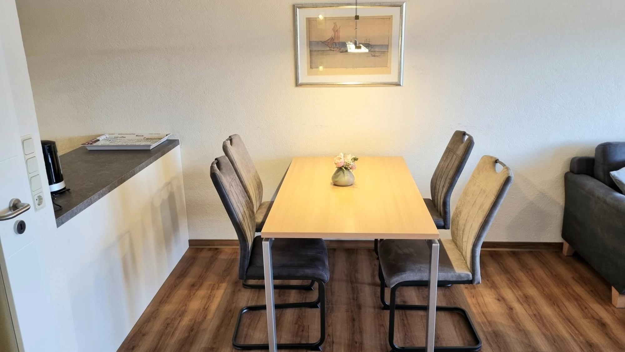 Komplett modernisierte Nichtraucher- Ferienwohnung mit einem Schlafraum mit Doppelbett (1,80 x 2,00 m) und Stockbett für die Kinder im zweiten Schlafraum, Küchenzeile mit Essecke und Wohnraum. Der Wohn-und Schlafbereich ist mit Vinylbodenbelag ausgestattet und daher auch für Allergiker geeignet.