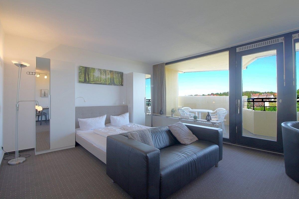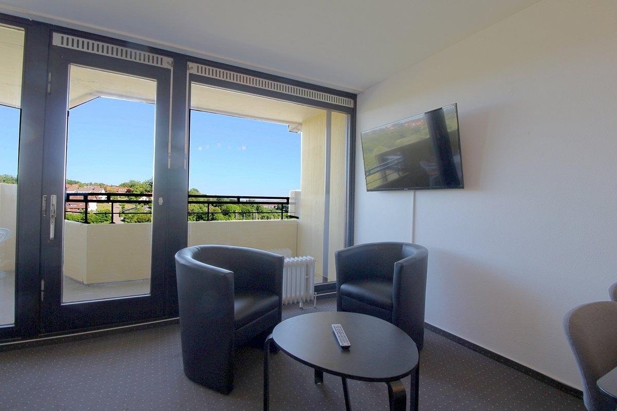 Auf dem Balkon mit den Sitzmöbeln können Sie die Aussicht oder auch im Sommer die Morgensonne beim Frühstück genießen.