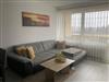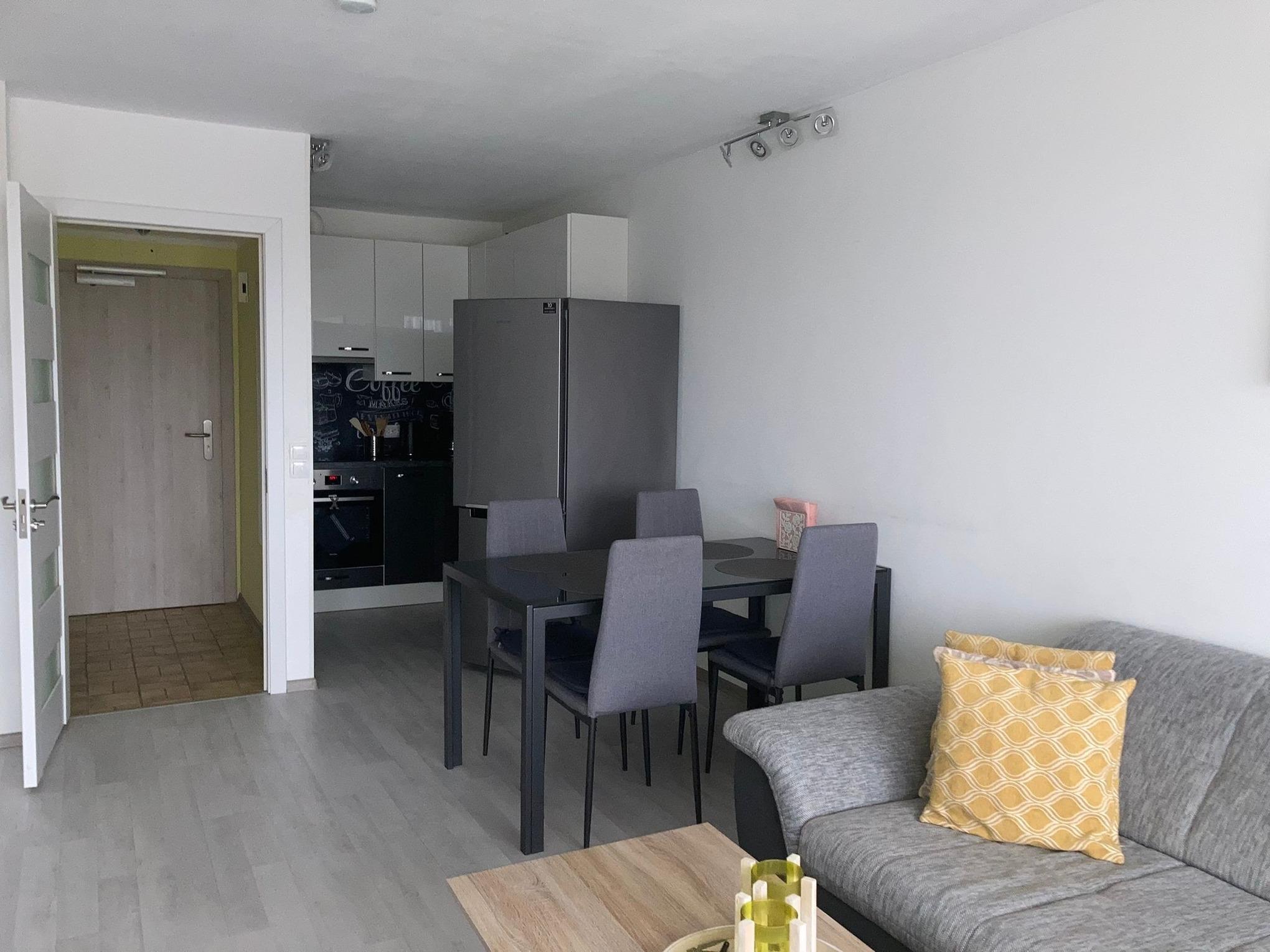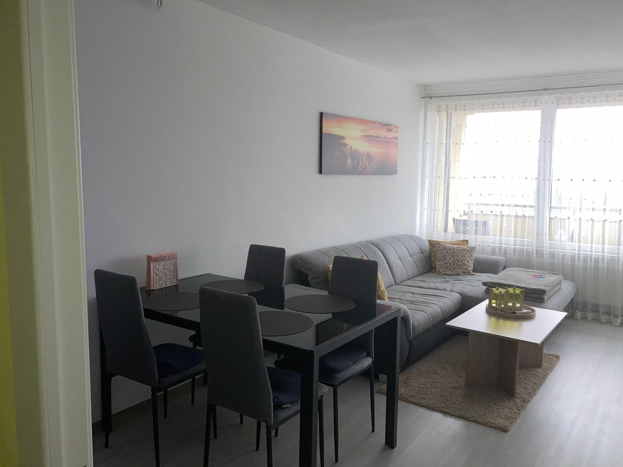 Moderne Einbauküche mit Essecke und Wohnraum mit großem Bigsofa. Die Wohnung ist mit pflegeleichten Laminatböden im Wohn- und Schlafbereich ausgestattet.