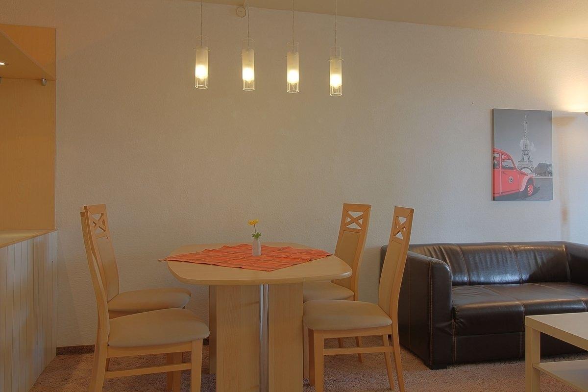 Komfortabel ausgestattete, Ferienwohnung mit einem Schlafraum mit Doppelbett (1,80 x 2,00 m) und Stockbett für die Kinder im zweiten Schlafraum, Küchenzeile mit Essecke und Wohnraum. Der Wohn-und Schlafbereich ist mit Teppichboden ausgestattet.