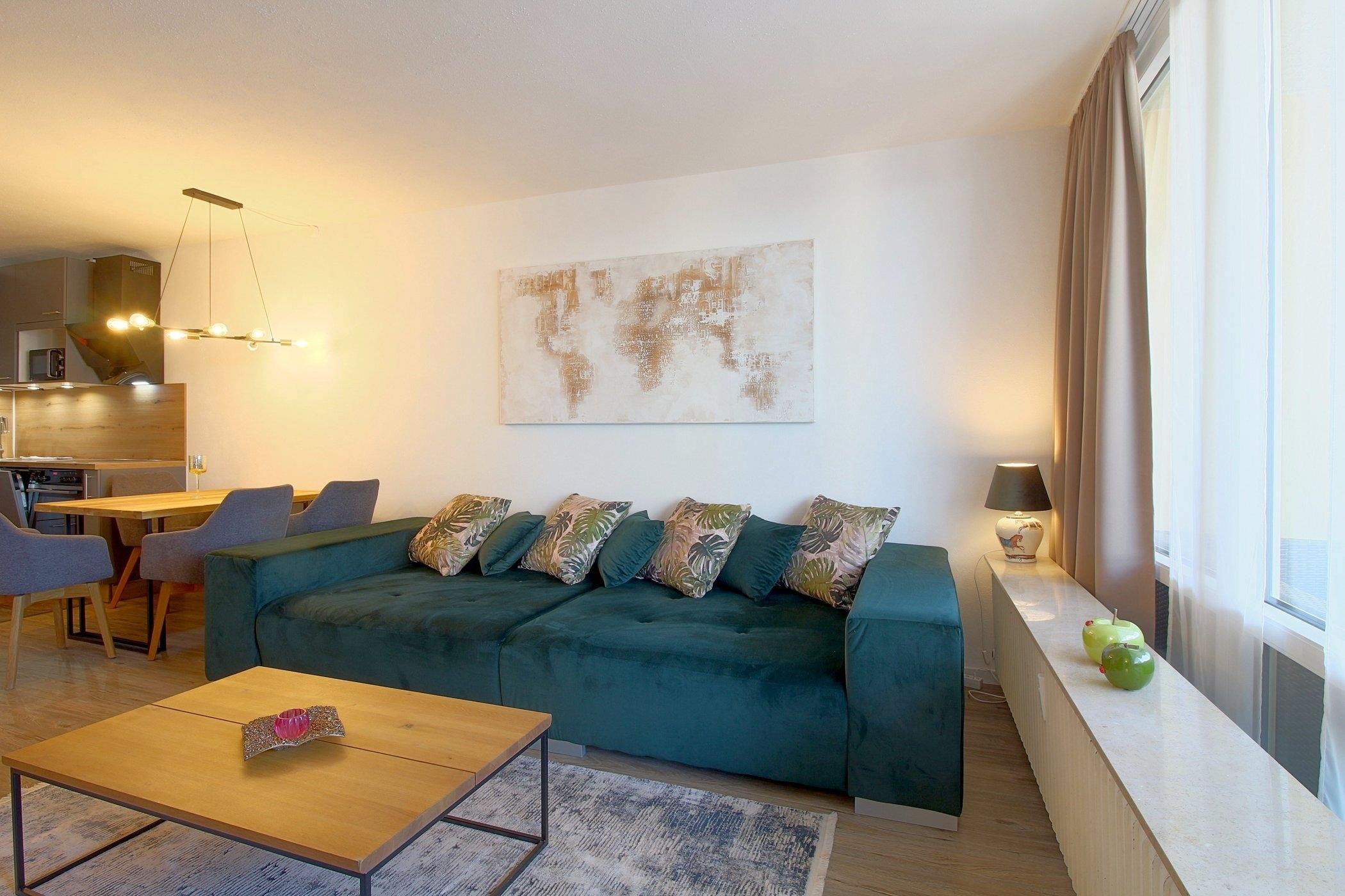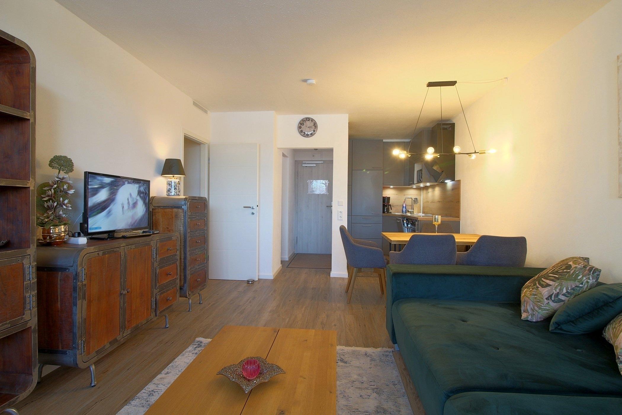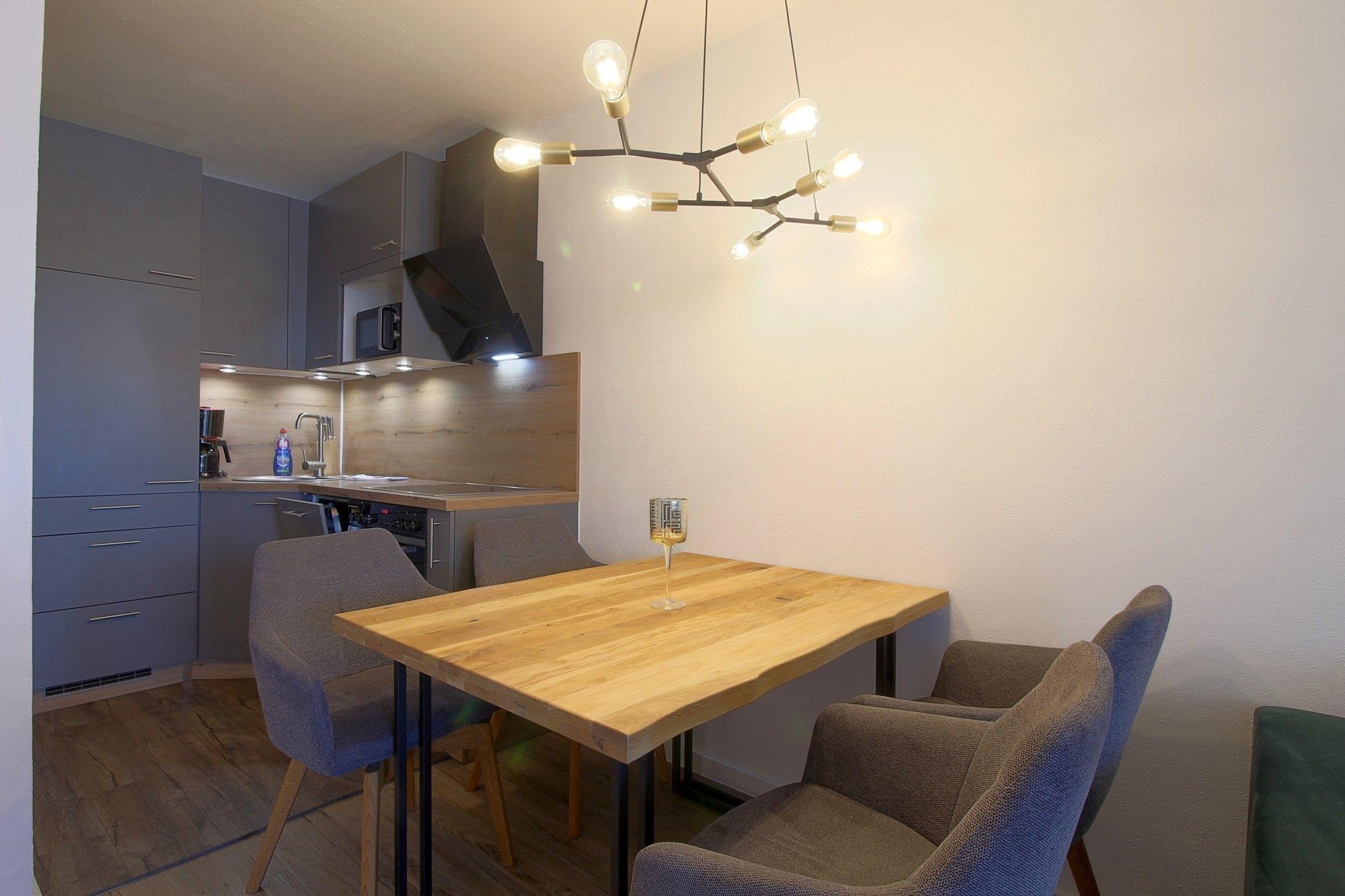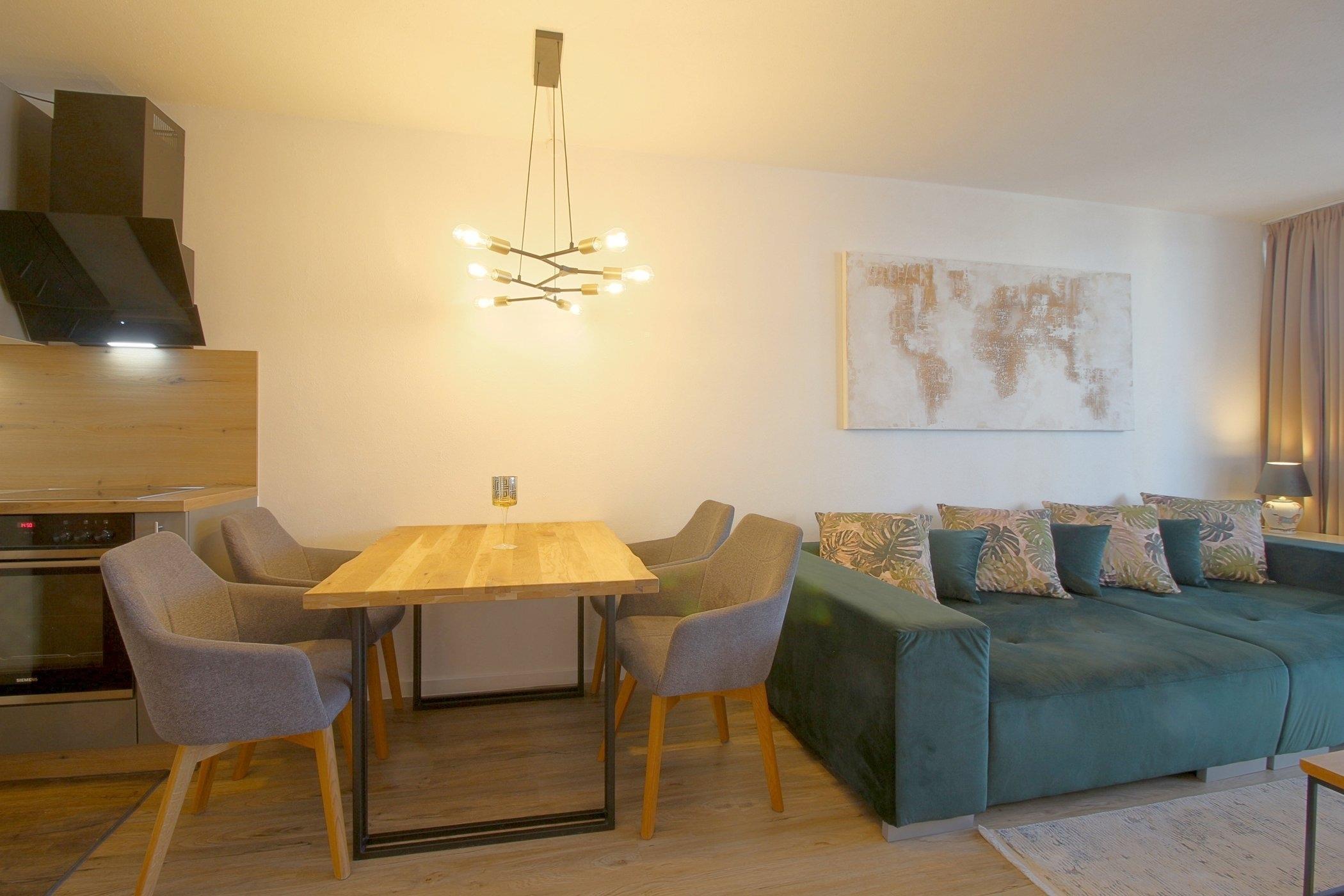 Die schicke, offene Küche mit Geschirrspüler, Essplatz und Wohnraum mit Ausgang zum Balkon bietet Platz für die ganze Familie.