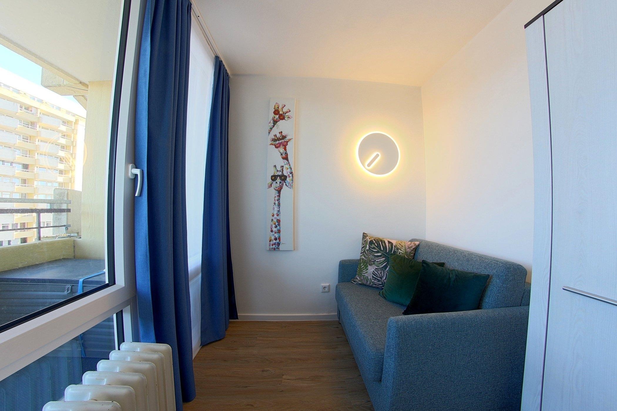 In der 8. Etage liegt diese Ferienwohnung mit 2 Schlafzimmern. Das Schwimmbad im Haus, Minigolf, Rodelberg und Spielplatz für Kinder befinden sich direkt im bzw. am Haus