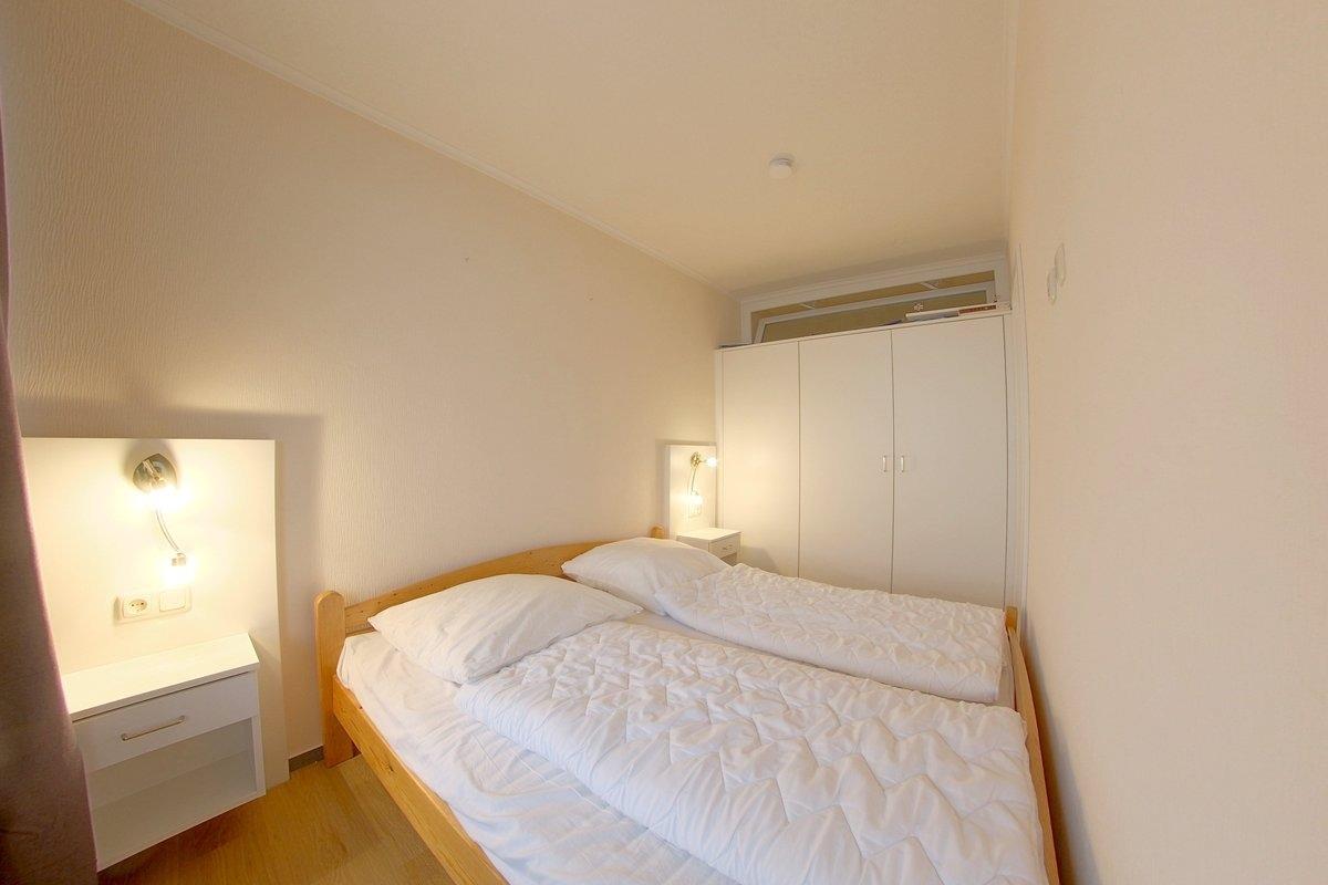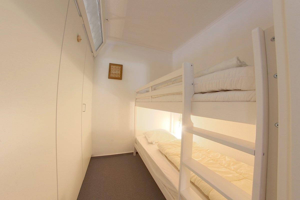 Modern ausgestattete, Nichtraucher- Ferienwohnung mit einem Schlafraum mit Doppelbett (1,80 x 2,00 m) und Fenster, und einem Schlafraum mit Stockbett für Kinder.