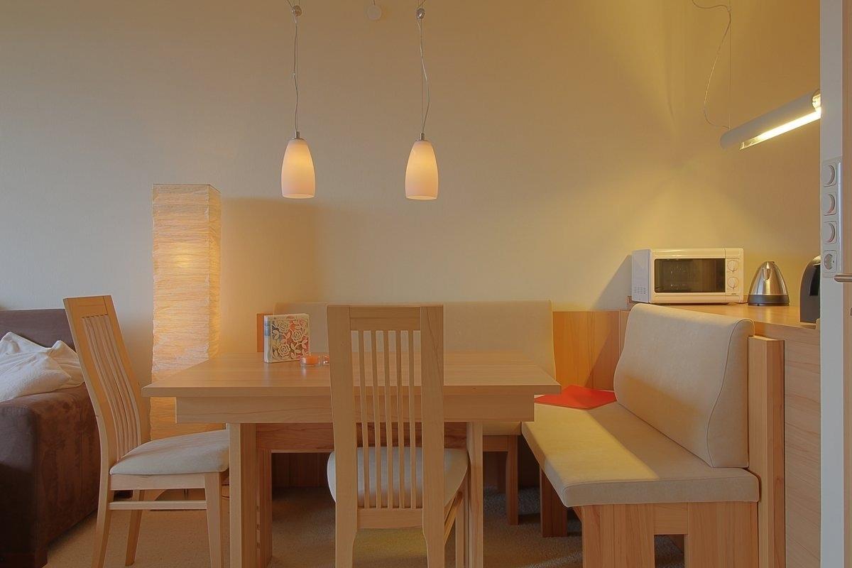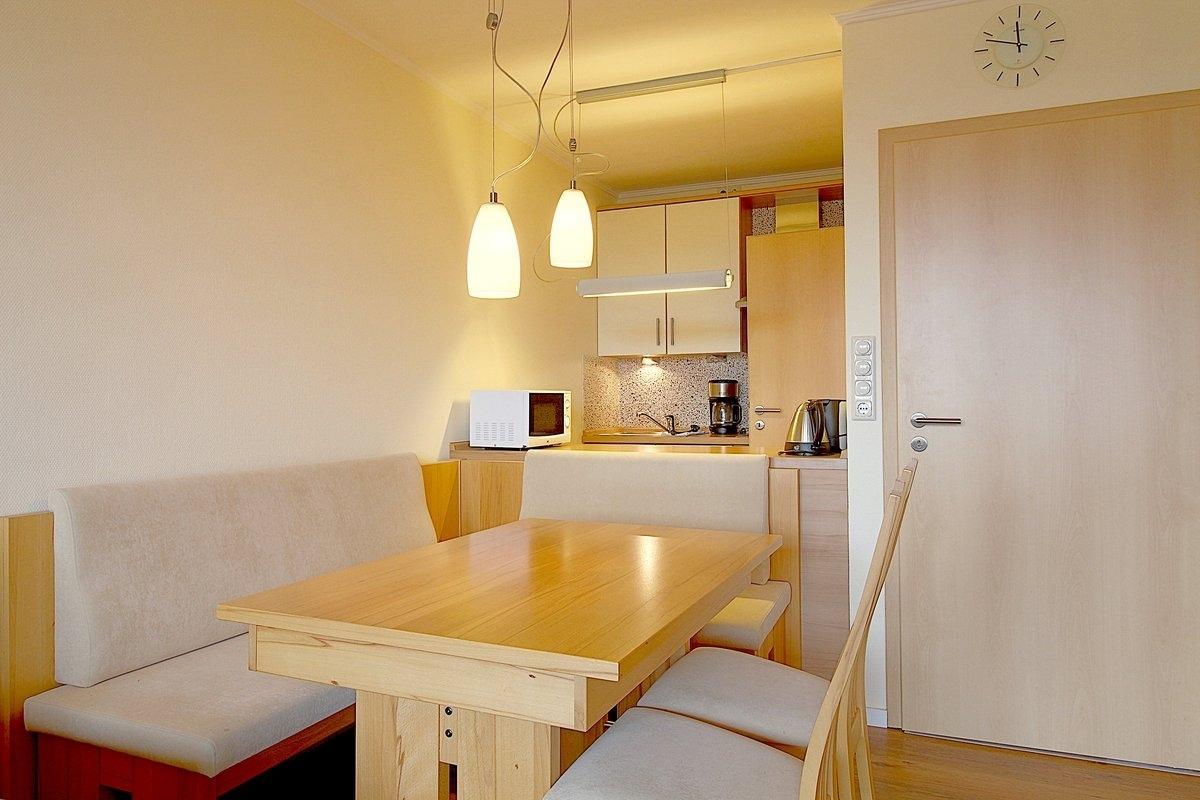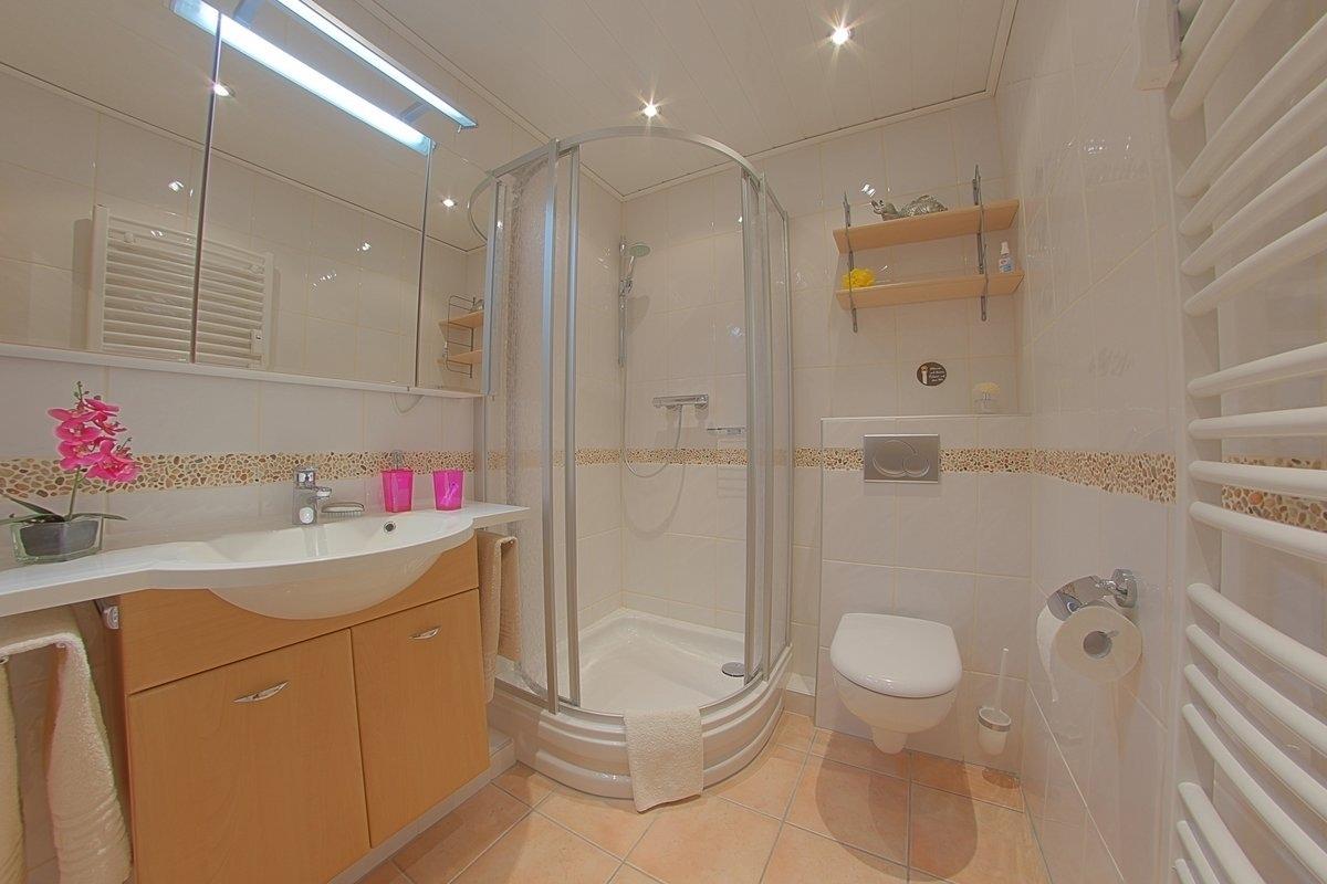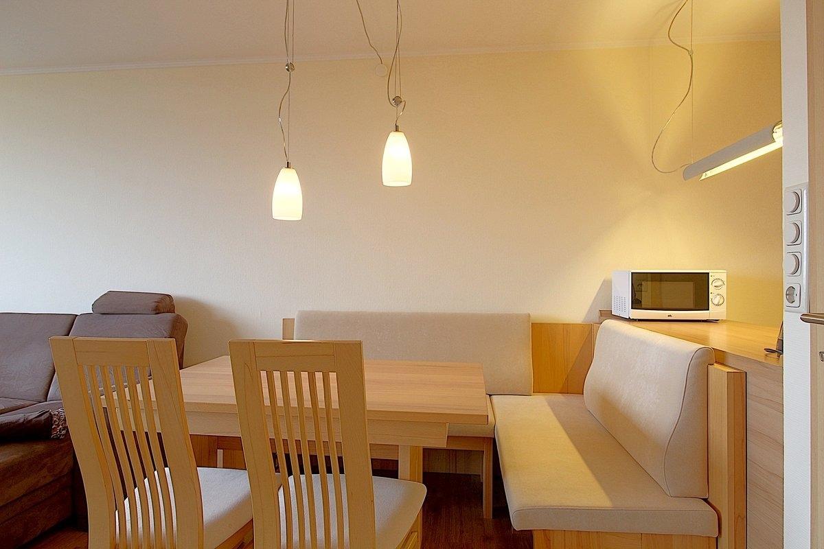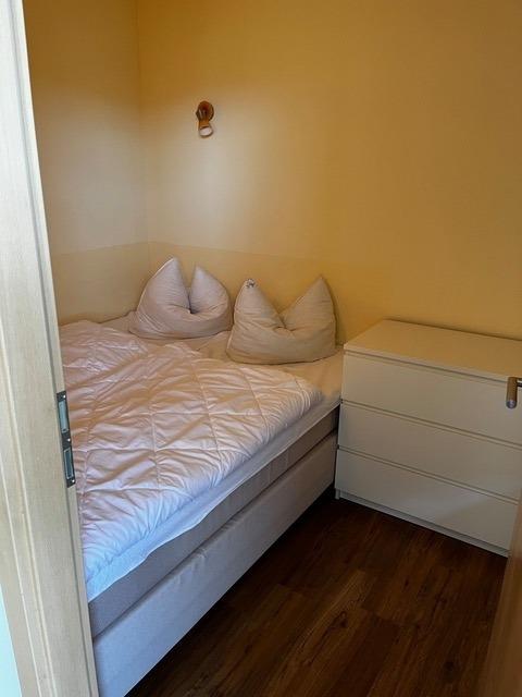 Hochwertig eingerichtete Nichtraucher-Ferienwohnung mit 1 Schlafzimmer mit Boxspringbett ( 1,60 x 2,00 m ), und zweiter Schlafraum mit TV und Einzelbett ( 0,90 x 2,00 m ). Im Wohnzimmer gibt es eine gemütliche Eckcouch und einen geräumigen Essplatz mit Eckbank für die große Runde. Die hochwertige Küche mit Geschirrspüler lässt keine Wünsche offen. Modernes, helles Duschbad. Der Wohnbereich ist mit Laminatboden ausgestattet.