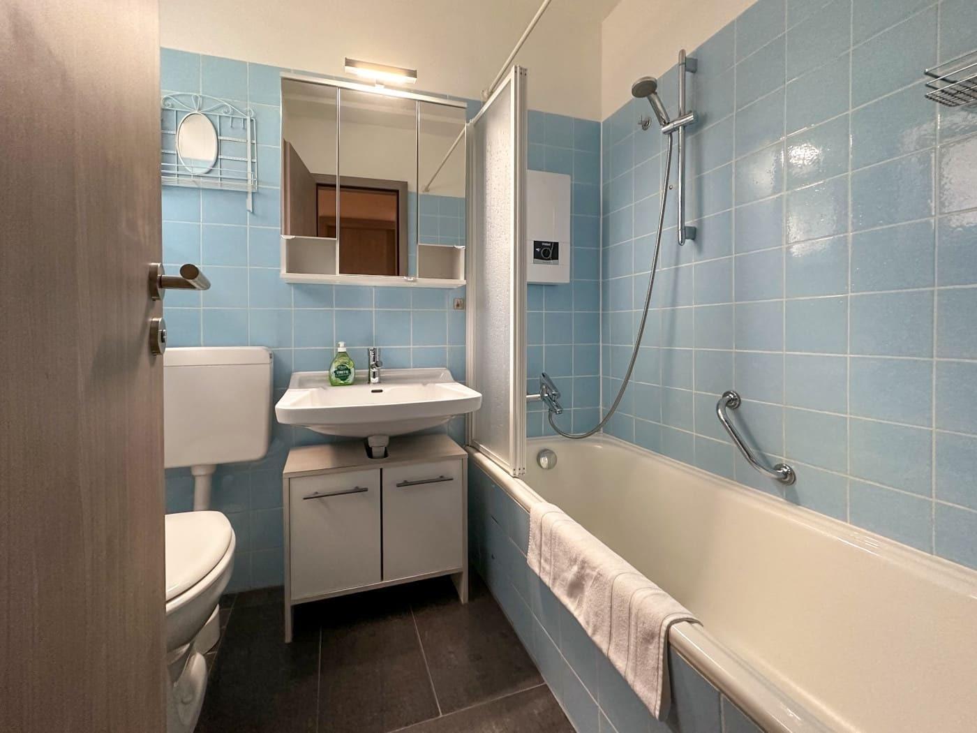 Im Wohnbereich steht eine Doppelschlafcouch und ein großer Esstisch zur Verfügung. Das Badezimmer mit Badewanne und Duschabtrennung verfügt über ein Fenster zur direkten Belüftung.