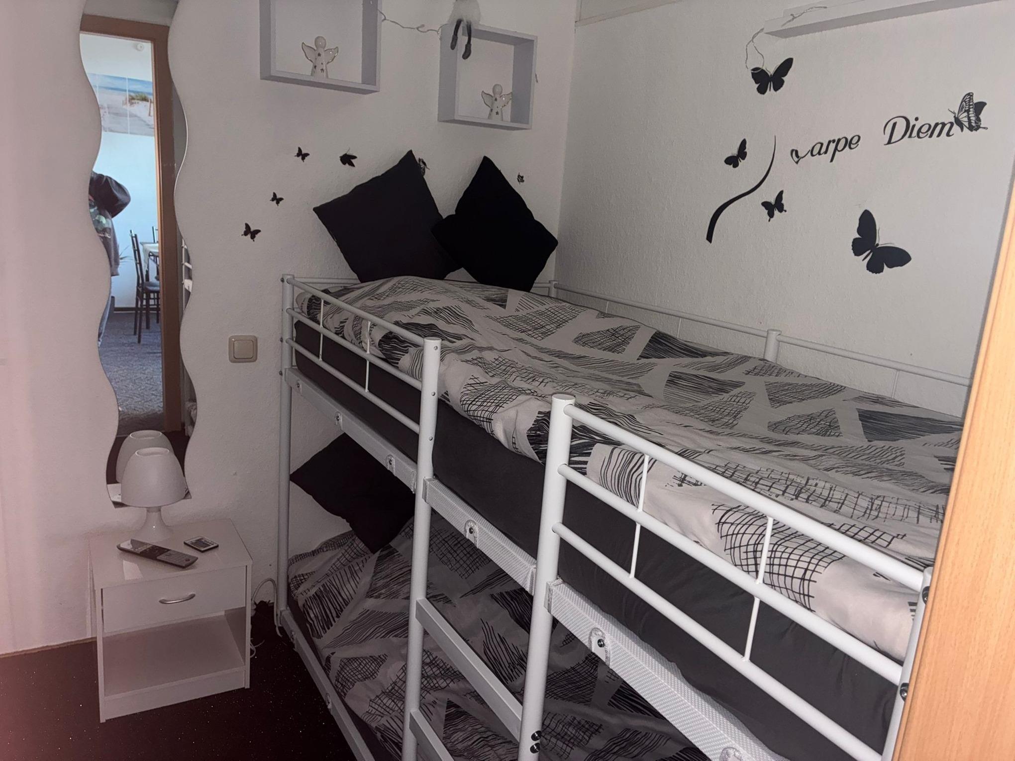 Komfortabel ausgestattete, Nichtraucher- Ferienwohnung mit einem Schlafraum mit Doppelbett (1,80 x 2,00 m) und Stockbett für die Kinder im zweiten Schlafraum, neue Küche mit Geschirrspüler, Essecke und Wohnraum mit bequemer Sitzgarnitur. Der Wohn-und Schlafbereich ist mit Teppichboden ausgestattet. Kostenloses W-Lan in der Wohnung vorhanden.
