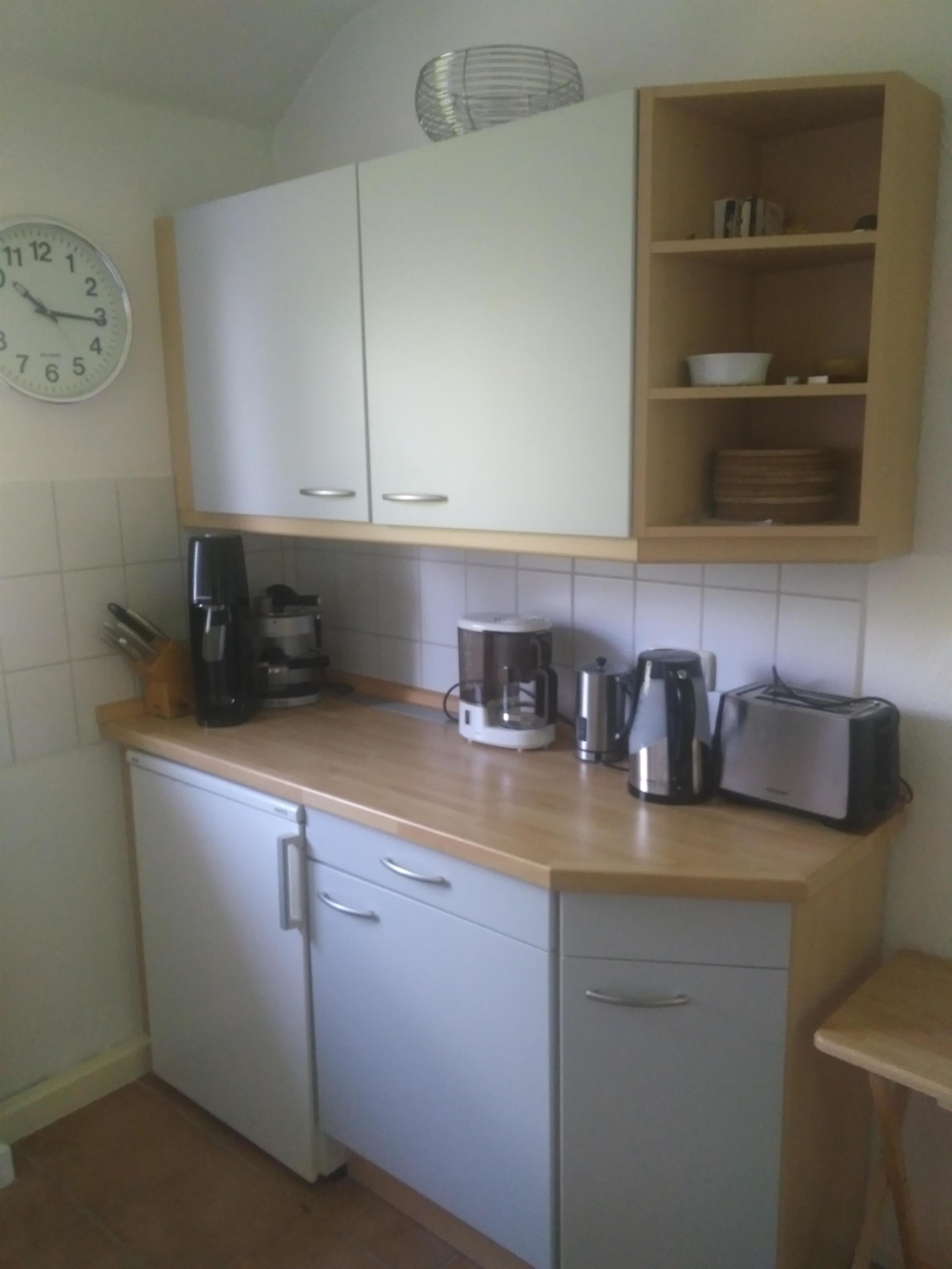 Die Ferienwohnung bietet Ihnen eine großzügig ausgestattete Einbauküche mit Geschirrspüler und Umluftbackofen. In der Küche finden Sie neben einem Kühlschrank mit Gefrierfach (***), einem Ceranfeld, einer Kaffeemaschine und einem Toaster sowie alles was Sie zum Kochen, Essen und Trinken für mindestens 4 Personen benötigen.