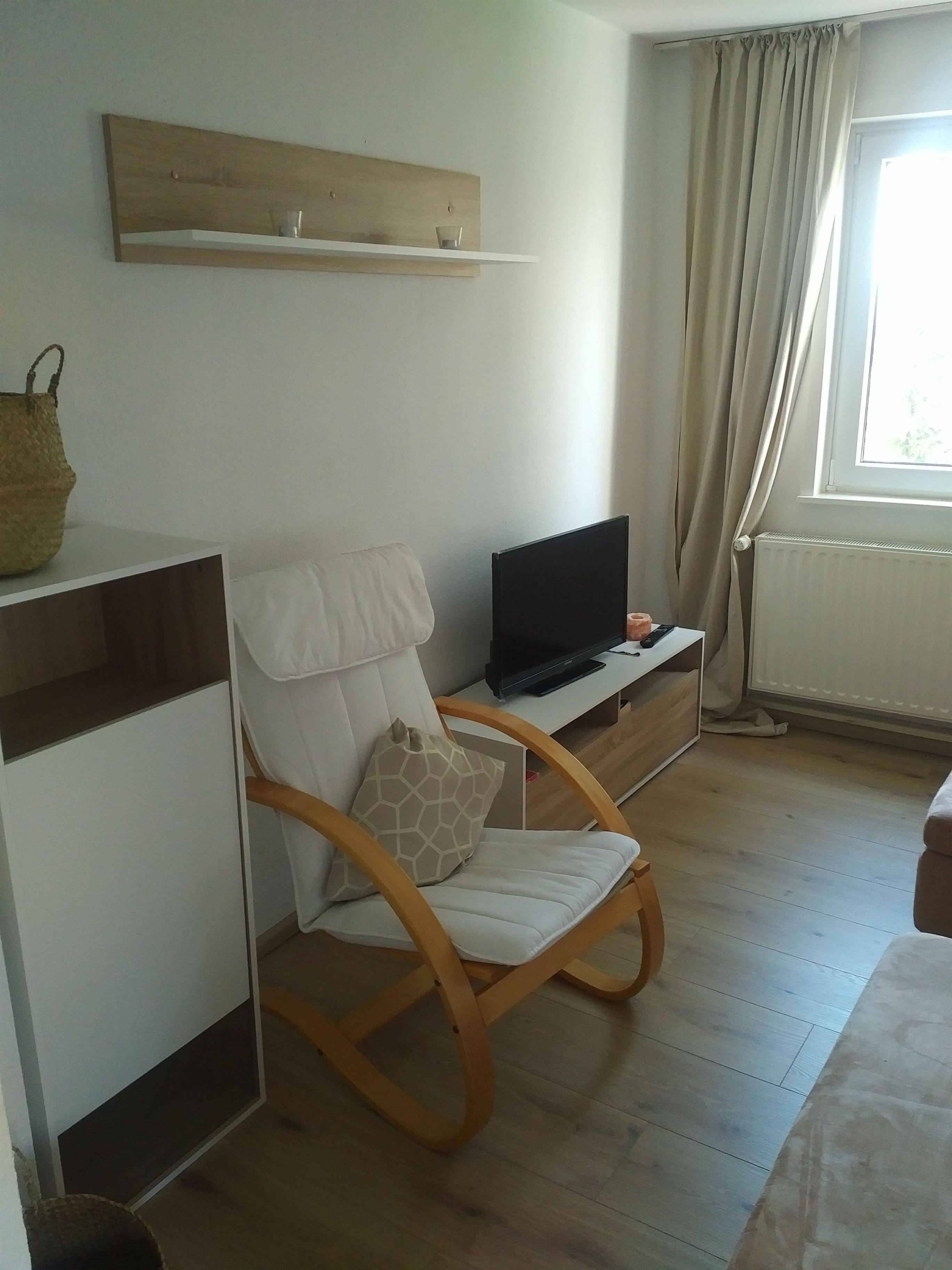 Im Wohnbereich steht Ihnen ein Lounge-Sofa und ein Schwingsessel zum Entspannen und ein moderner Flachbildfernseher zur Verfügung. Das Sofa lässt sich ausziehen und durch den dazugehörigen Hocker schnell in eine weitere Schlafmöglichkeit umfunktionieren. Hierdurch entsteht eine großzügige Liegefläche von ca. 1,40 x 2,00 m.