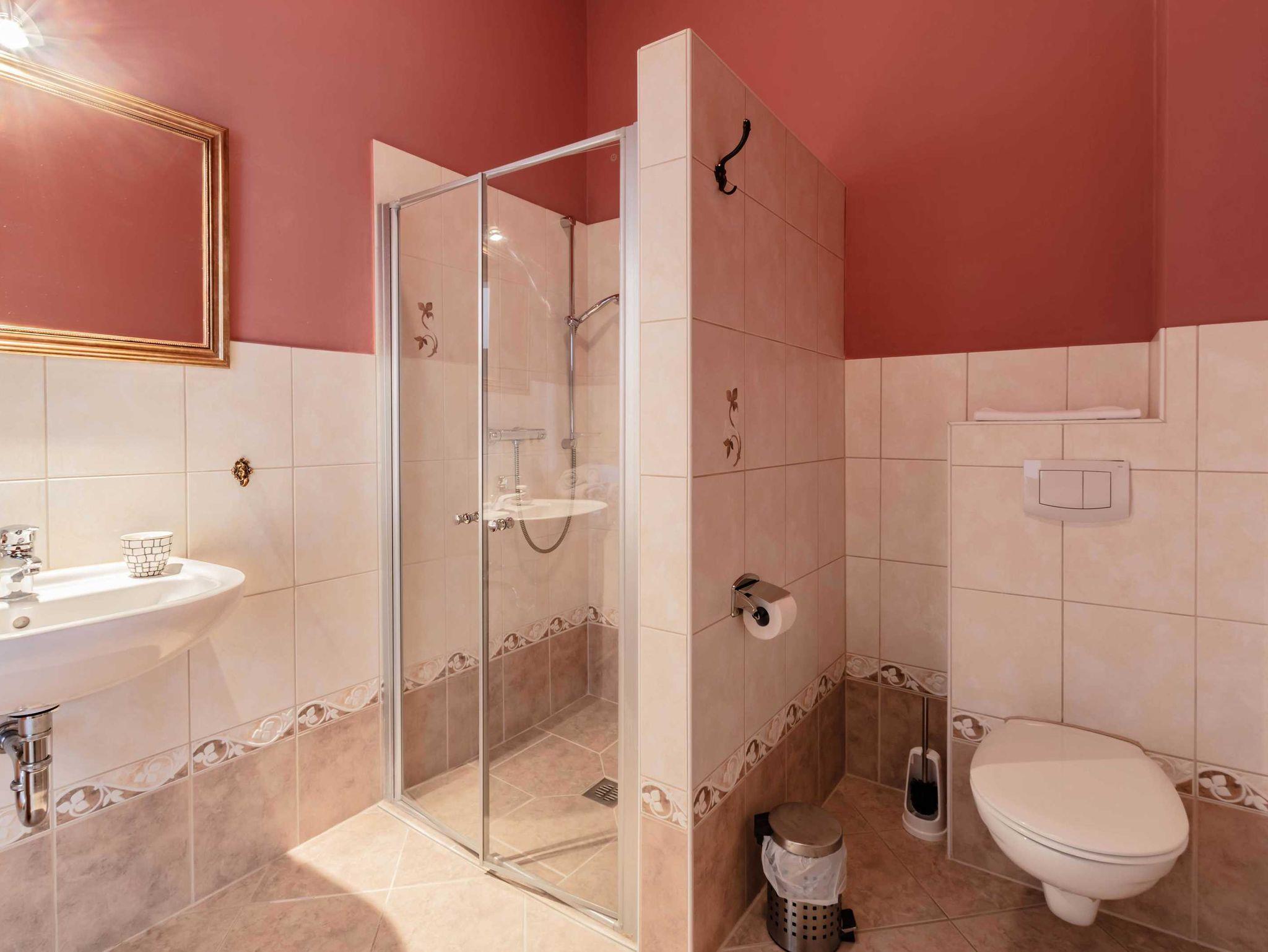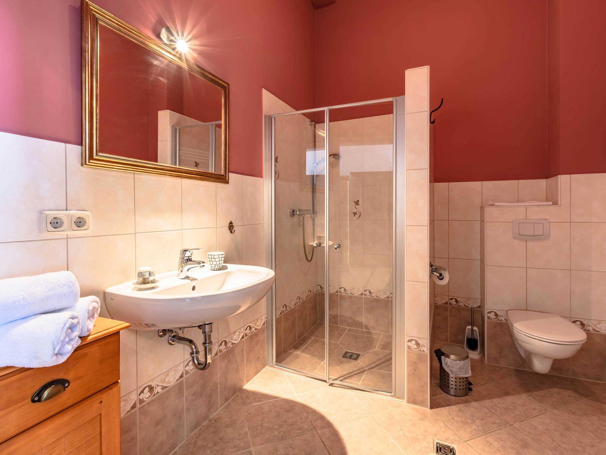 kühlen Tagen ein Kachelofen mollige Wärme spenden. Das Badezimmer ist