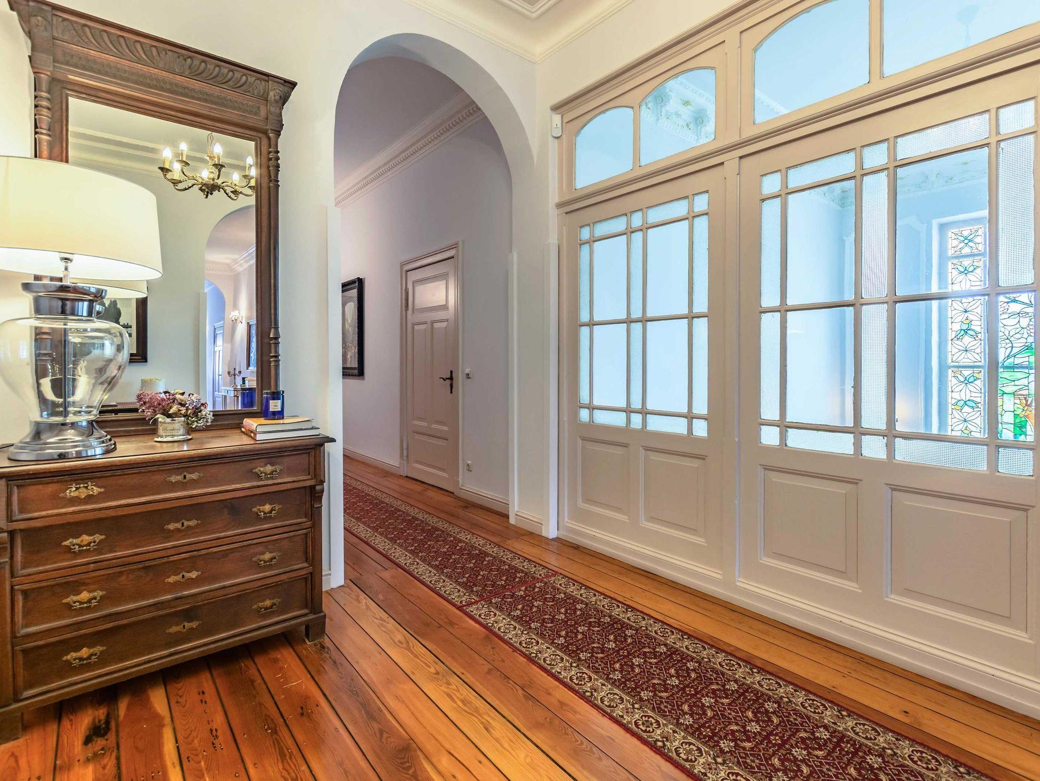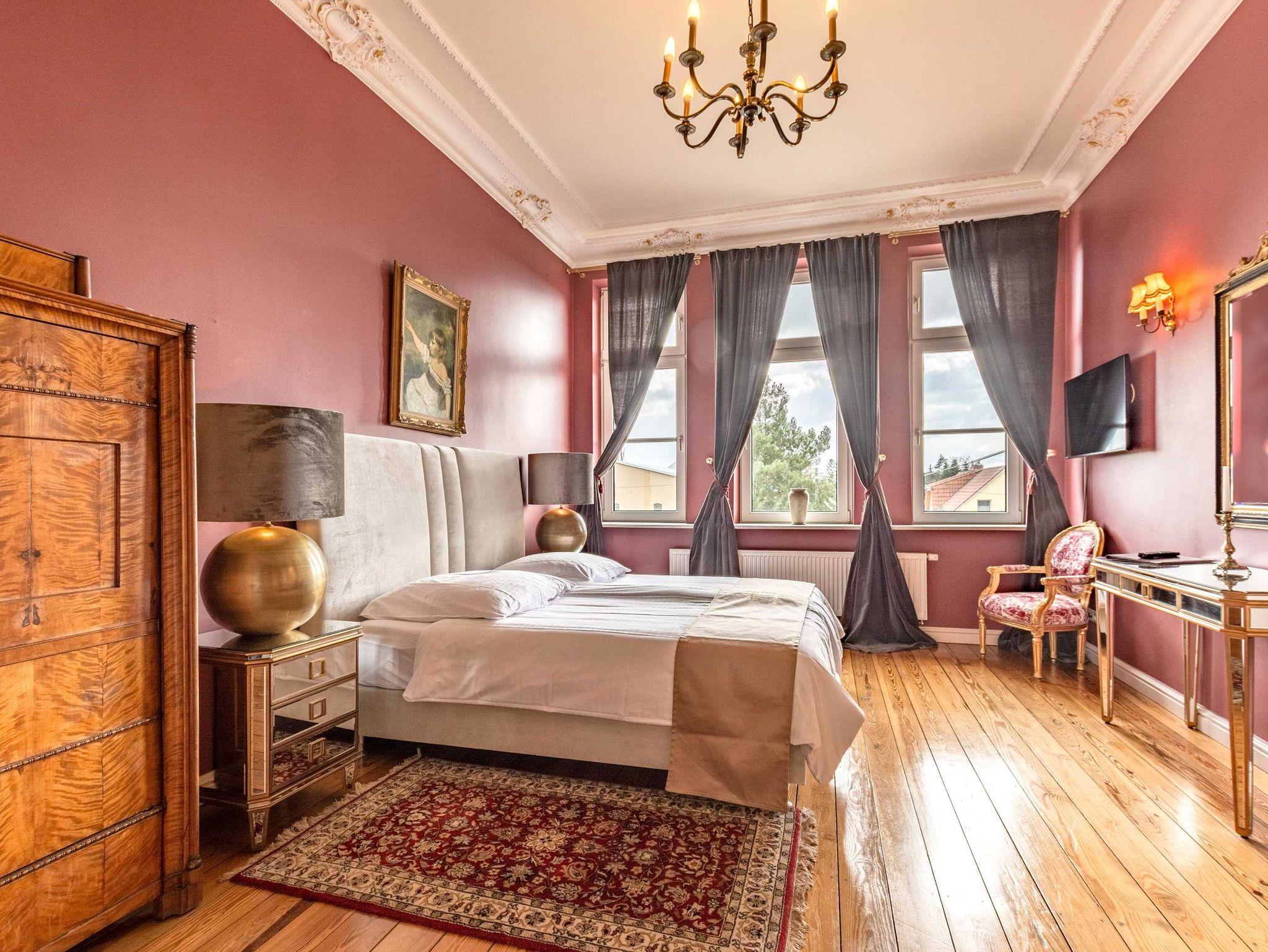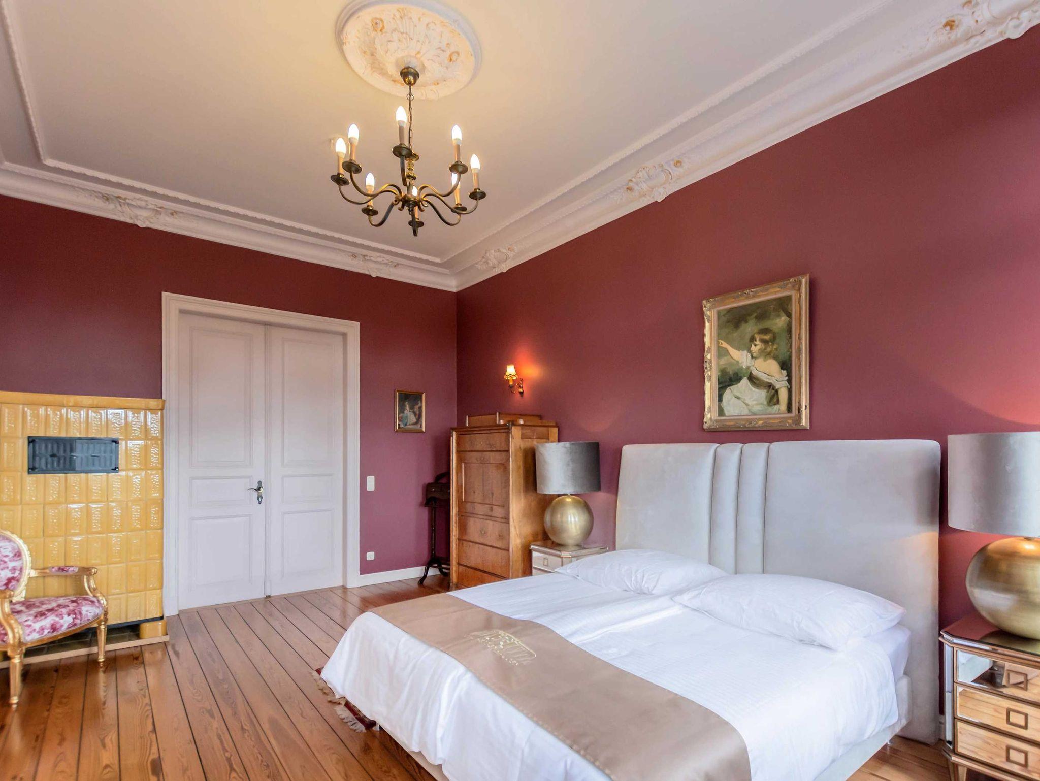 Das mit 34 qm geräumige Zimmer Ludwigslust ist das ehemalige Zimmer des Hausherren und befindet sich in der ersten Etage. Stuckdecken, Kronenleuchter und das passende Ambiente sorgen dafür, dass Gäste sich wie auf Zeitreise fühlen.
