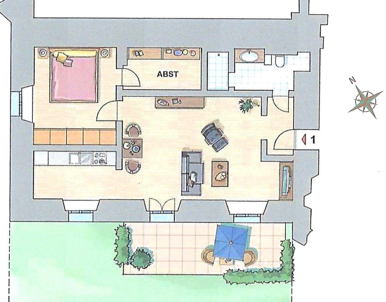 Die Ausstattungsbeschreibung beruht auf Angaben der Eigentümer, Irrtümer und Änderungen bleiben vorbehalten! Der beigefügte Grundriss dient als Skizze – die tatsächliche Möblierung kann leicht abweichend sein.