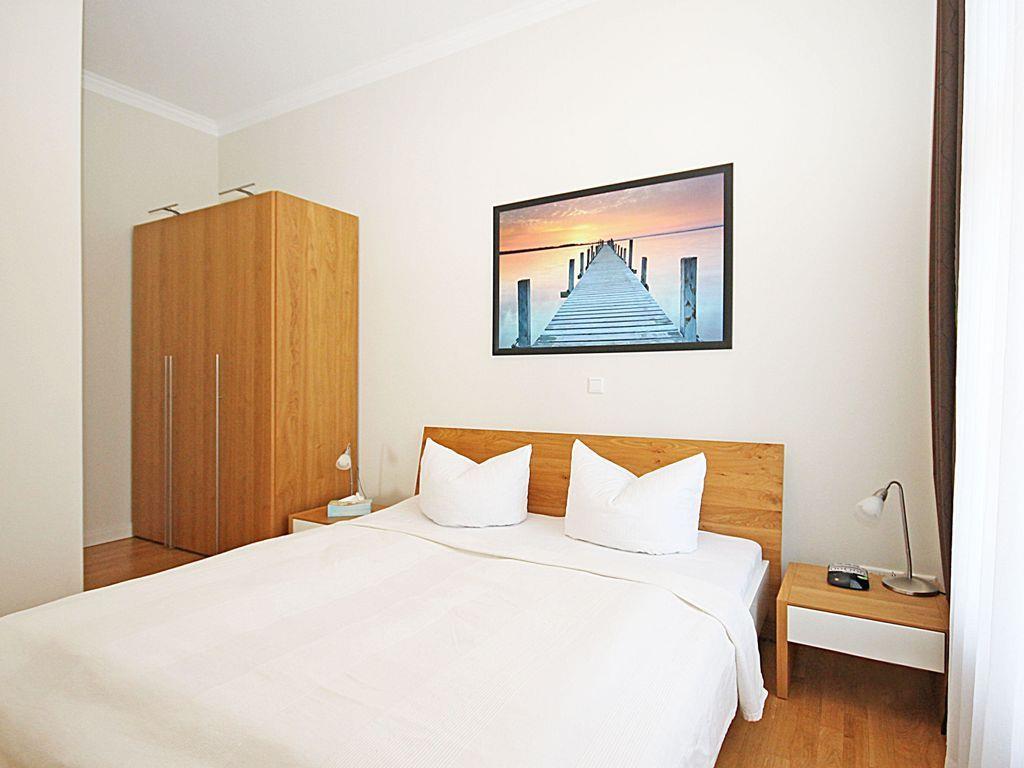 Das freundliche und behagliche Schlafzimmer ist mit einem bequemen Doppelbett, Nachttischen, einem geräumigen Kleiderschrank eingerichtet und bietet ebenfalls direkten Zugang zum Balkon. Eine zusätzliche bequeme Schlafmöglichkeit für eine weitere 3. oder 4. Person bietet die ausziehbare Schlafcouch im Wohnzimmer.