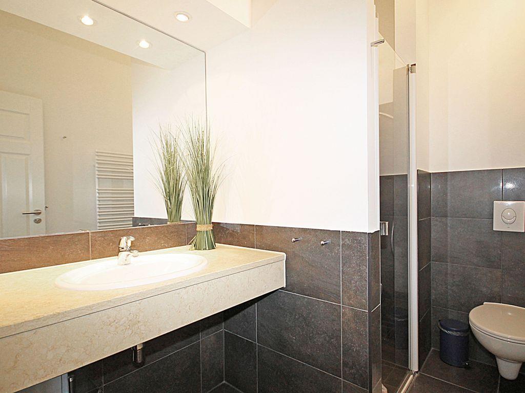 Das moderne Badezimmer verfügt über eine begehbare, ebenerdige und somit auch seniorenfreundliche Dusche mit Echtglastür, einen Waschtisch mit großem Wandspiegel, WC, Handtuch-Heizkörper sowie ausreichend Ablagemöglichkeiten.