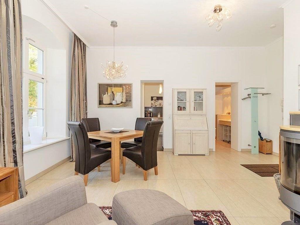 Das gemütliche und großzügige Wohn-/Esszimmer verfügt über eine separate Sitzgruppe mit bequemer (und ausziehbaren Schlaf-) Couch, Lesesessel mit Hocker, Couchtisch, einen separaten Esstisch mit 4 Stühlen, 2 Sideboards sowie eine große Vitrine. Die Gemütlichkeit des Wohnbereiches wird durch den vorhandenen Kaminofen abgerundet. Vom Wohnzimmer aus haben Sie direkten Zugang zu der ca. 8 m² großen Terrasse (nach Nord-Osten ausgerichtet) mit Gartenmöbeln. Hier sitzen Sie entspannt und gemütlich mit Blick ins Grüne und können abends bei einem guten Glas Wein in Ruhe die lauen Sommernächte genießen!