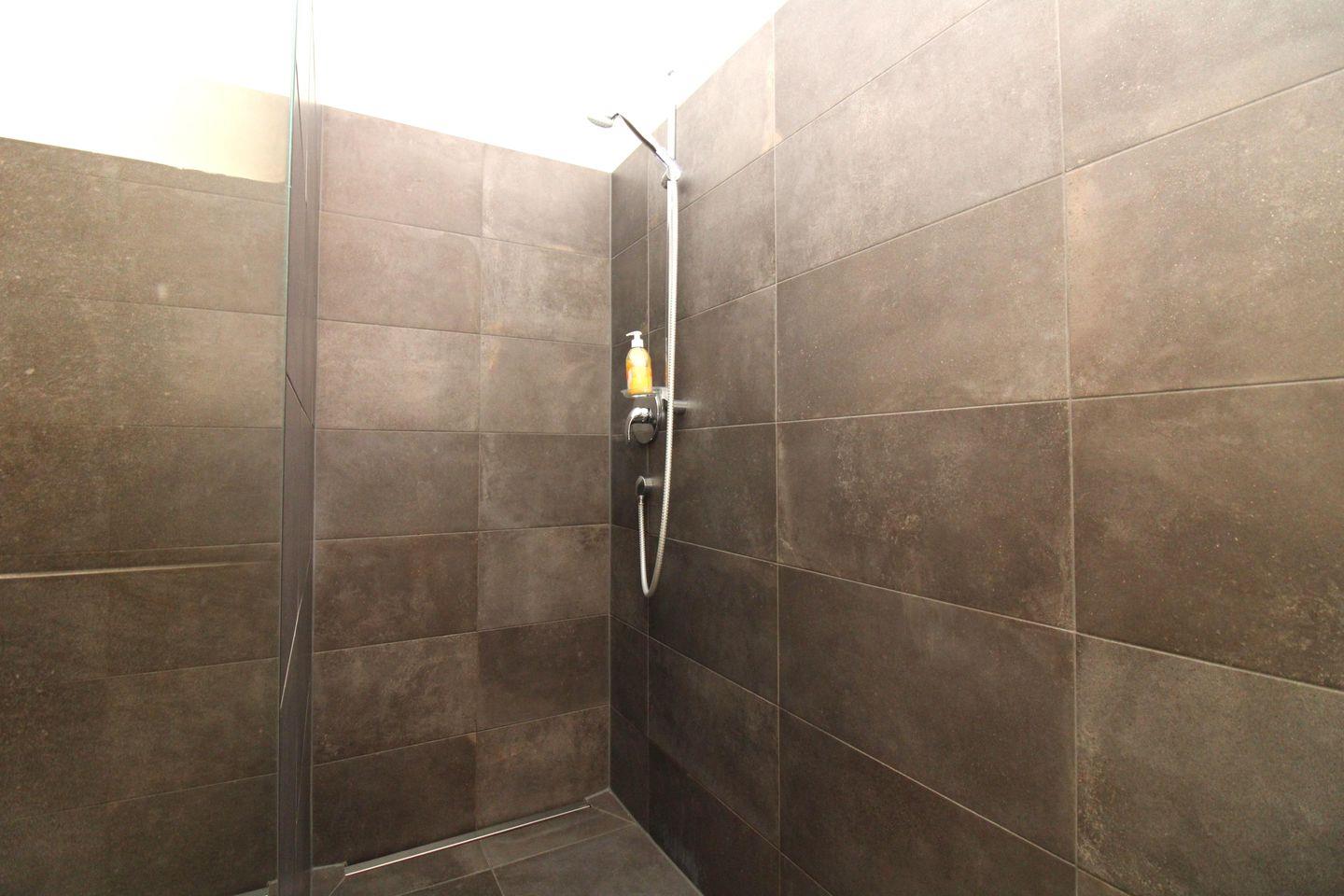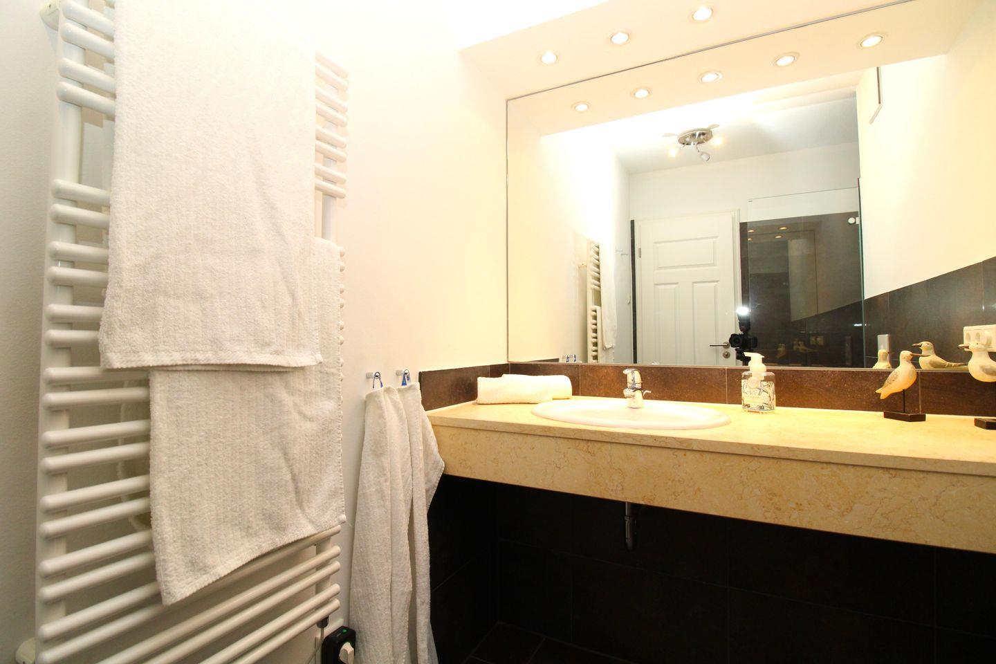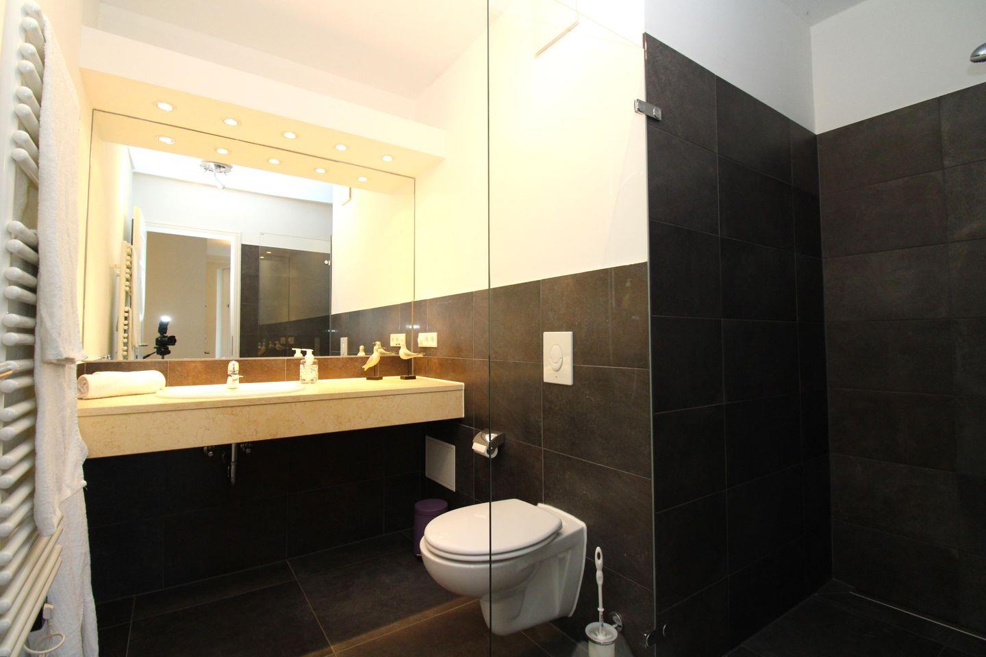 Das moderne Badezimmer verfügt über eine begehbare, ebenerdige und somit auch seniorenfreundliche Dusche mit Echtglas-Trennwand, einen Waschtisch mit großem Wandspiegel, Handtuch-Heizkörper, Föhn sowie ausreichend Ablagemöglichkeiten.