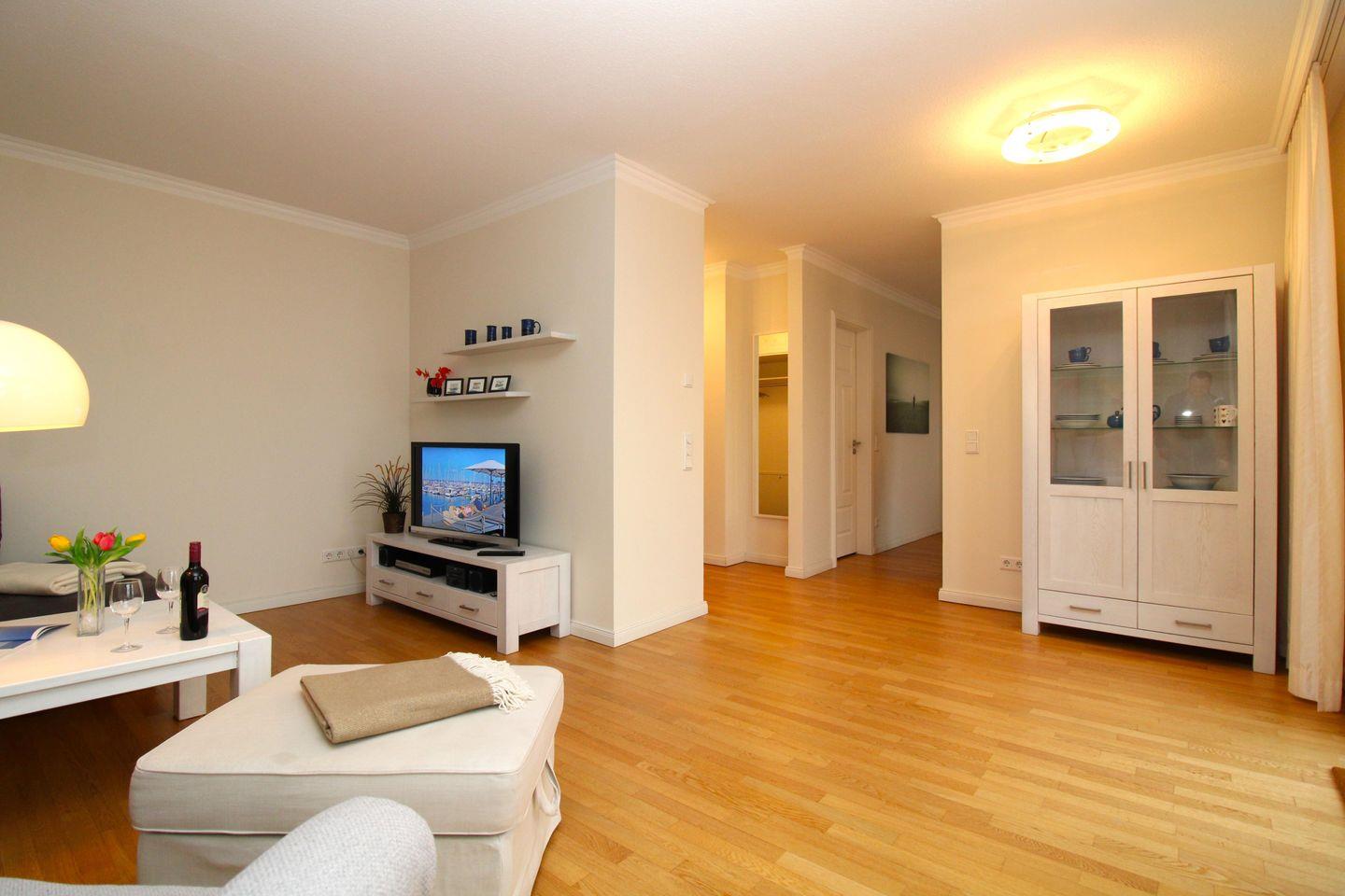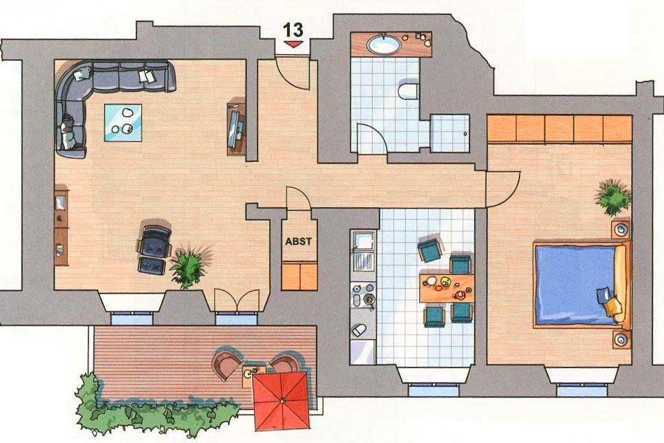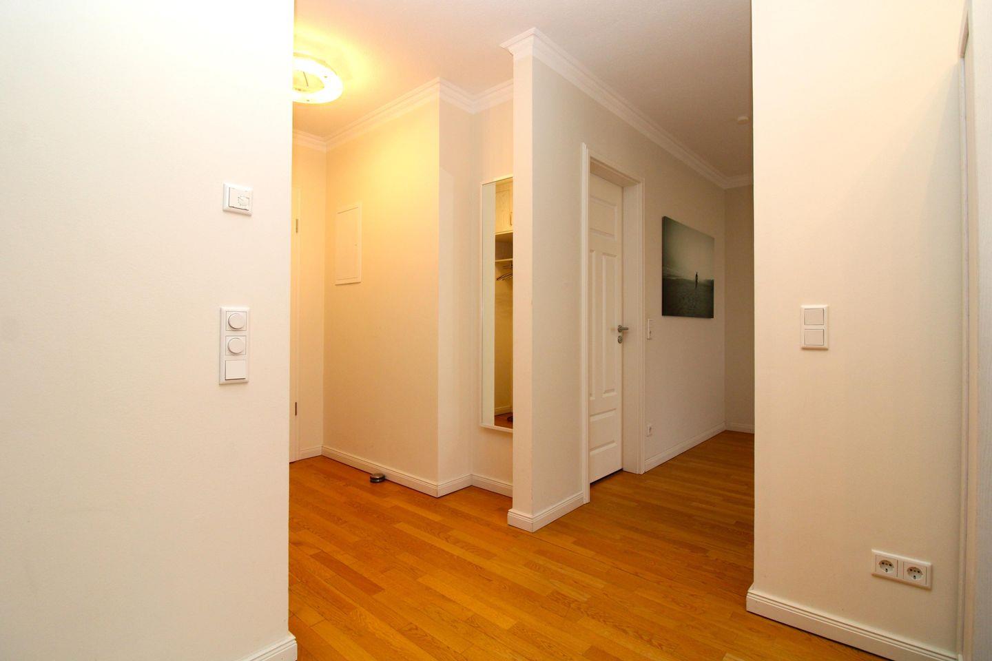 Von der großzügigen Diele mit Garderobe, geräumigen Einbauschränken (mit viel Stauraum) und großem Wandspiegel erreichen Sie bequem alle Räume Ihrer Ferienwohnung.