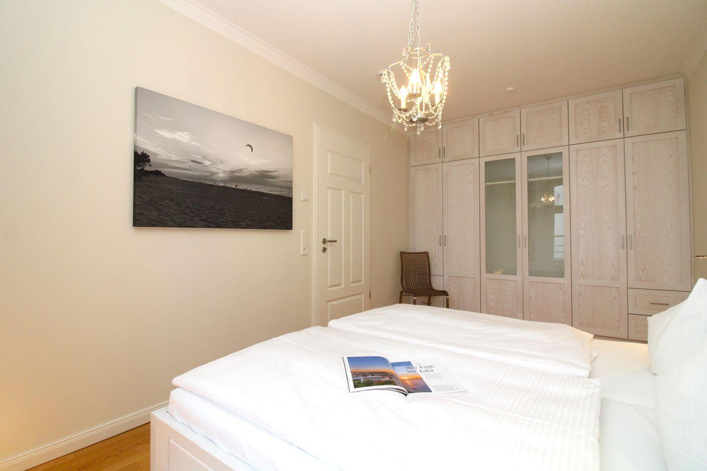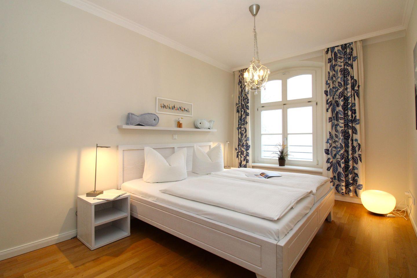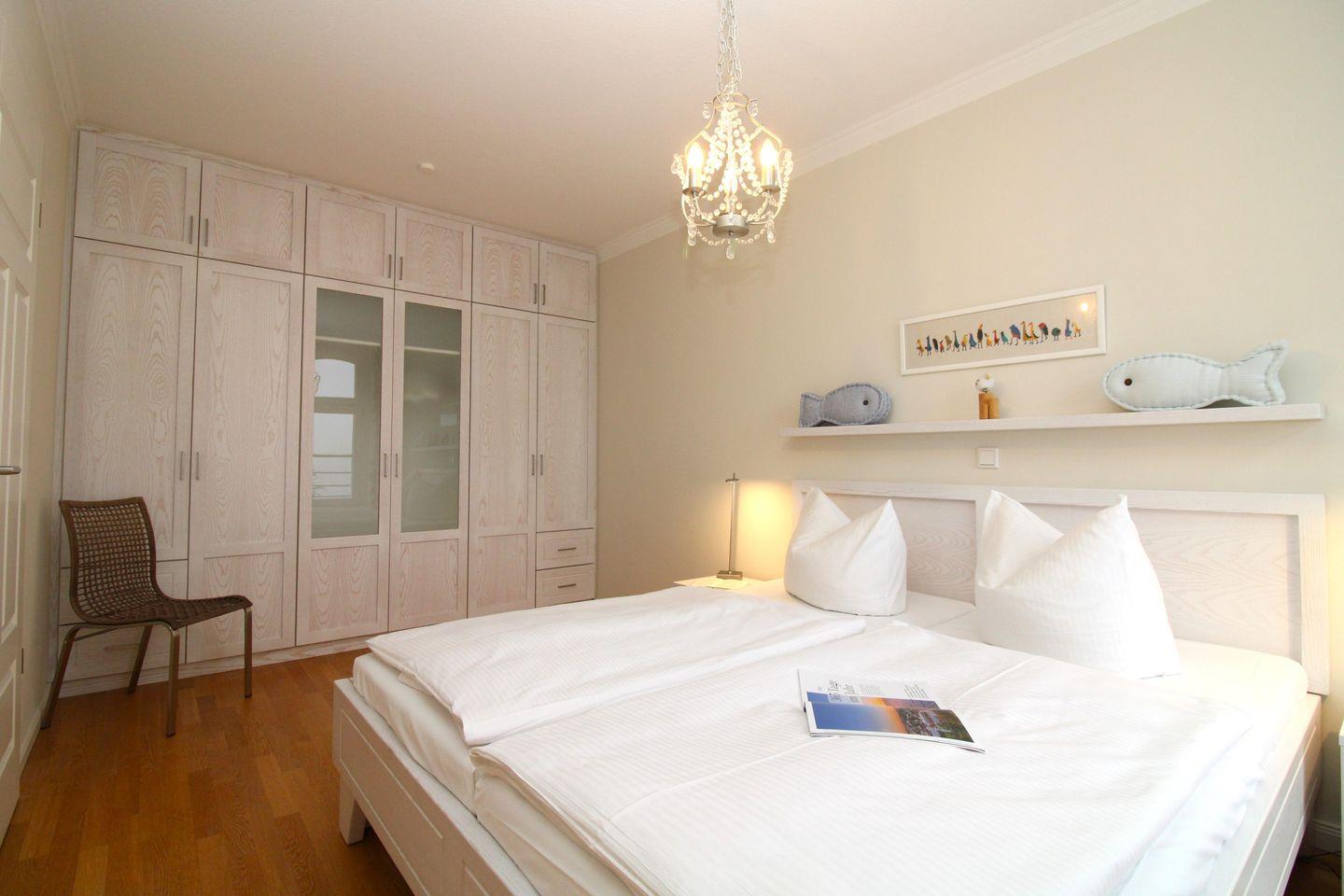 Das gemütliche und geräumige Schlafzimmer ist mit einem bequemen Doppelbett, Nachttischen sowie einem sehr großen und geräumigen Kleiderschrank eingerichtet. Zusätzliche Verdunkelungsvorhänge an den Fenstern ermöglichen eine ungestörte Nachtruhe.