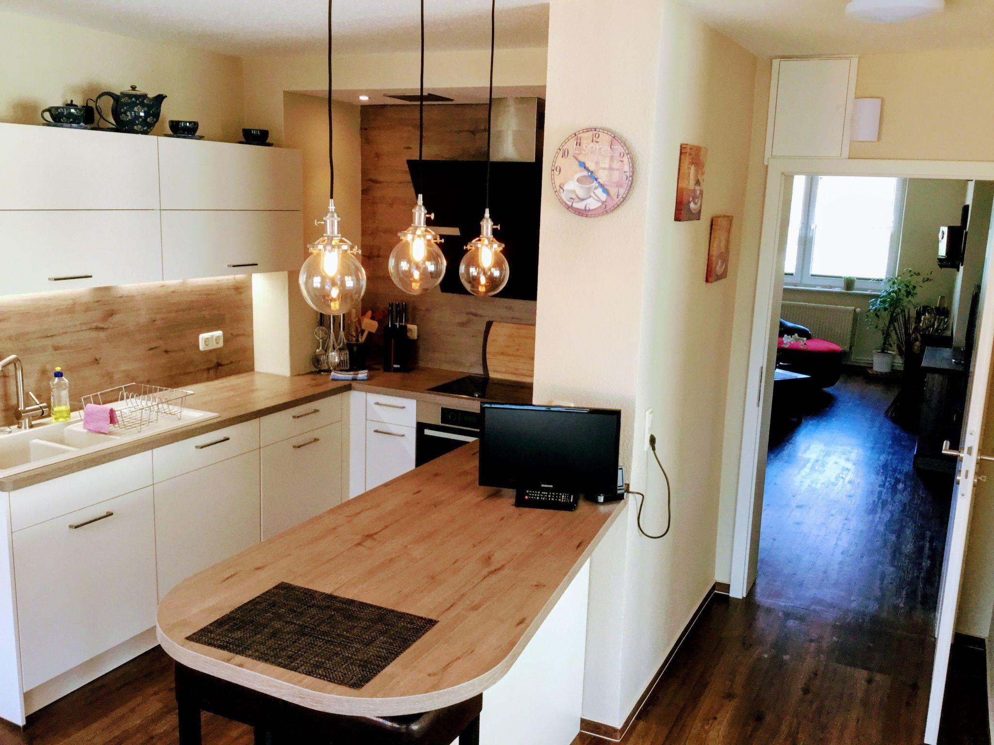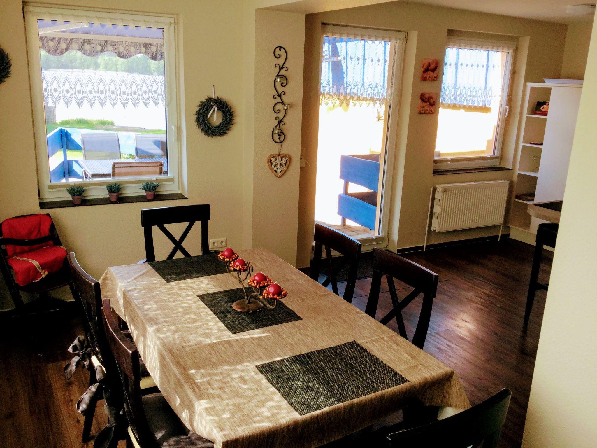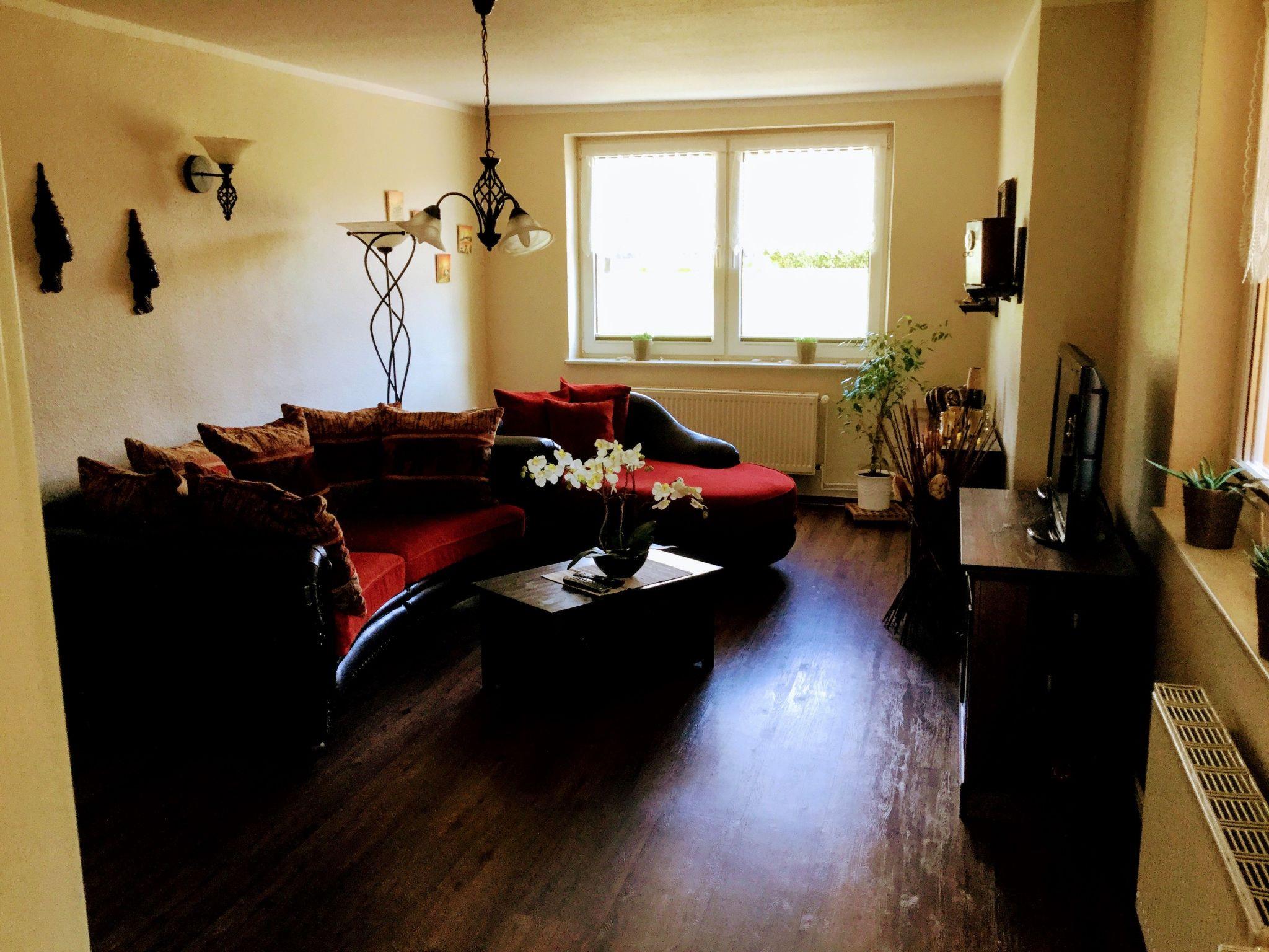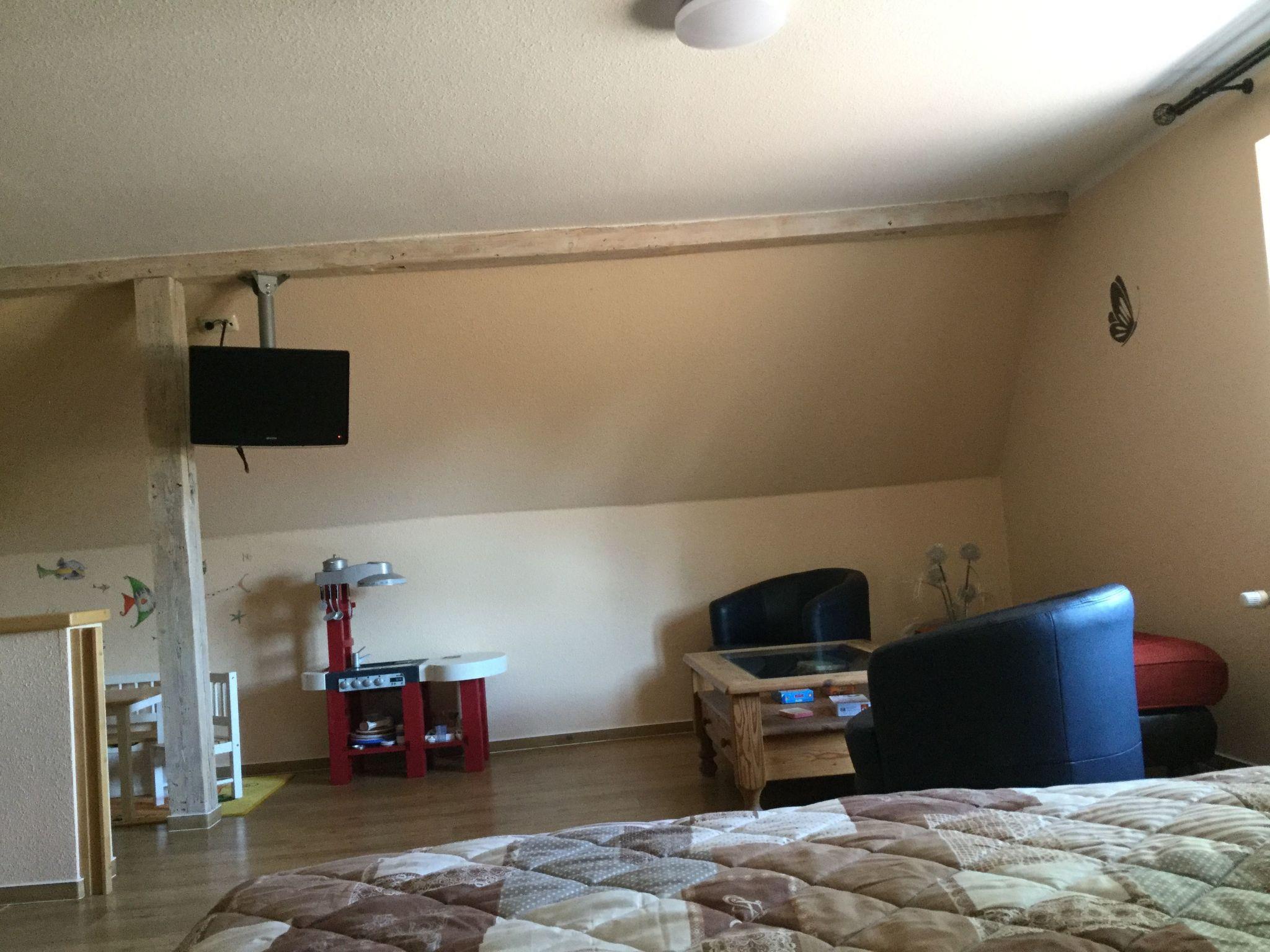 An oasis of well-being has been created on over 100 m² over two floors. On the first floor you will find the kitchen, the living room with fireplace corner, a large dining room with couch and TV, a bedroom with TV and a full bathroom en suite. On the second open-plan floor there is an additional sleeping area (only suitable for children) with a double bed, an extra bed and a cot. There is also a small TV corner with sofa and armchairs and a small bathroom with WC and washbasin. There are plenty of toys for our younger guests in the large children's play corner. After a long day at the beach or at the Baltic Sea or with countless impressions of the city, you can relax in the large living room on our 'Lümmel Couch' with a novel or a good film, in the cold season in front of the fireplace (satellite TV and DVD player available). If you like cooking, our fully equipped kitchen makes it a breeze. From the cooker to the microwave, blender and coffee machine, everything you need to serve a delicious breakfast, lunch or dinner in the dining area overlooking the lake.