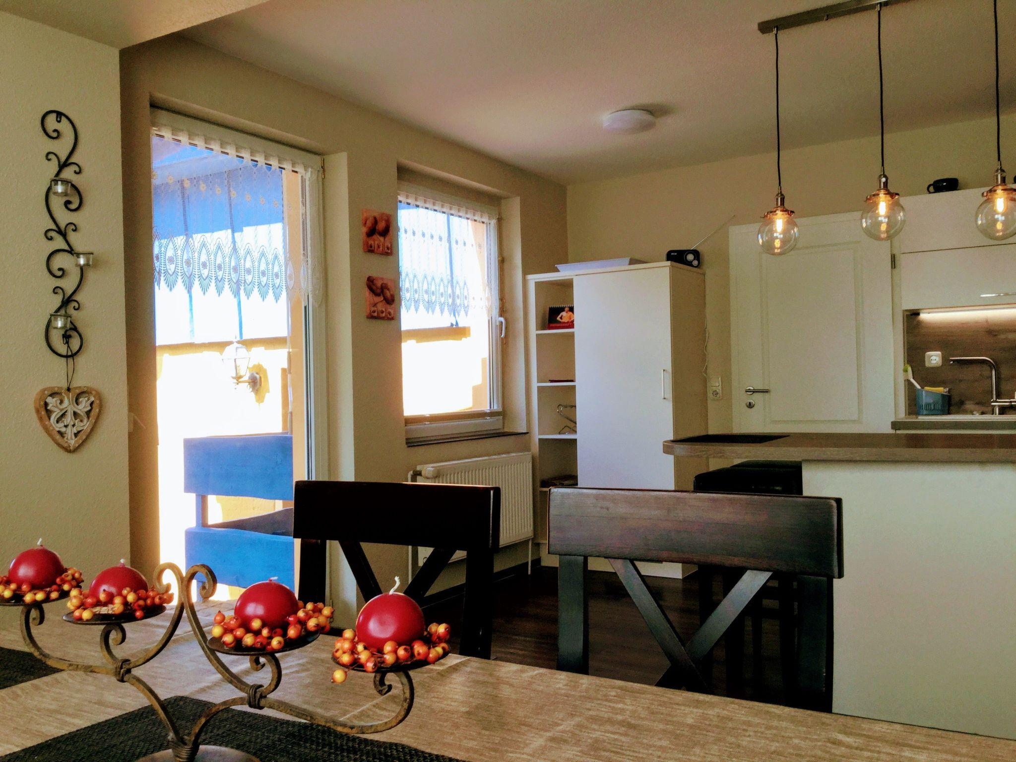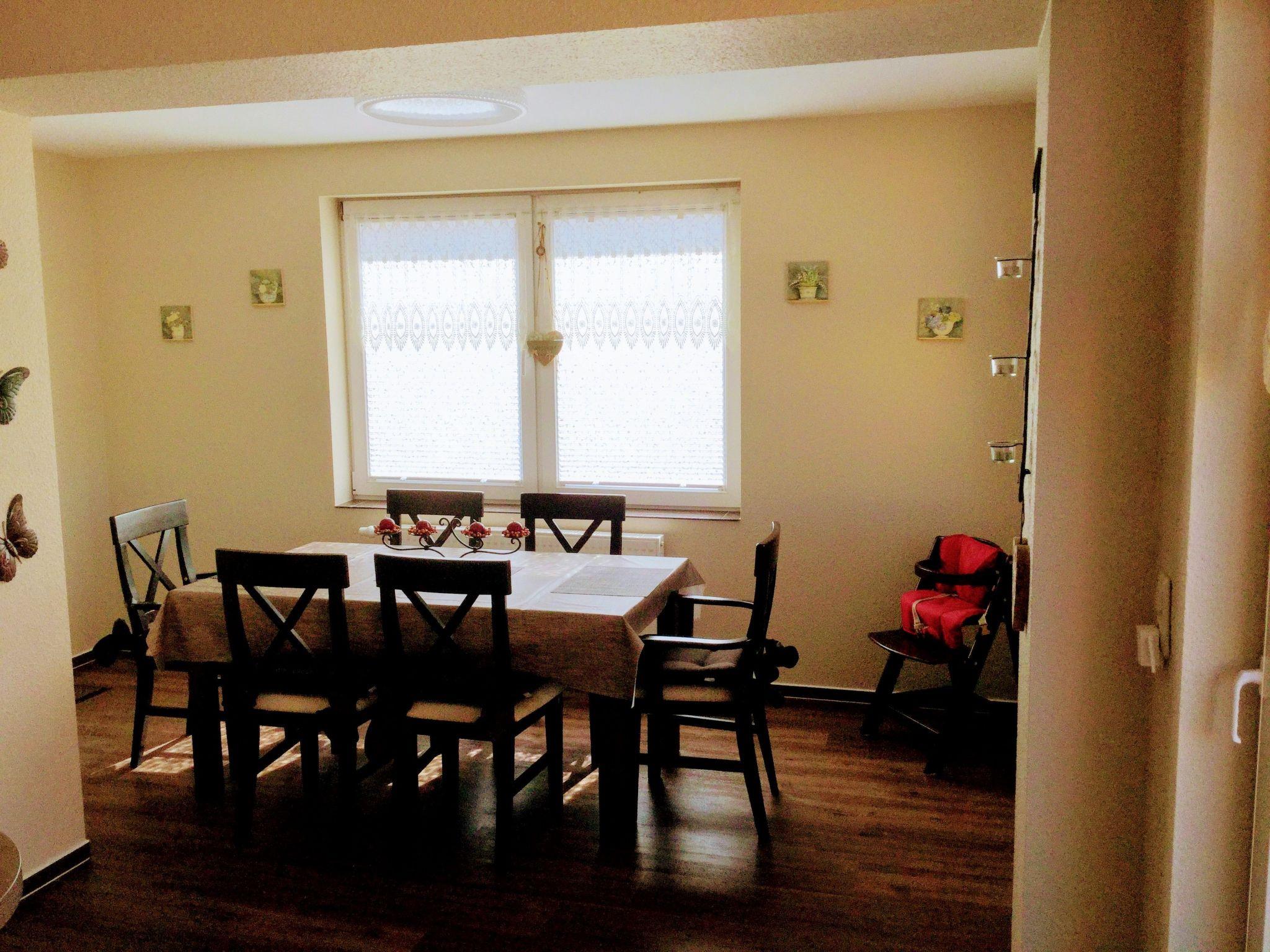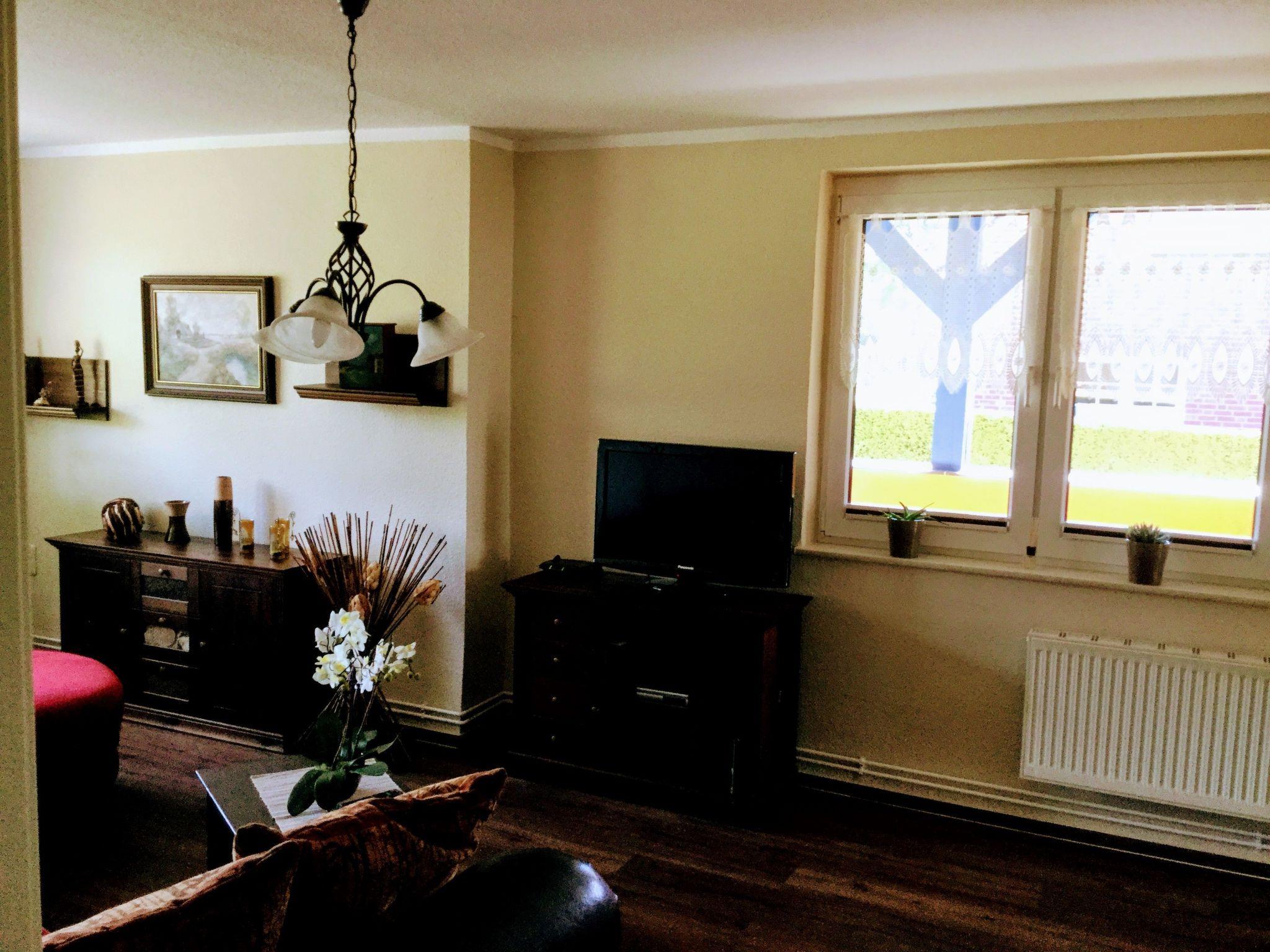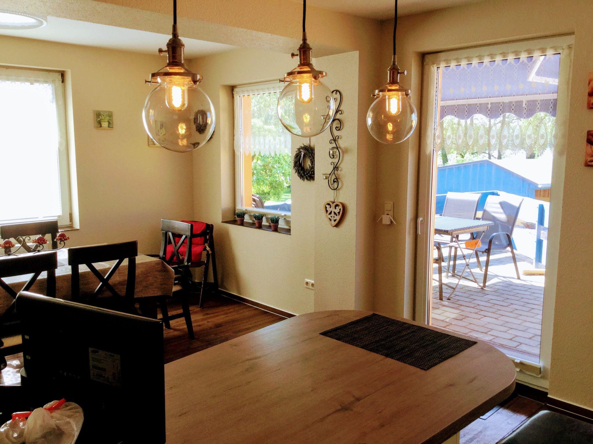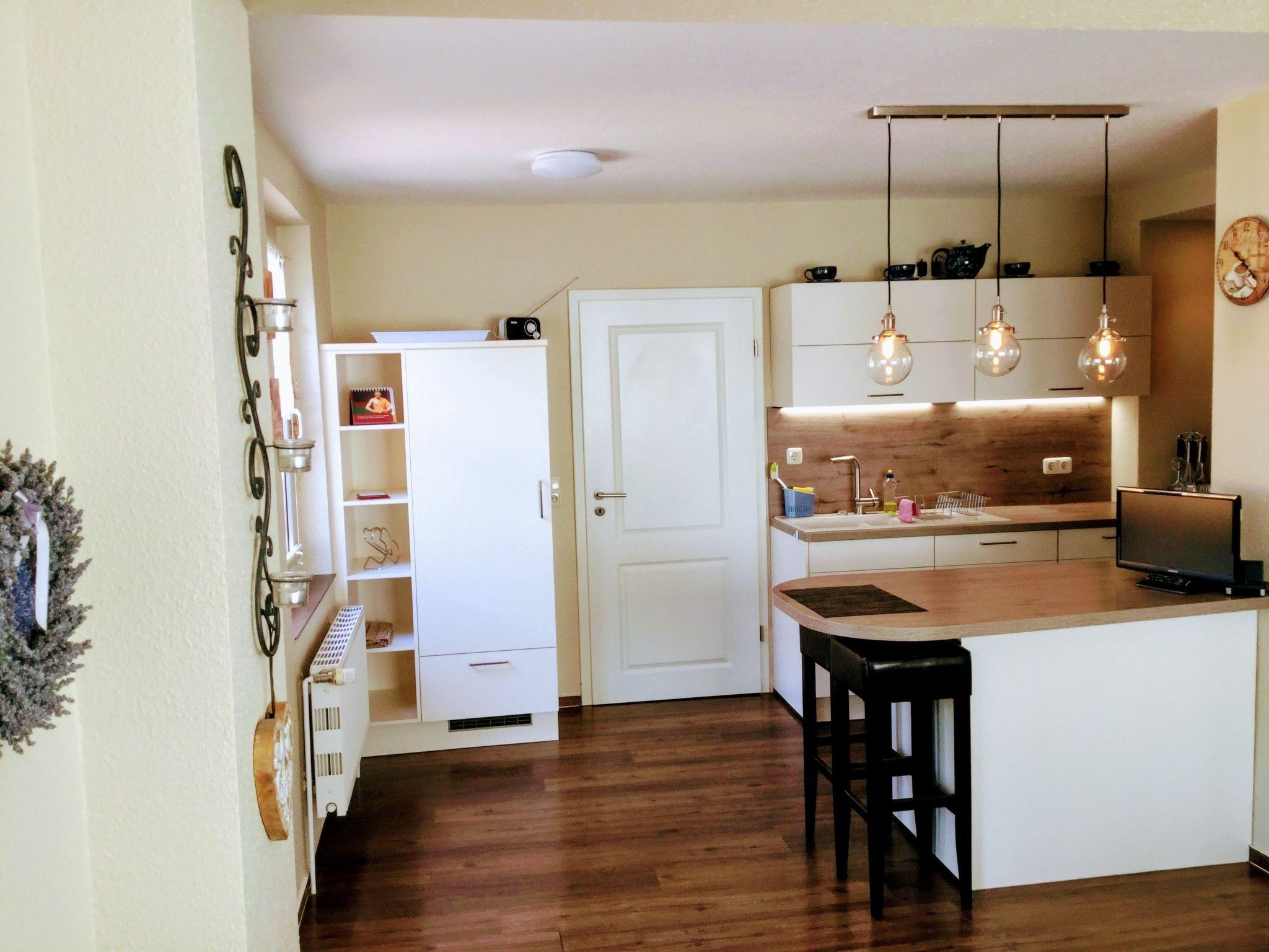 An oasis of well-being has been created on over 100 m² over two floors. On the first floor you will find the kitchen, the living room with fireplace corner, a large dining room with couch and TV, a bedroom with TV and a full bathroom en suite. On the second open-plan floor there is an additional sleeping area (only suitable for children) with a double bed, an extra bed and a cot. There is also a small TV corner with sofa and armchairs and a small bathroom with WC and washbasin. There are plenty of toys for our younger guests in the large children's play corner. After a long day at the beach or at the Baltic Sea or with countless impressions of the city, you can relax in the large living room on our 'Lümmel Couch' with a novel or a good film, in the cold season in front of the fireplace (satellite TV and DVD player available). If you like cooking, our fully equipped kitchen makes it a breeze. From the cooker to the microwave, blender and coffee machine, everything you need to serve a delicious breakfast, lunch or dinner in the dining area overlooking the lake.
