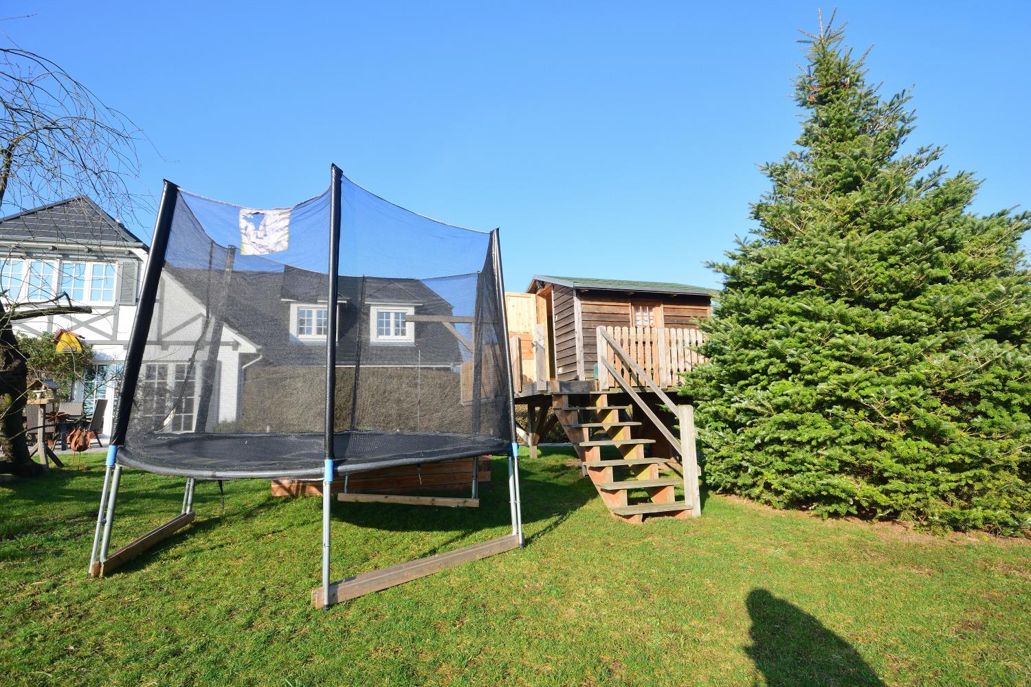 Vor dem Haus befindet sich ein Sitzbereich auf einer kleinen Wiese. Ein Grill, Gartenmöbel, Sonnenliegen und ein Sonnenschirm sind vorhanden. Im Garten können sich die kleinen Gäste auf dem Trampolin oder im Baumhaus austoben. Ihren PKW können Sie direkt vor dem Haus parken. Ein abschließbarer Raum für Fahrräder ist vorhanden.