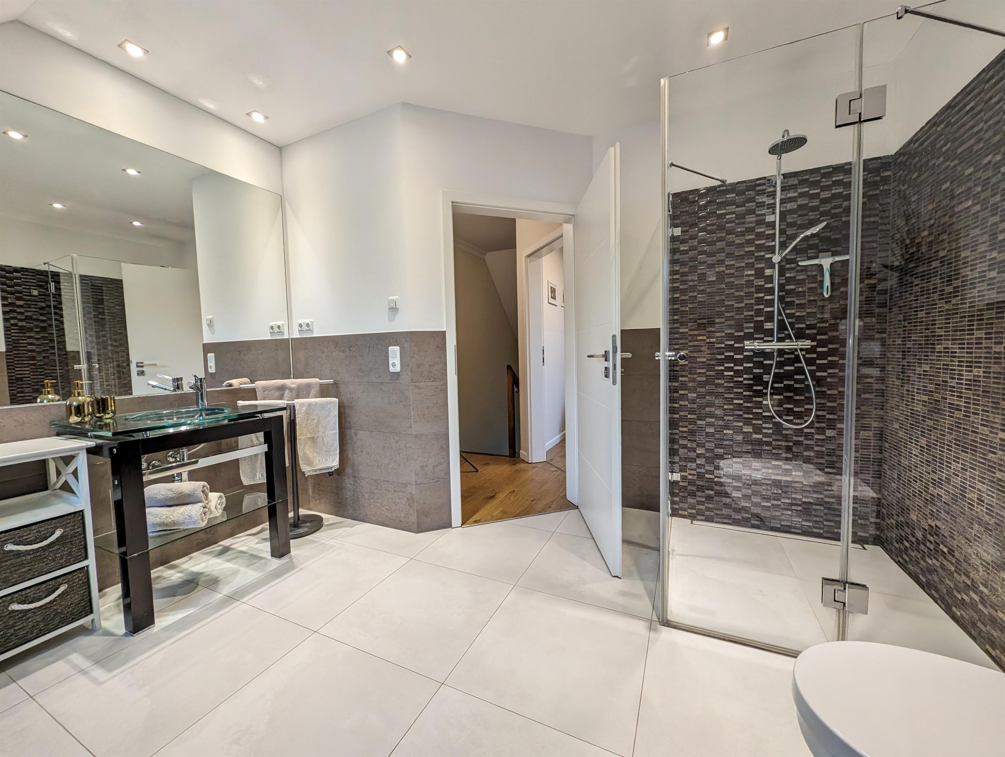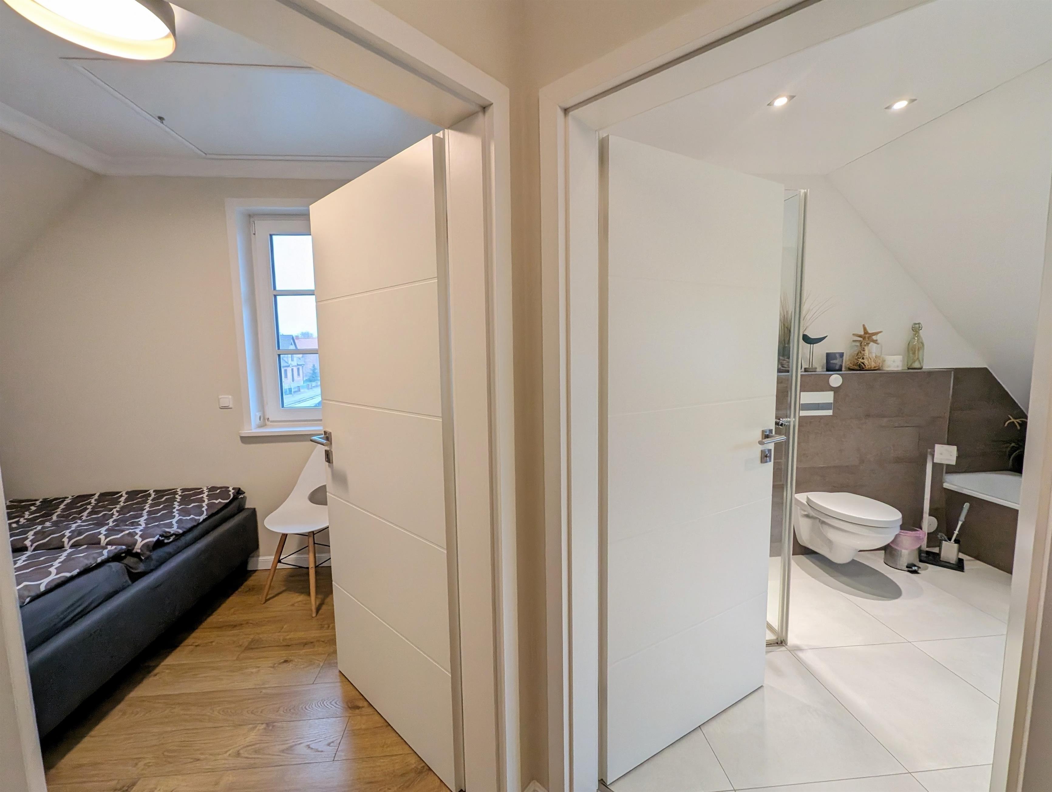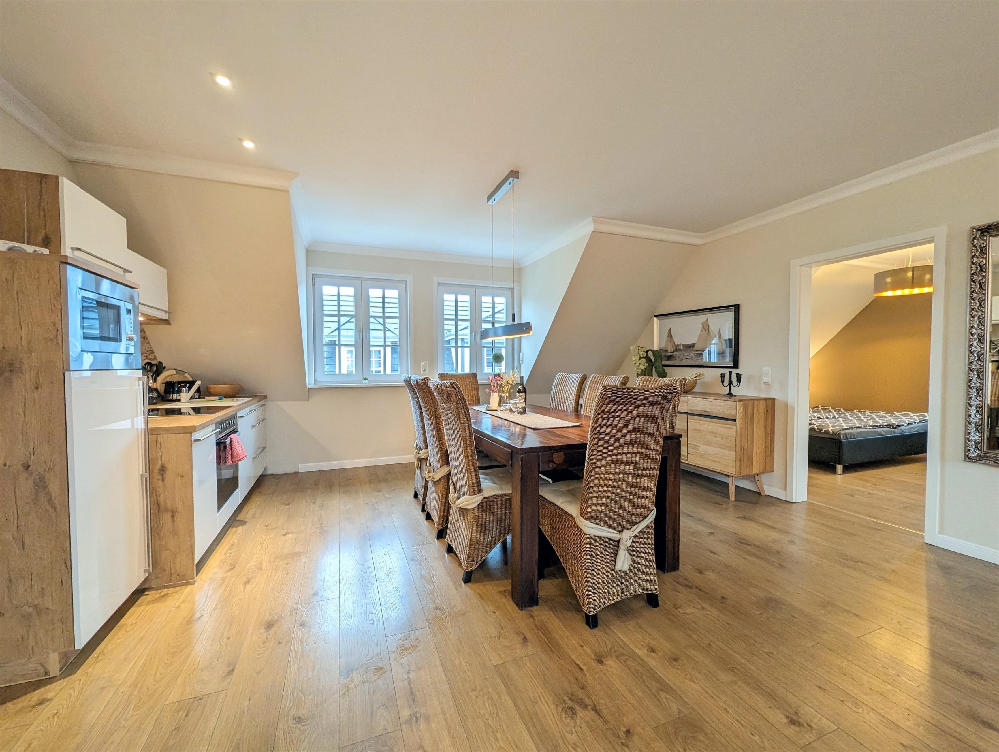 In dieser Wohnung finden Sie eine stilvolle Ausstattung und hohen Wohnkomfort. Auf 120 m² bietet die Wohnung bis zu 6 Personen ausreichend Raum für einen erholsamen Urlaub. Der große Wohnbereich, mit Sofalandschaft, voll ausgestatteter Küchenzeile und Essbereich, lädt zum Verweilen mit der Familie oder Freunden ein. Insgesamt verfügt die Wohnung über drei Schlafzimmer mir je einem Doppelbett. Im großzügigen und modernen Badezimmer finden Sie eine Badewanne, eine separate Dusche, einen Waschbereich und eine Waschmaschine. Im Erdgeschoss befindet sich zudem ein Gäste WC zur Mitnutzung. Beheizt wird die gesamte Wohnung über eine Fußbodenheizung. An allen Fenstern befinden sich elektrische Rolläden. WLAN ist im gesamten Haus kostenlos vorhanden. Die Wohnung liegt in der 1. Etage. Im Erdgeschoss befindet sich nur eine Garage.