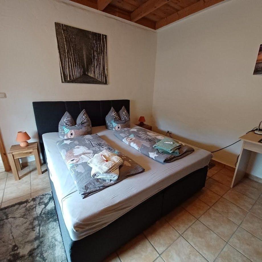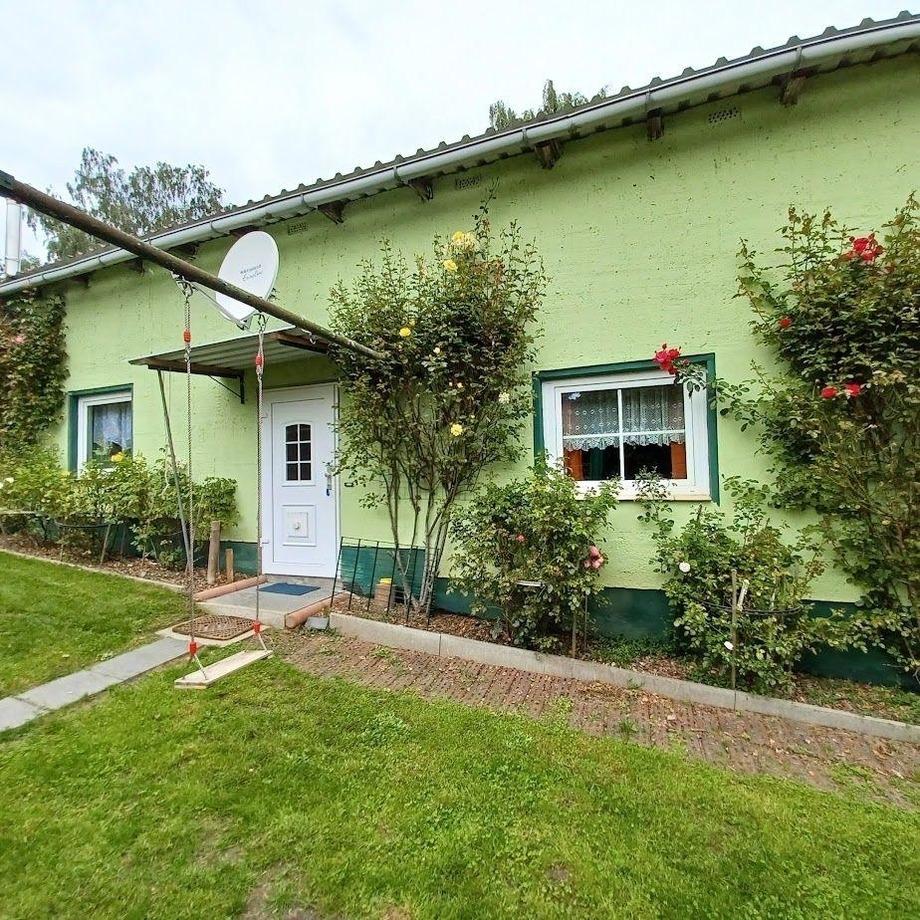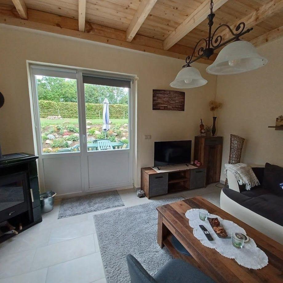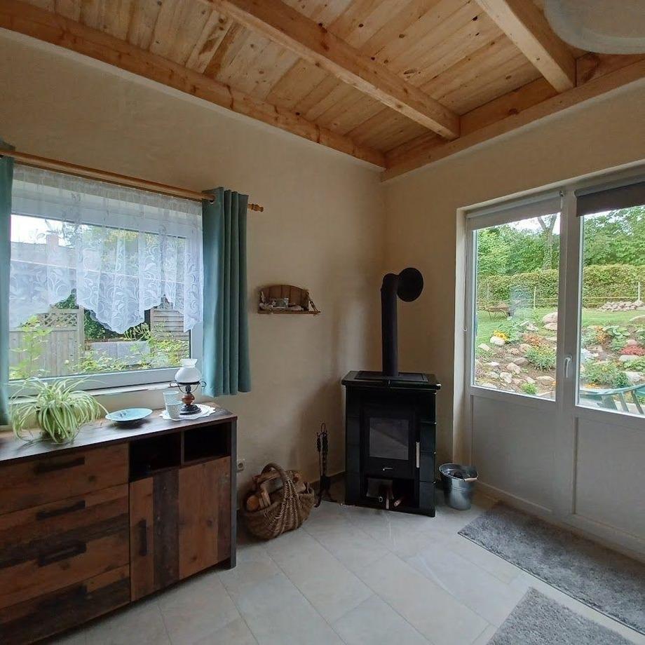 Ferienhaus mit Wohnzimmer mit evtl. Aufbettung, gr. Schlafzimmer, Küche mit Eßtisch, Bad und große Terasse. Kaminofen. WLAN, Netflix, Bettwäsche u. Handtücher kostenfrei.